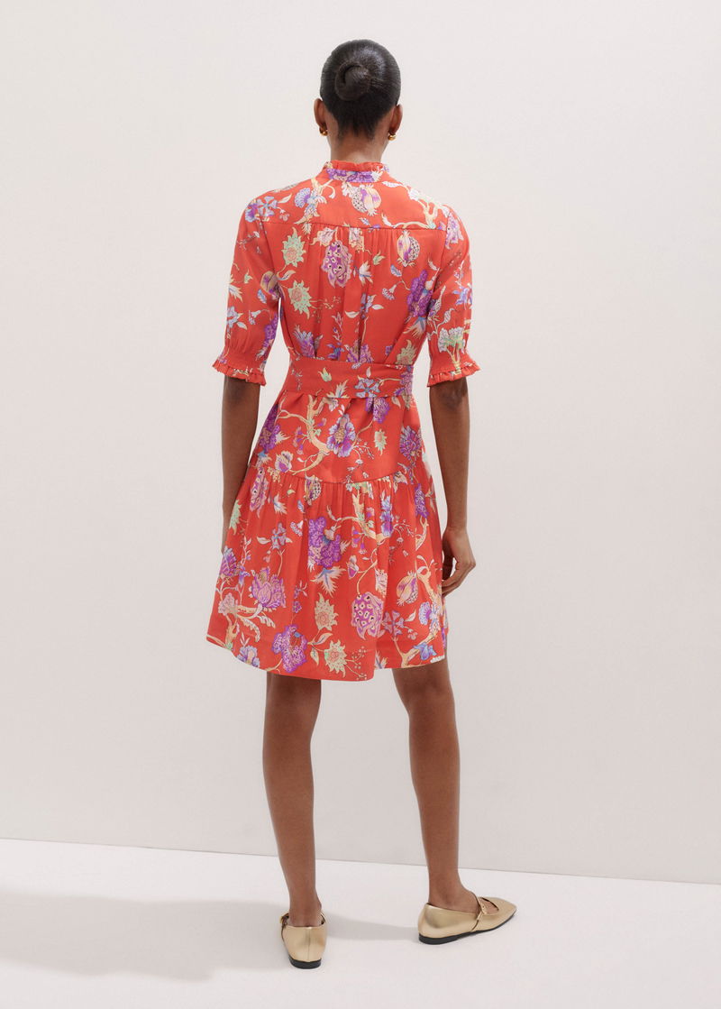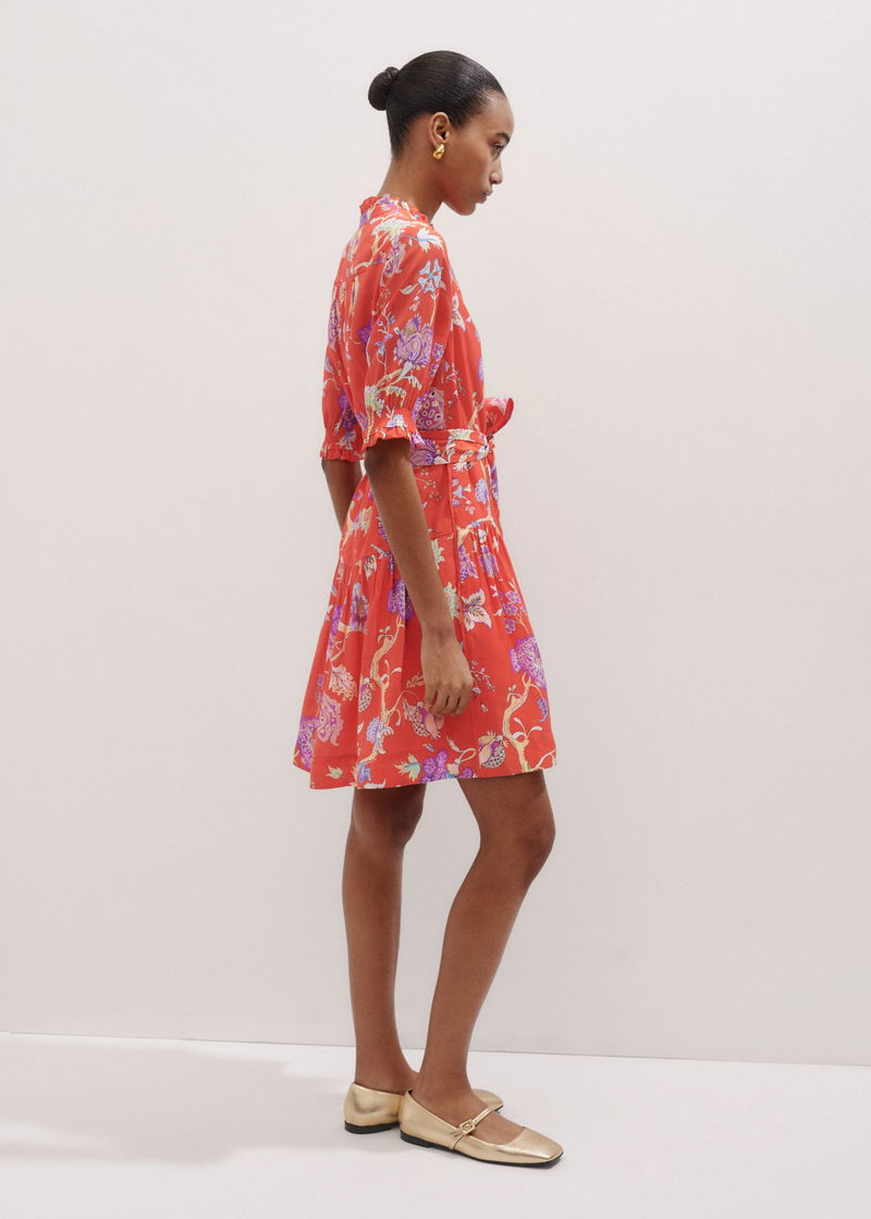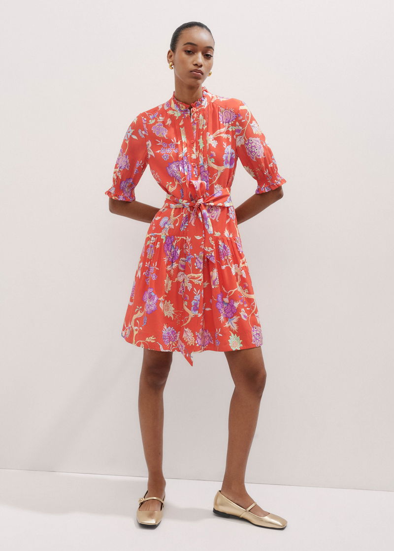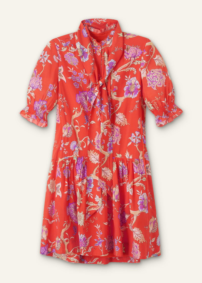 Floral Garden Print Short Swing Dress + Tie Papaya Orange/Iris/Multi
