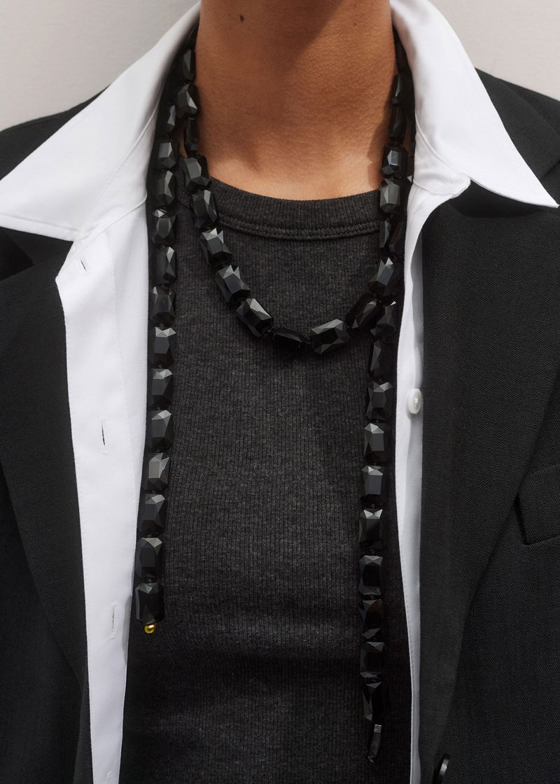 ME+EM's Black Beaded Lariat Necklace can be worn loose or knotted around the neckline to add a statement edge to your look.