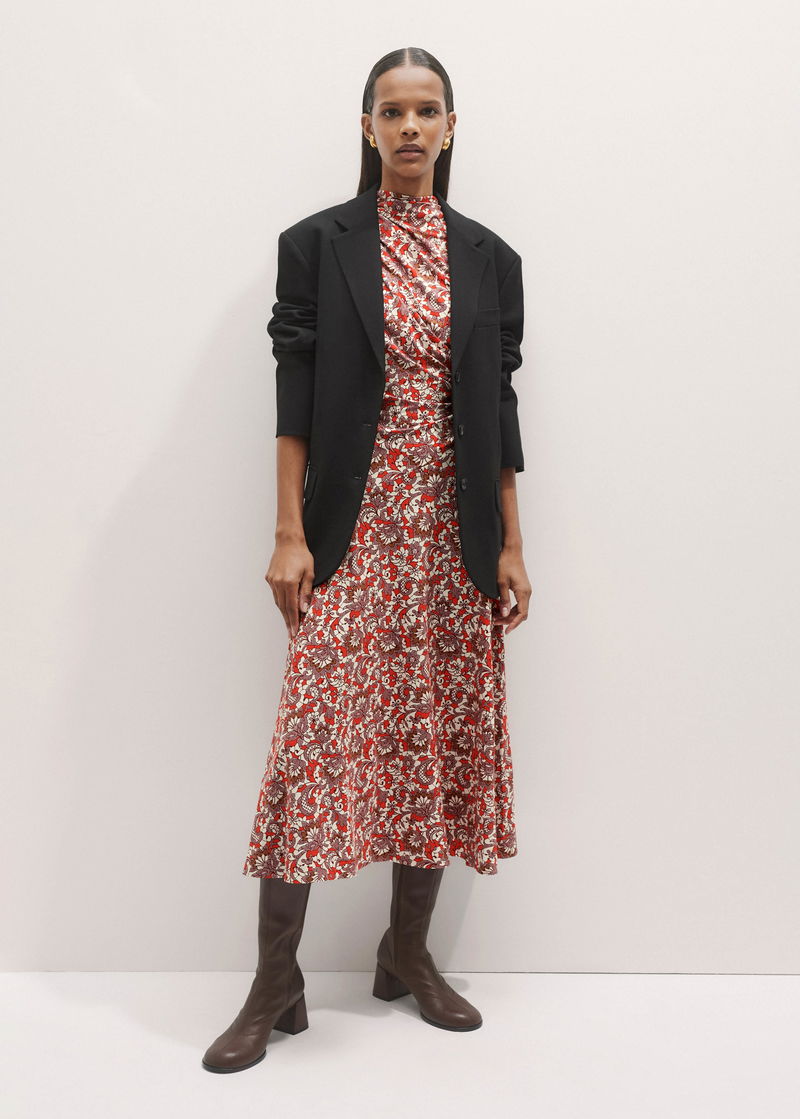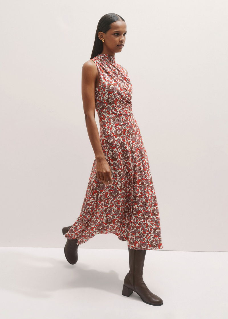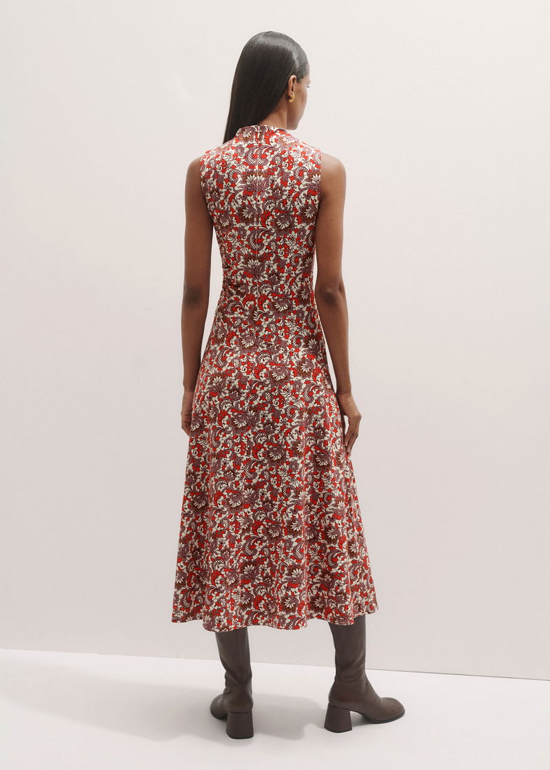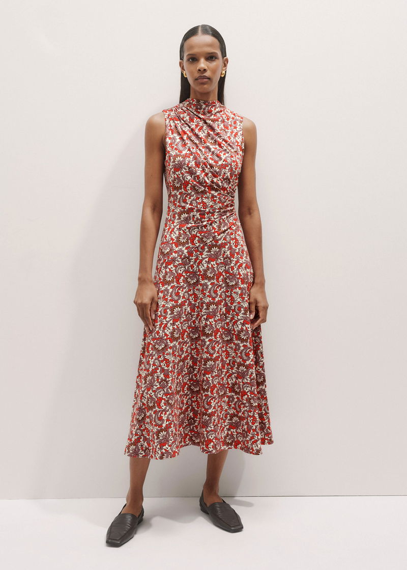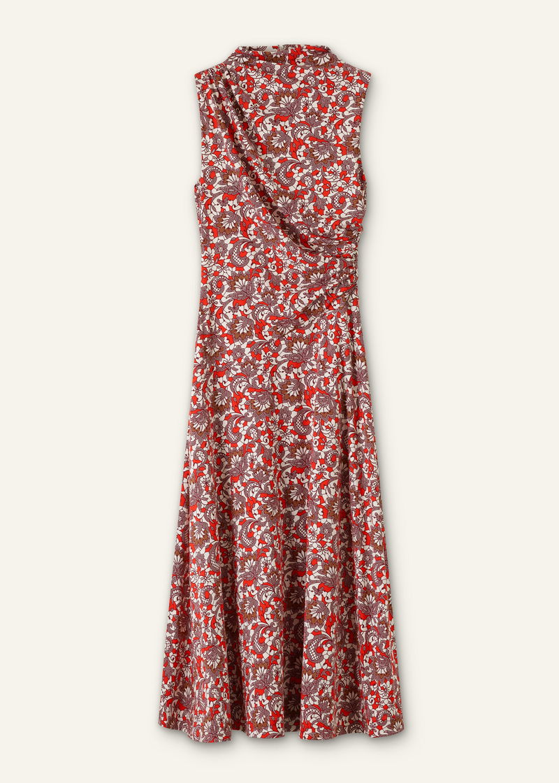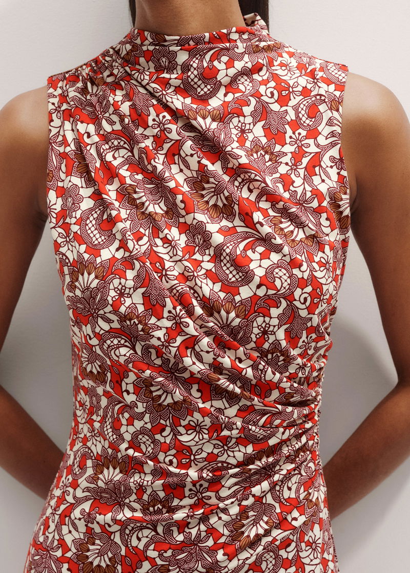 Graphic Lace Print Ruched Midi Dress Poppy Red Multi