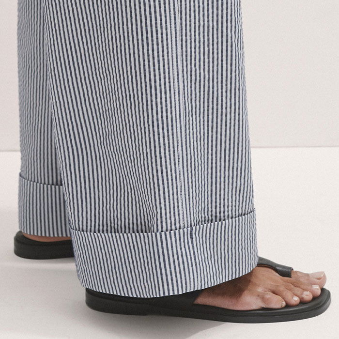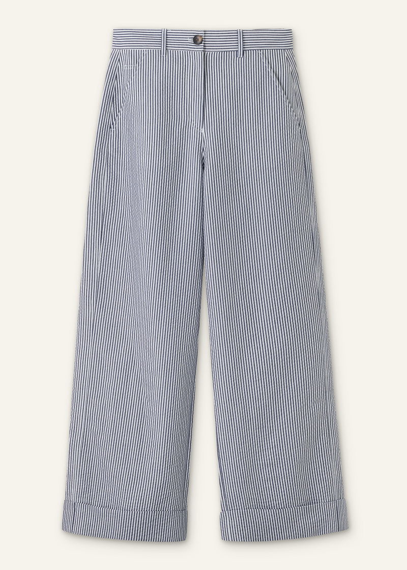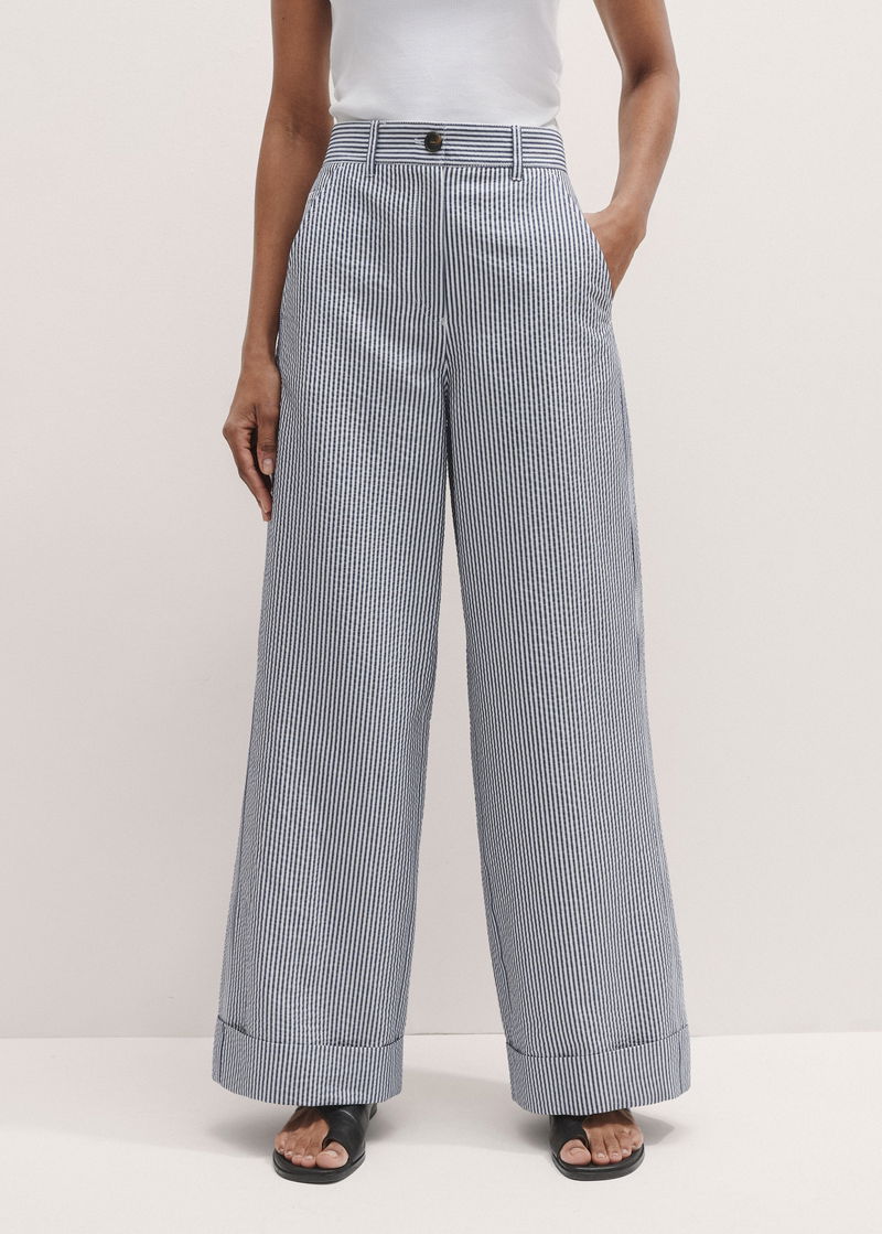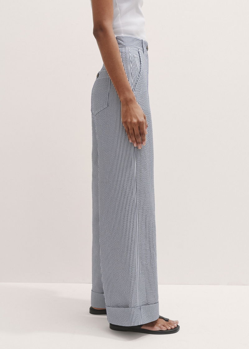 ME+EM's Navy Seersucker Straight-Leg Man Pant is designed with functional pockets, turn-up cuffs and belt loops.