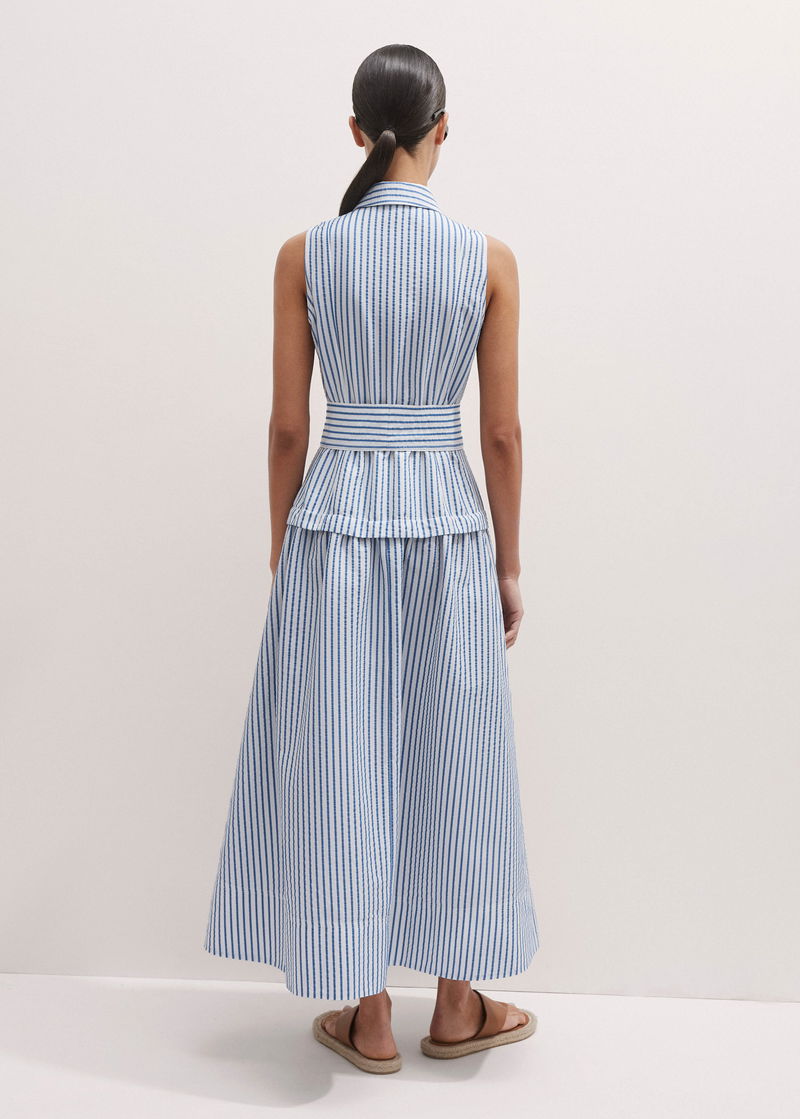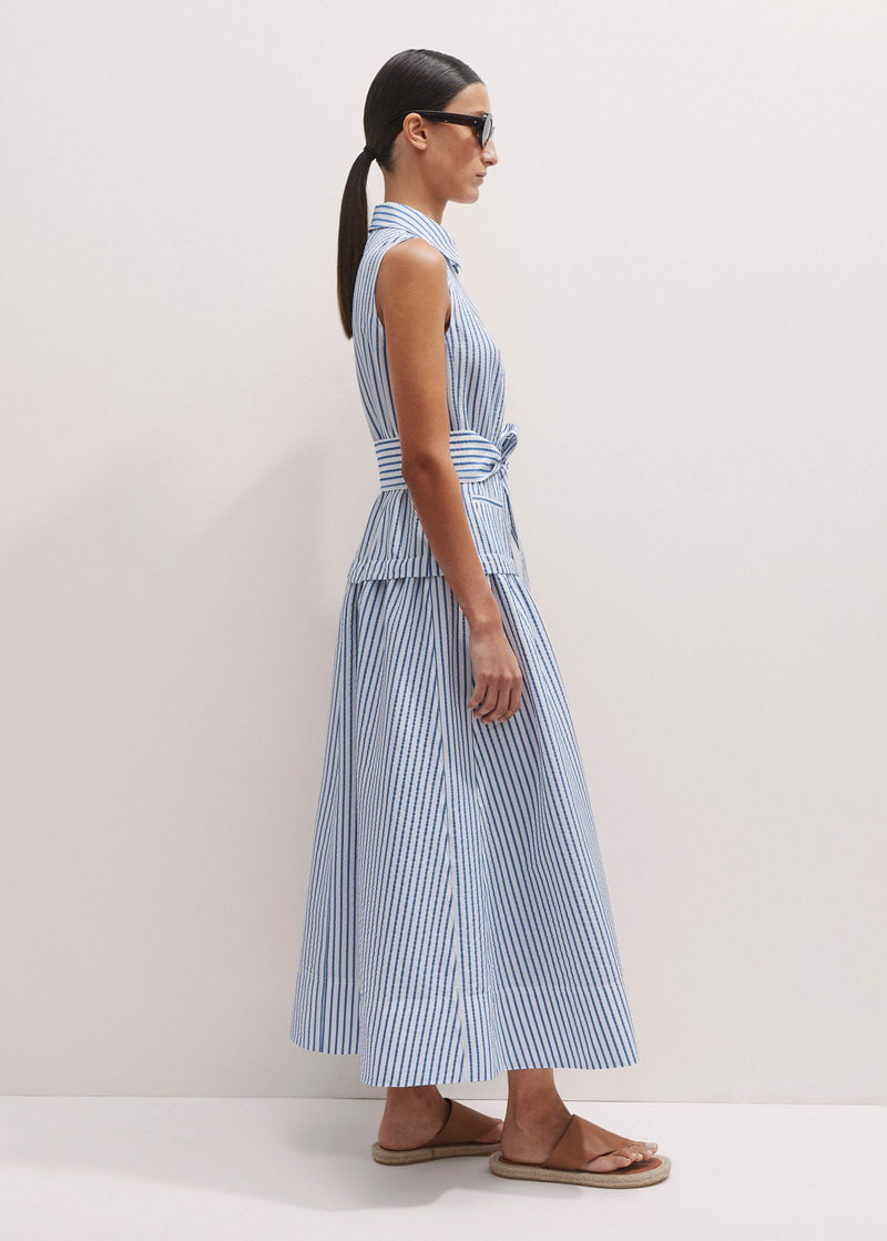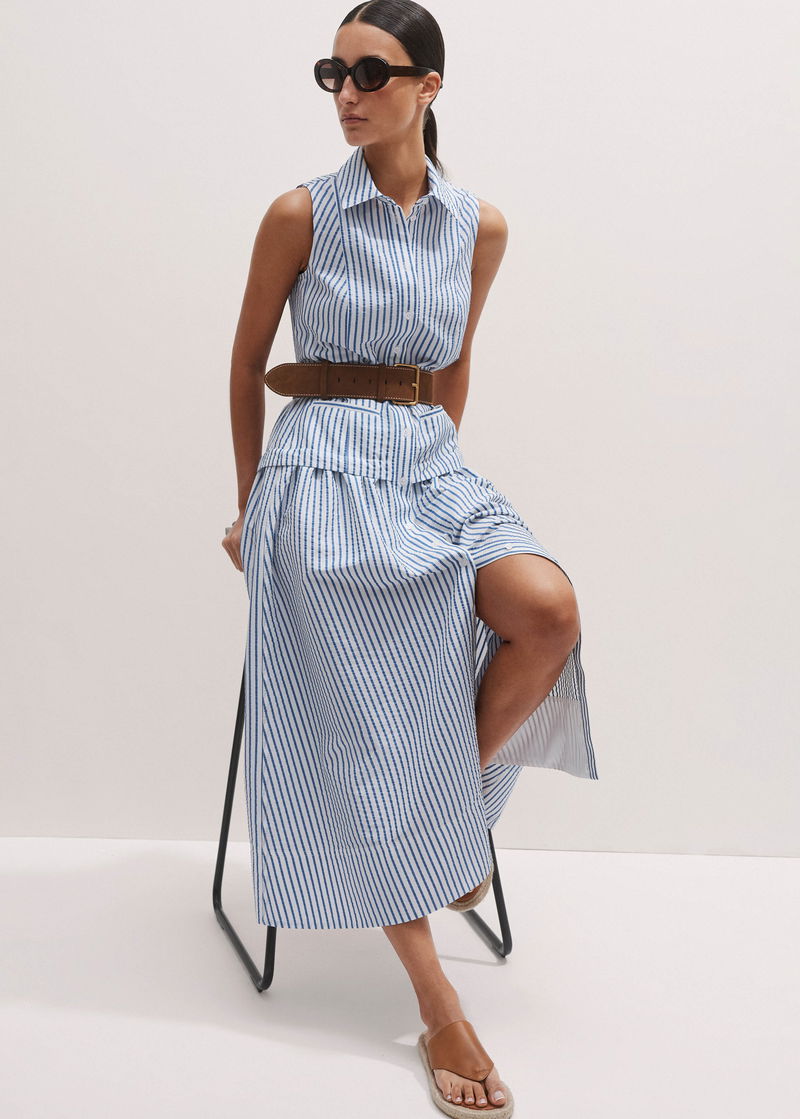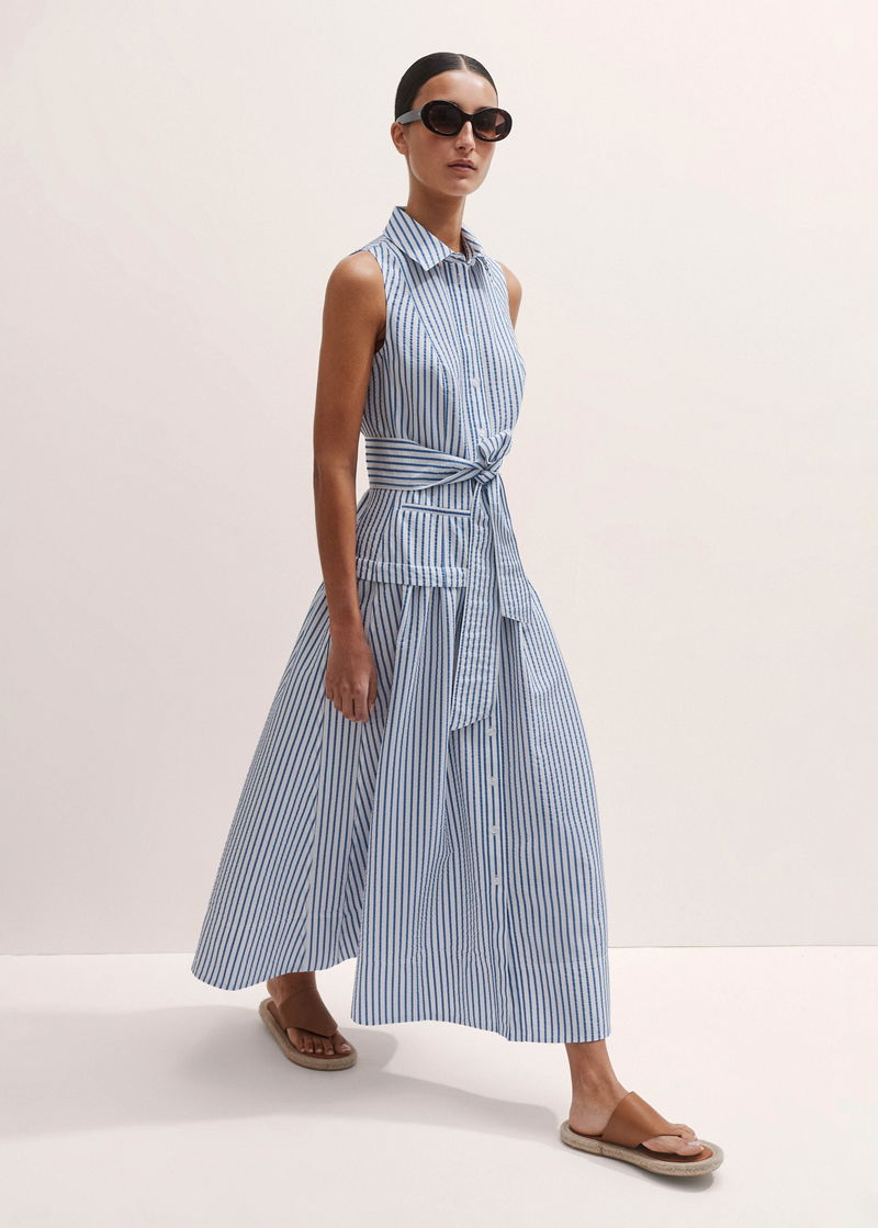 ME+EM's Blue Seersucker Maxi Shirt Dress + Belt is designed with a collared neckline, functional pockets and a flared hem.