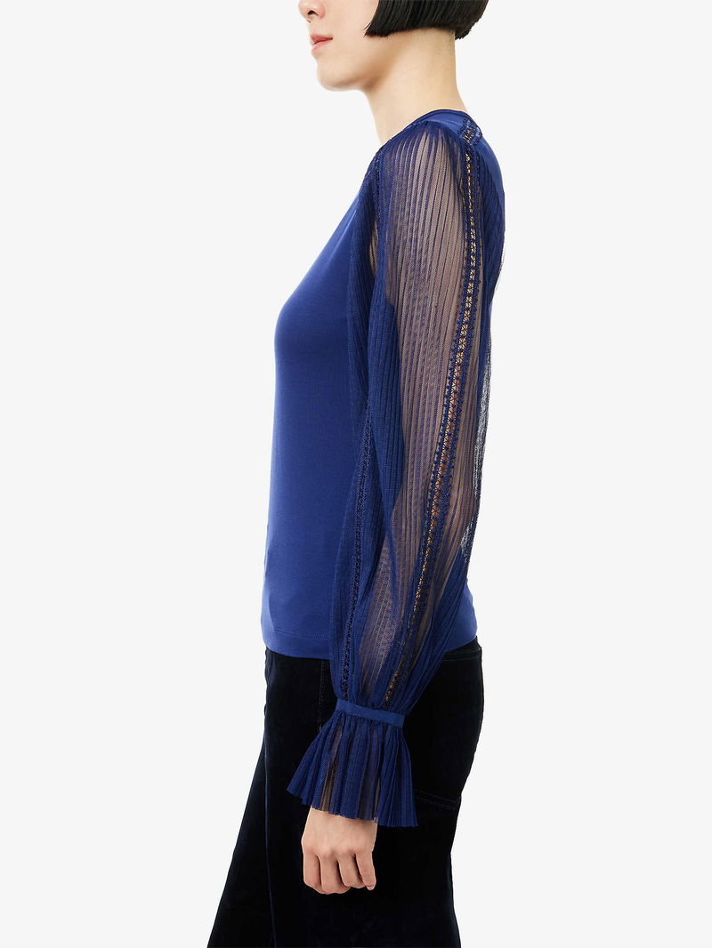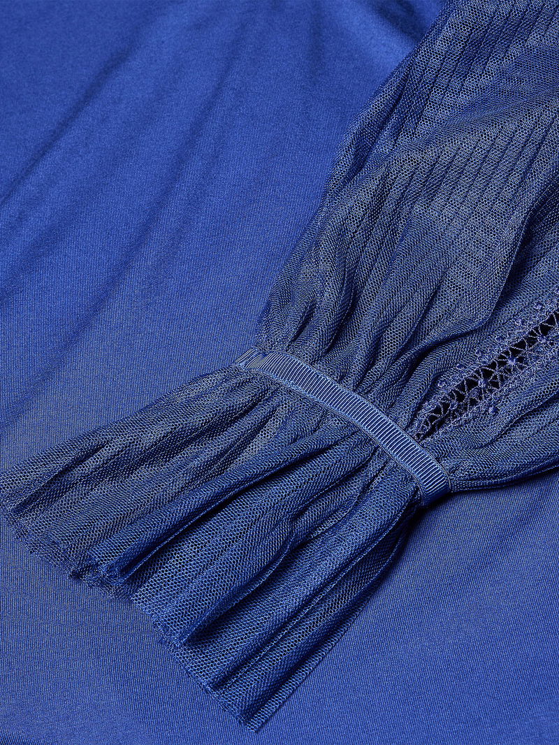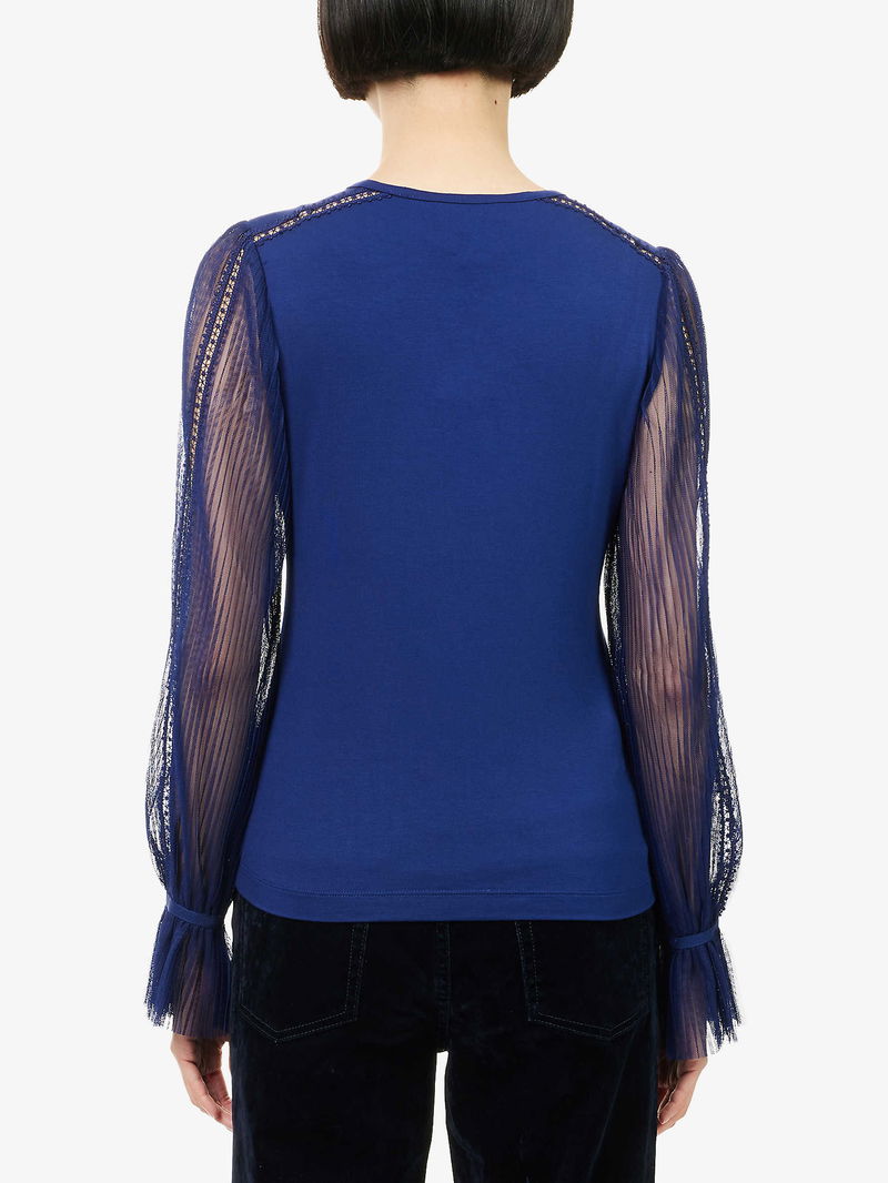 Lace-Insert Tulle-Sleeeve Stretch-Jersey Blouse