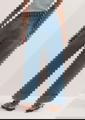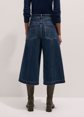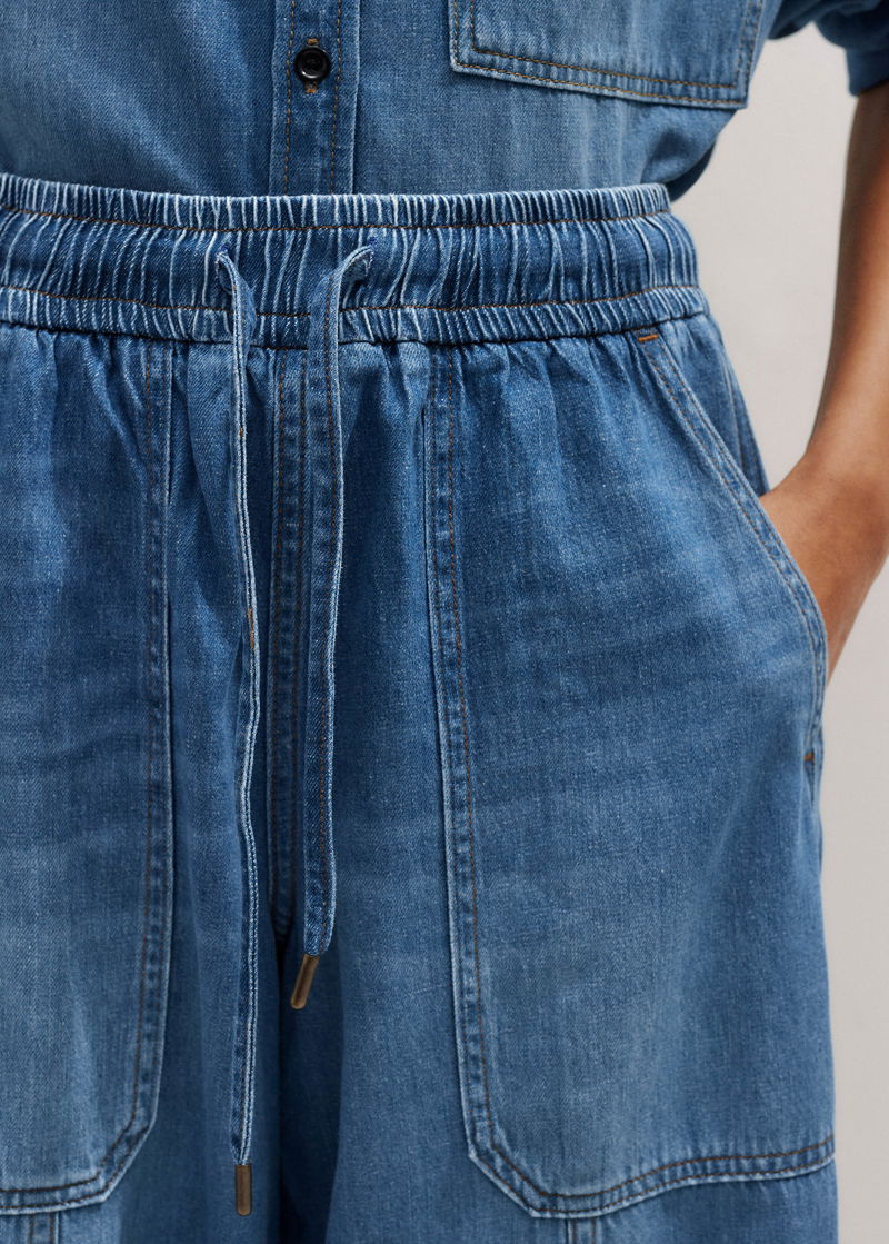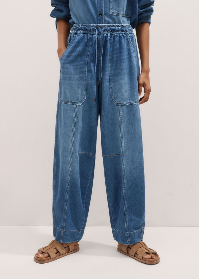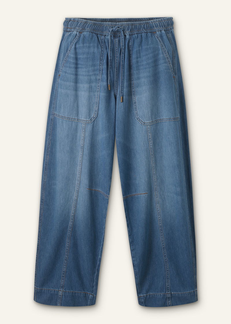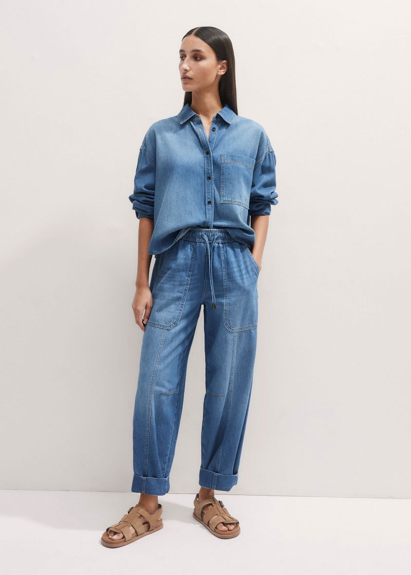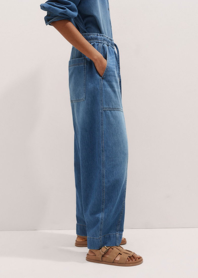 ME+EM's Blue Tapered Lightweight Denim Pant features expertly placed darted seams to create an architectural feel.