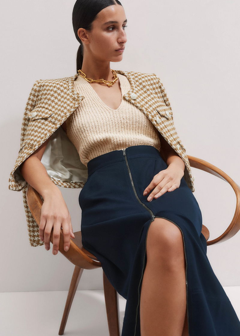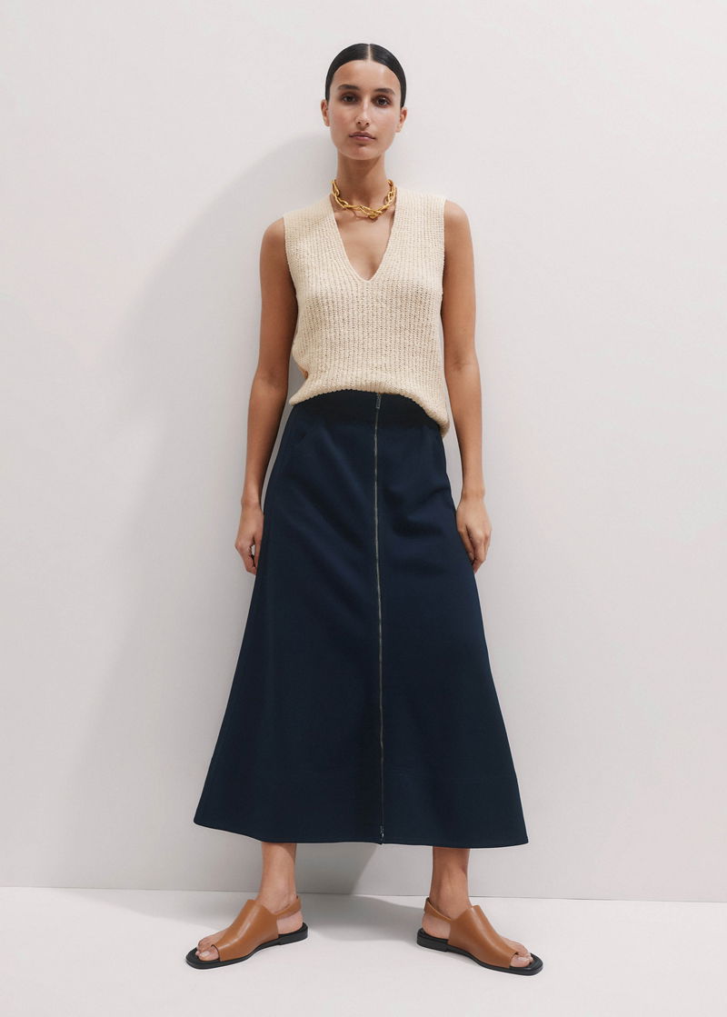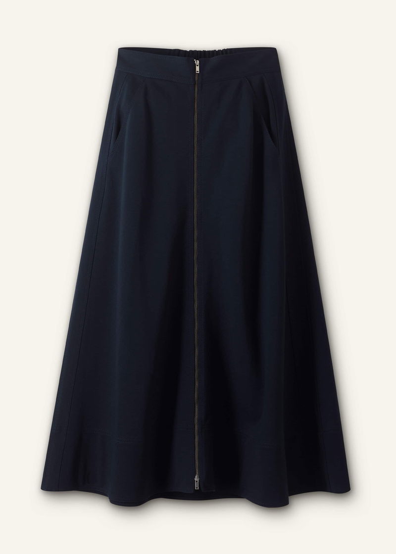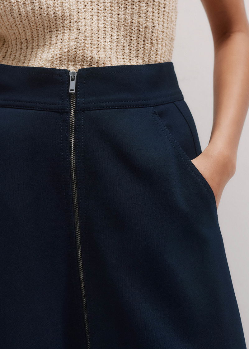 Luxe Travel Tailoring Zip-Front Midi Skirt Navy