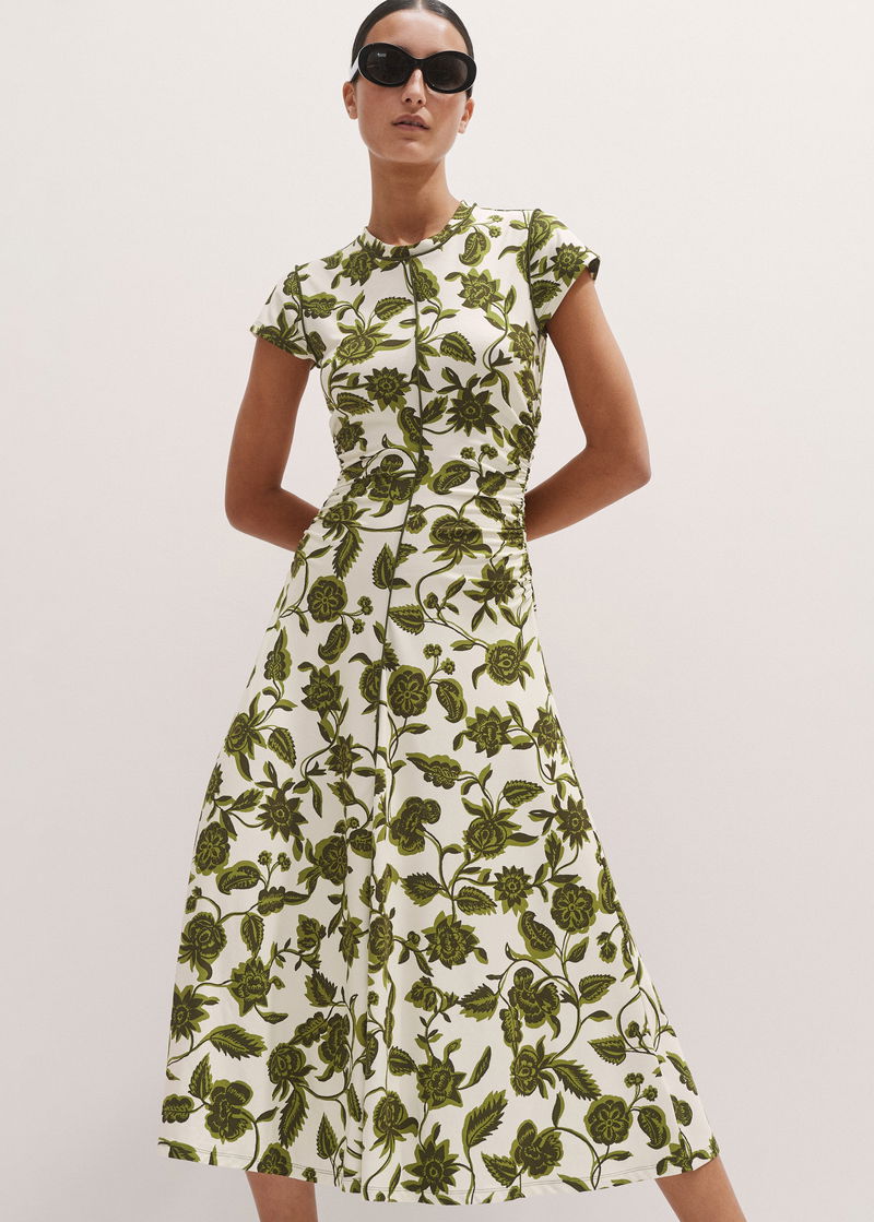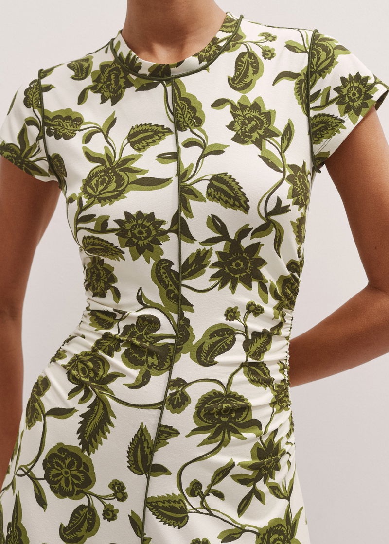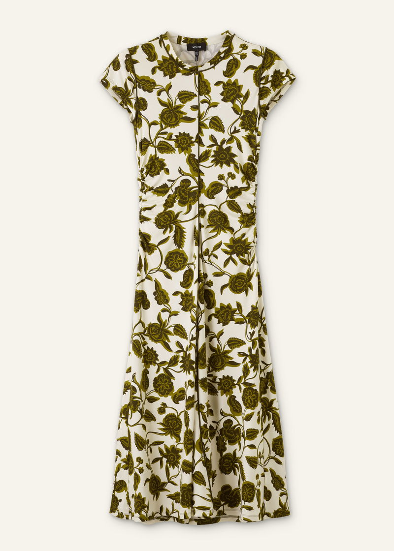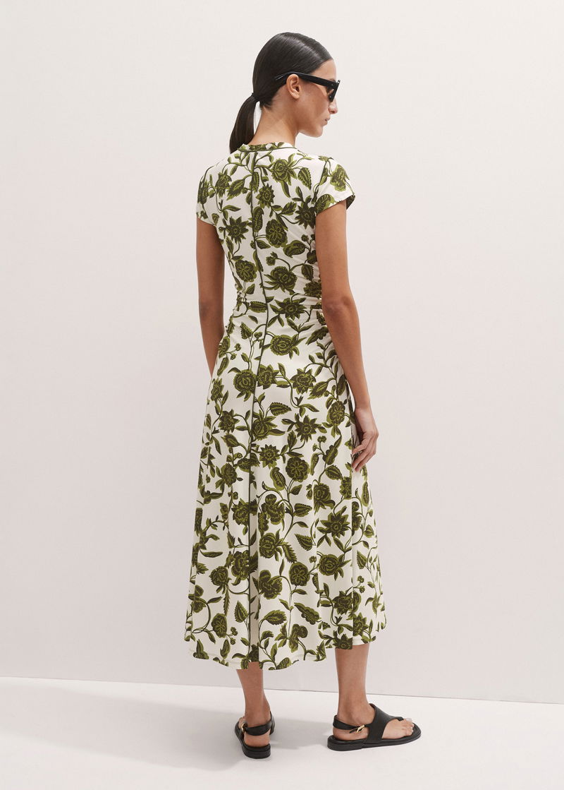 Midnight Hibiscus Print Crew Neck Midi Dress White/Green/Multi