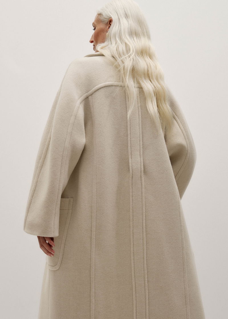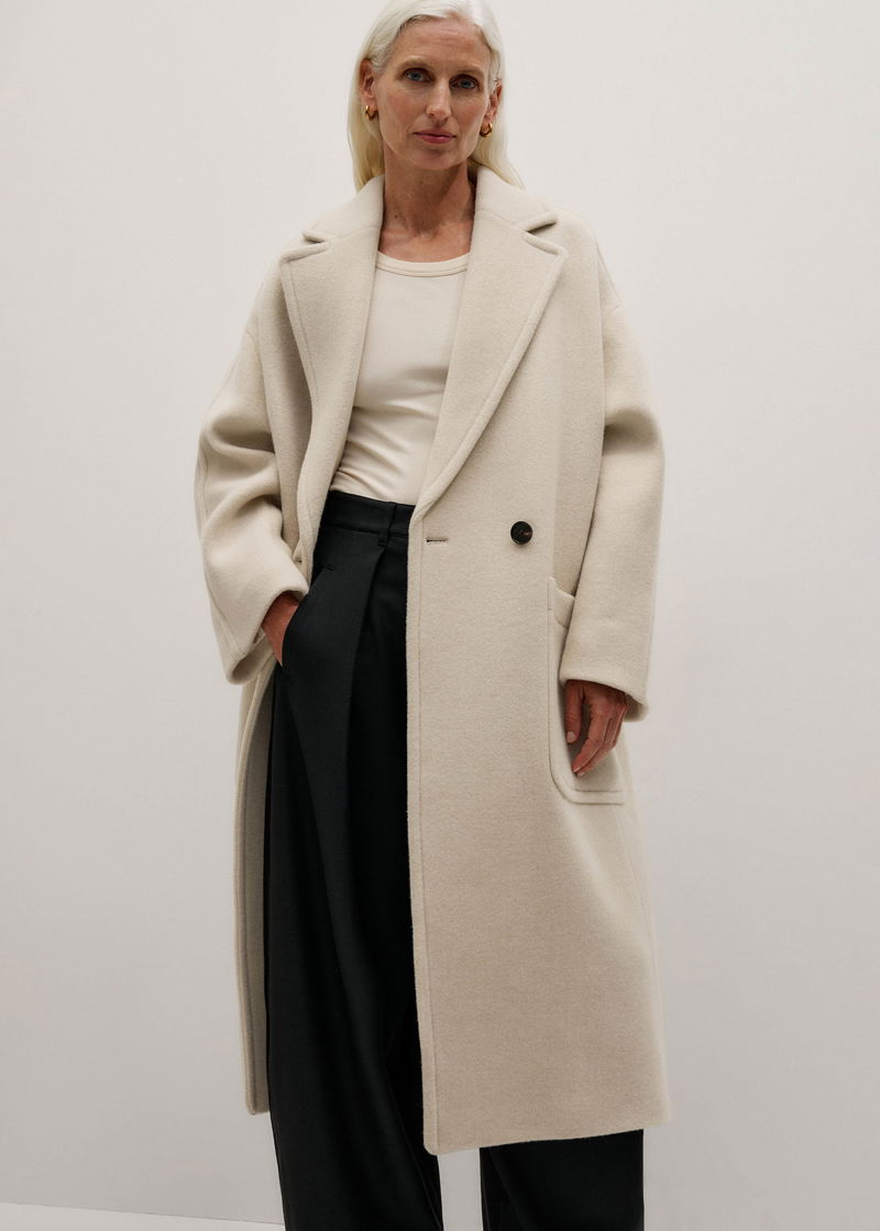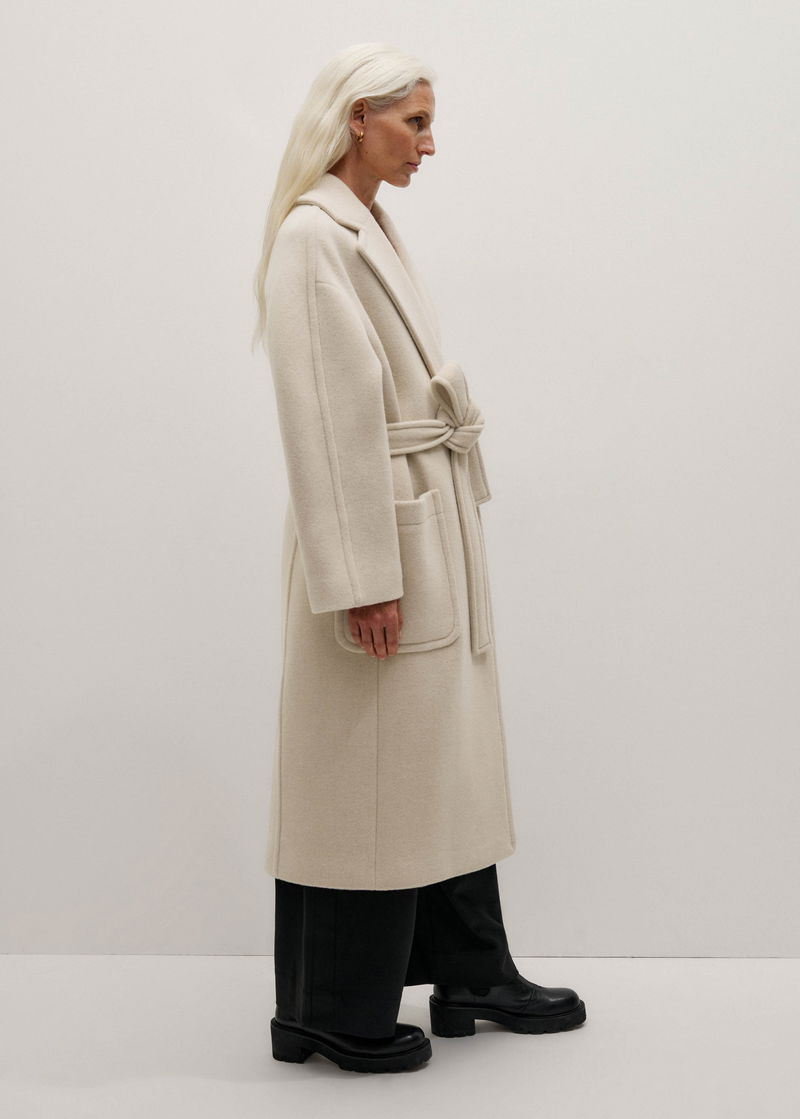 ME+EM's Oatmeal Petite Coat + Belt has been scaled for petite frames, falling to a shorter length and an all-over smaller fit.