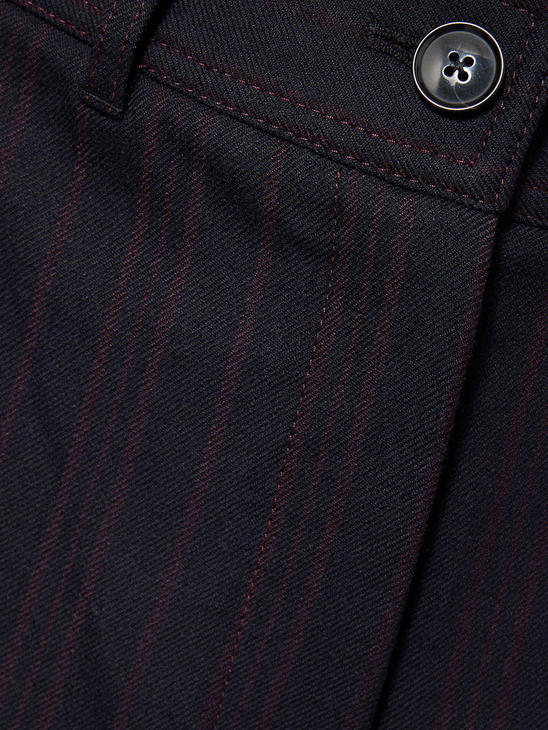 • Relaxed fit, high-rise, barrel leg, belt loops, two slip pockets at front, two patch pockets at back, all-over striped print