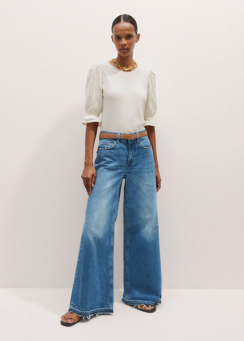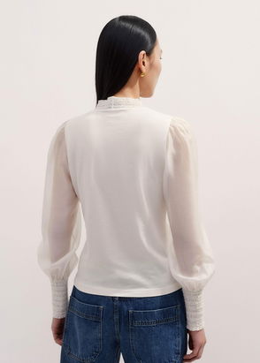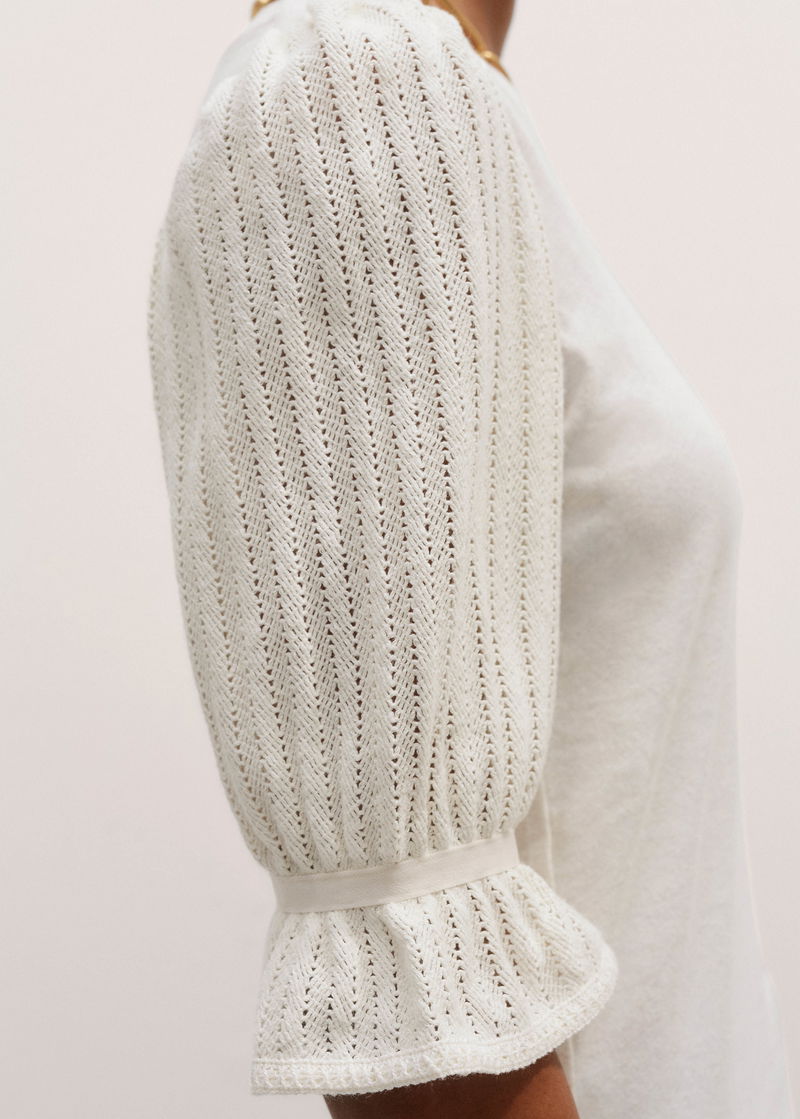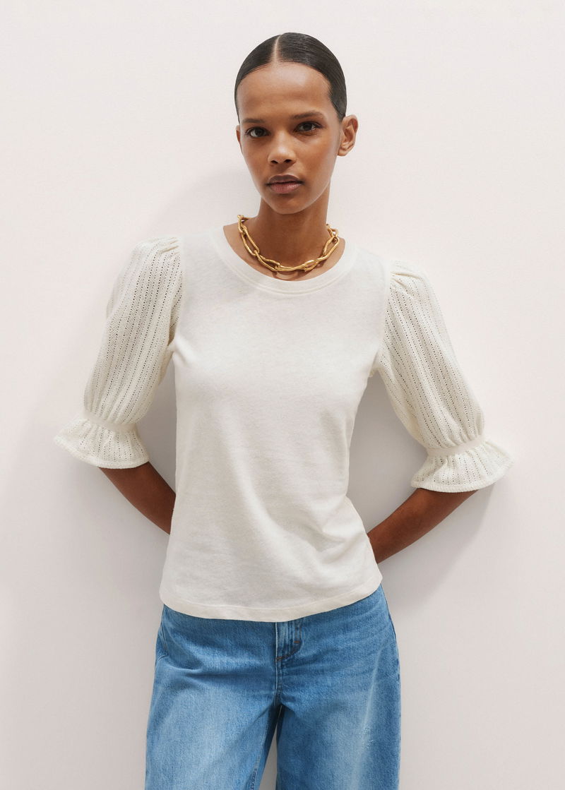 ME+EM's Cream Pointelle Sleeve Peplum Top is crafted from cotton blended with linen for a breathable finish.