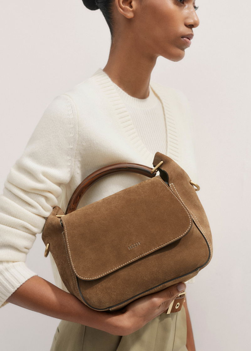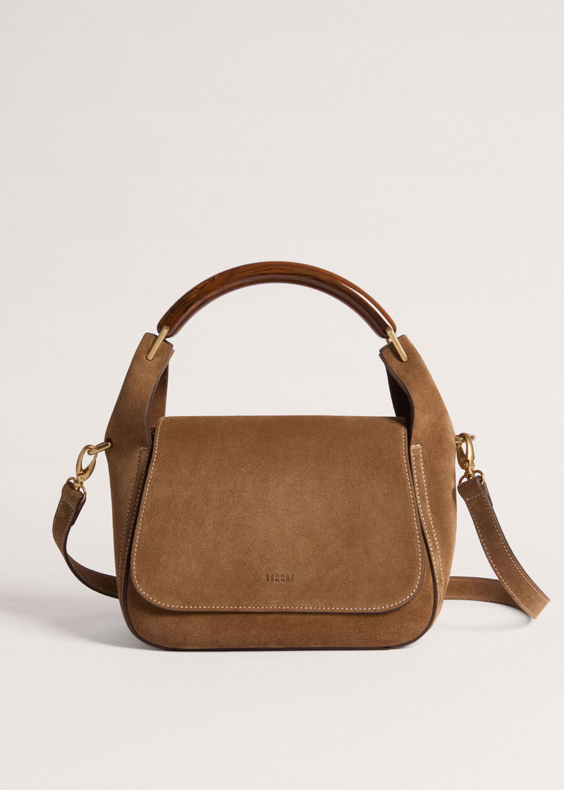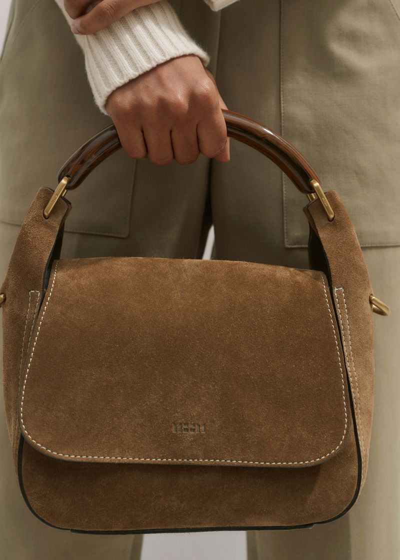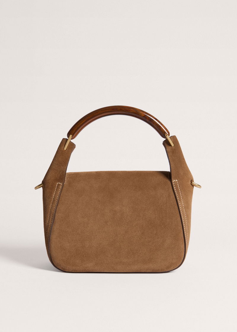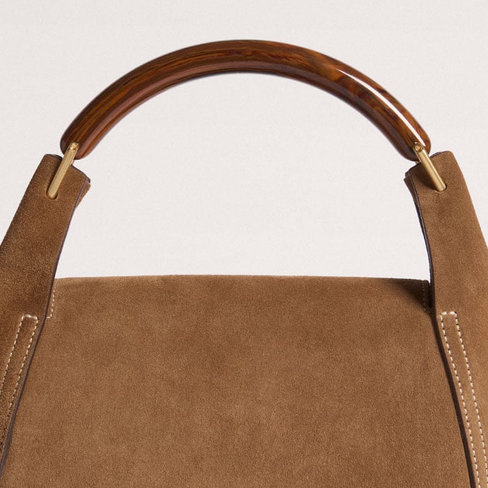 ME+EM's Brown Suede Resin Handle Crossbody Bag is elevated with matte gold-plated hardware and an adjustable, detachable strap for a customisable finish.