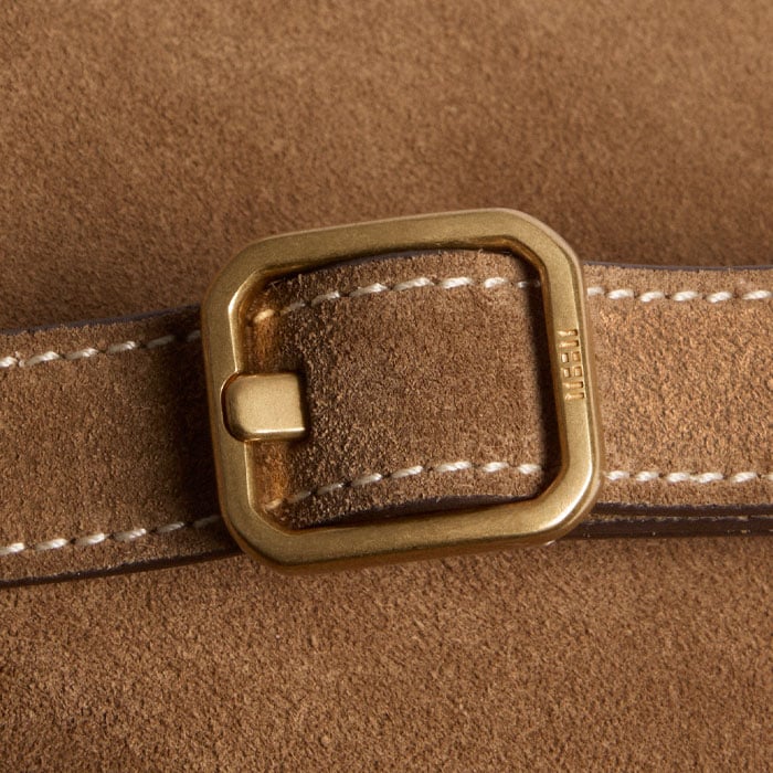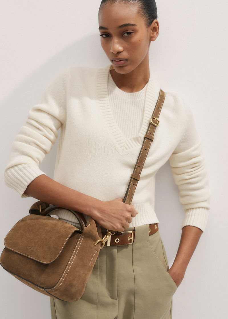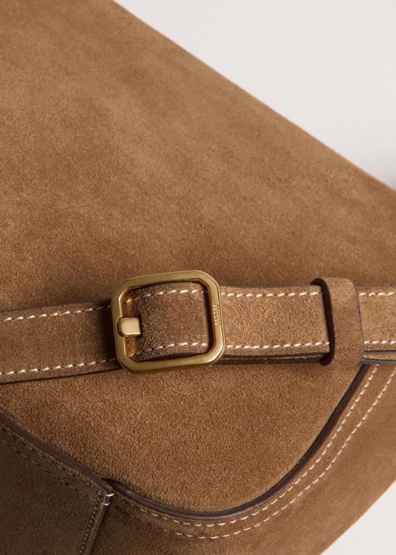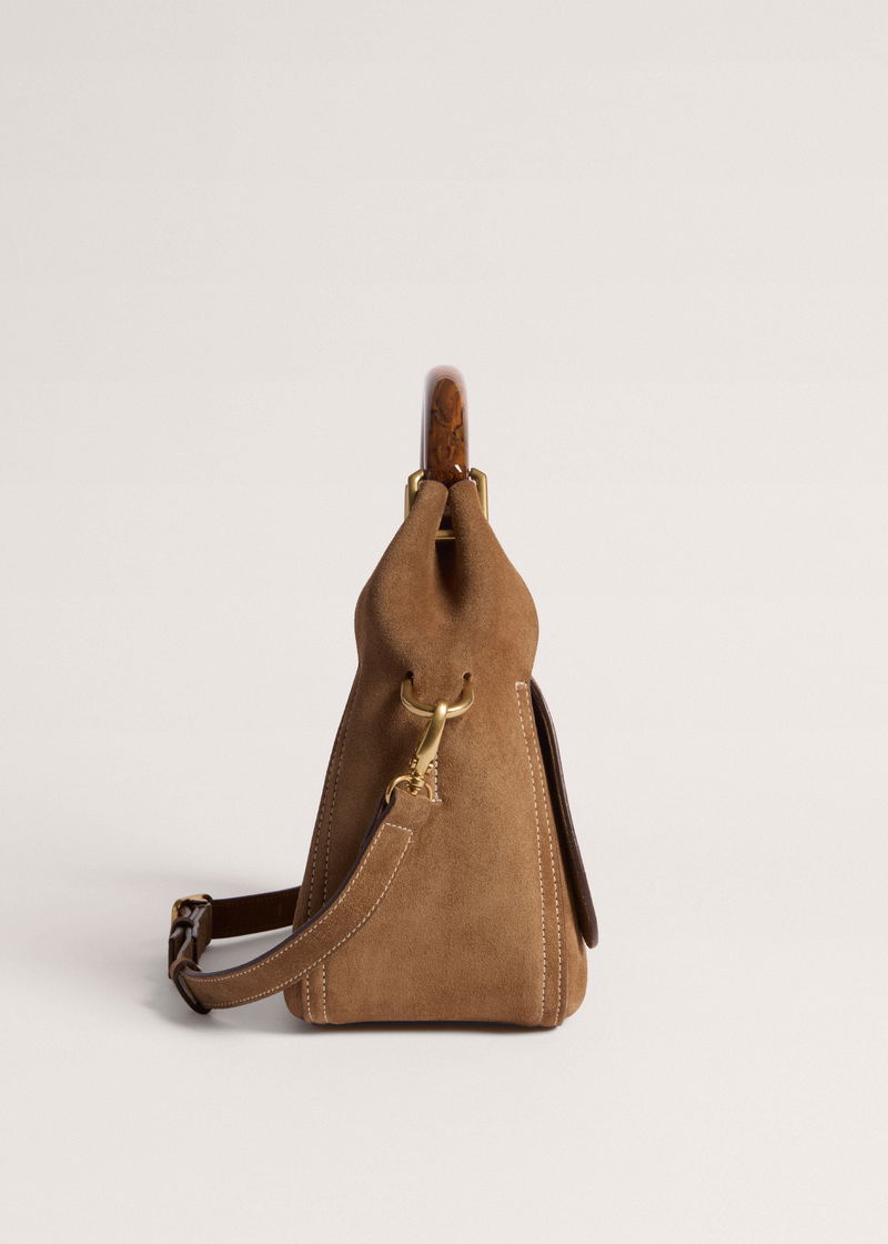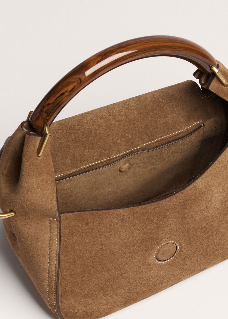 ME+EM's Brown Suede Resin Handle Crossbody Bag is elevated with matte gold-plated hardware and an adjustable, detachable strap for a customisable finish.