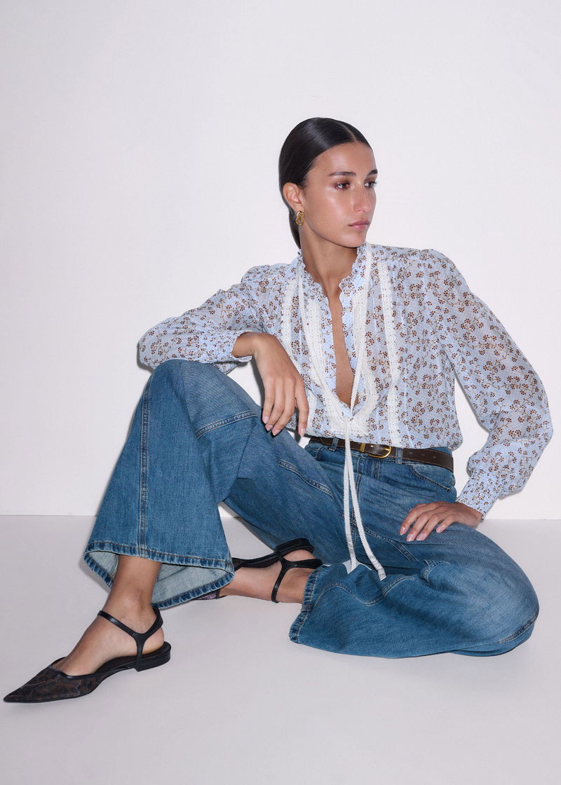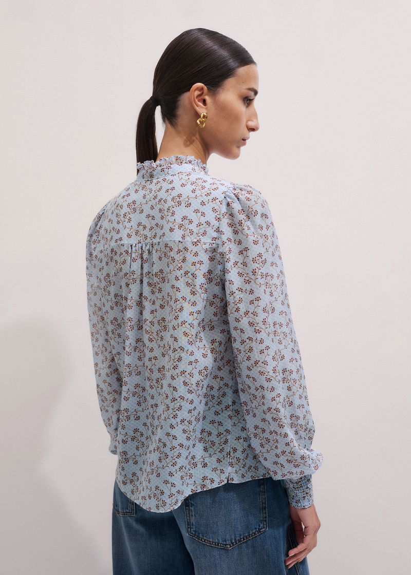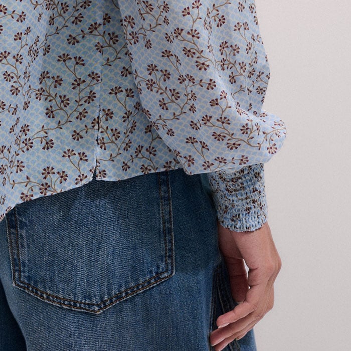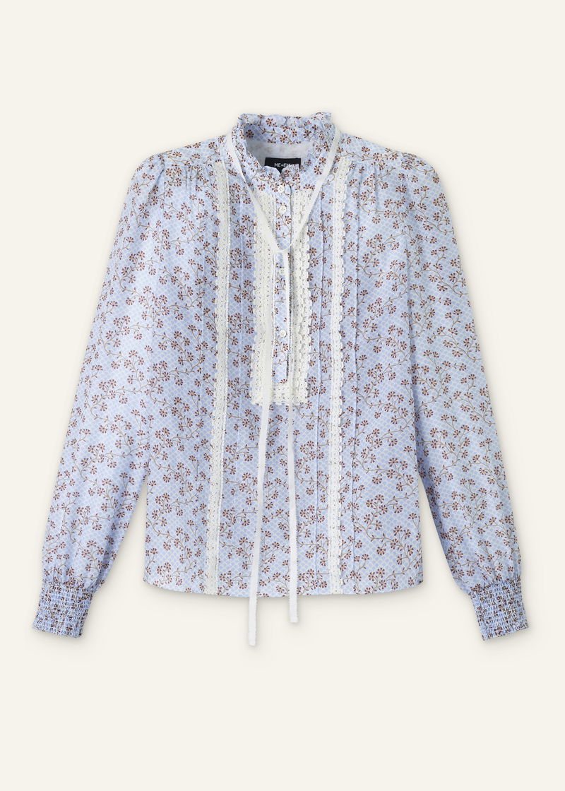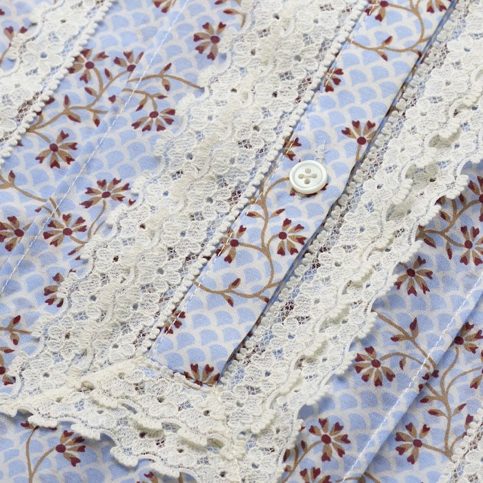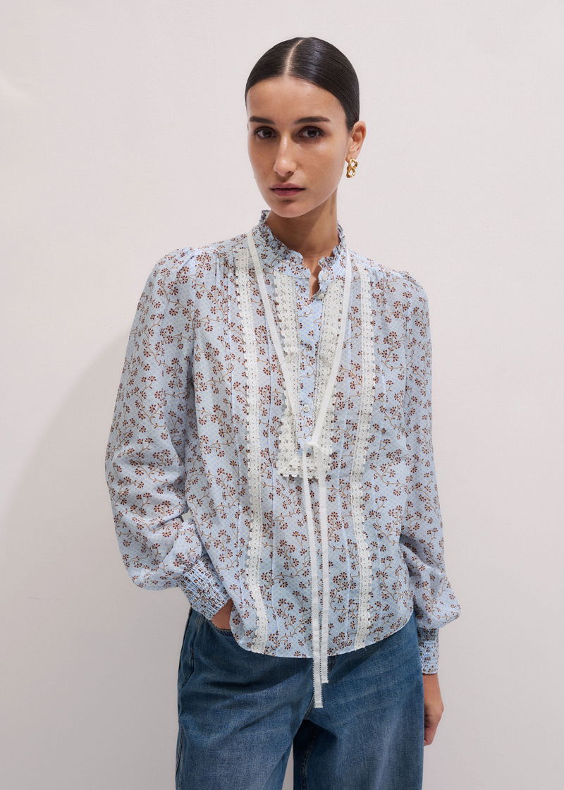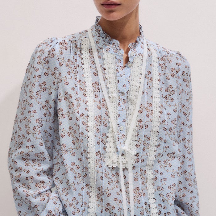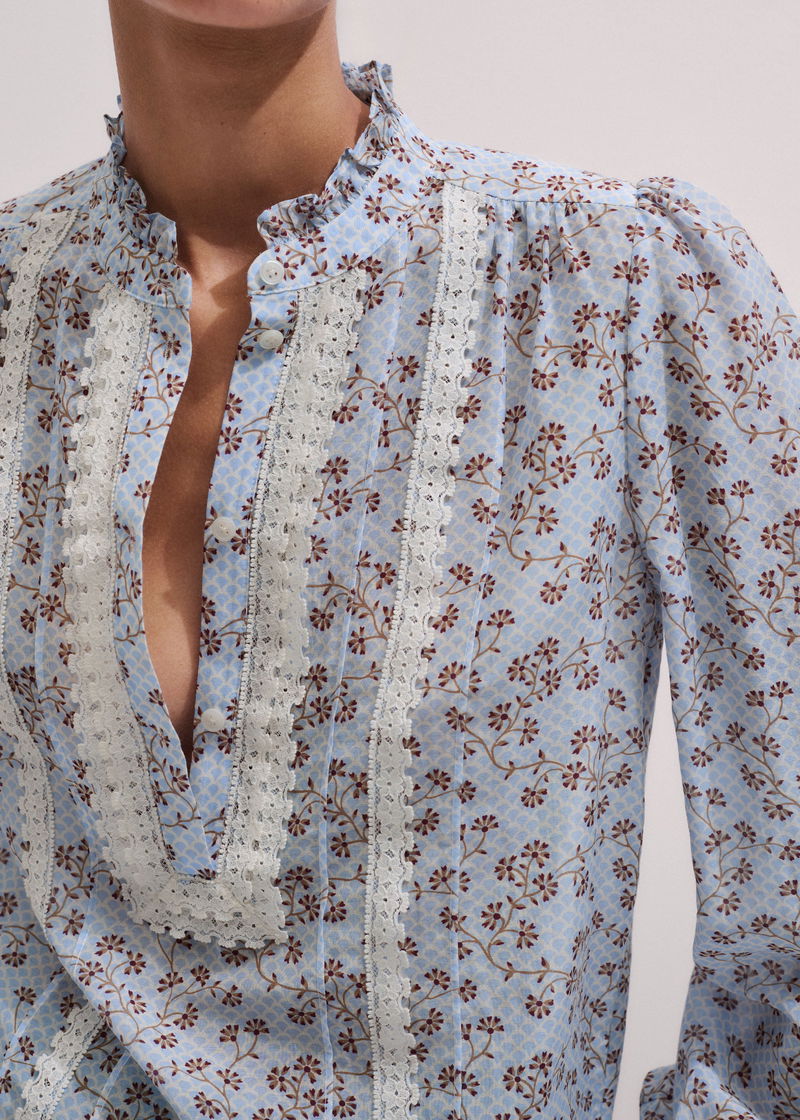 Scallop Daisy Print Trim Detail Blouse + Tie Blue Multi