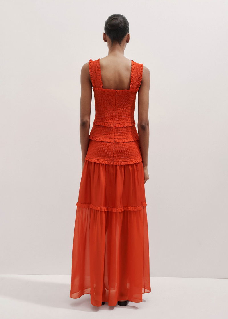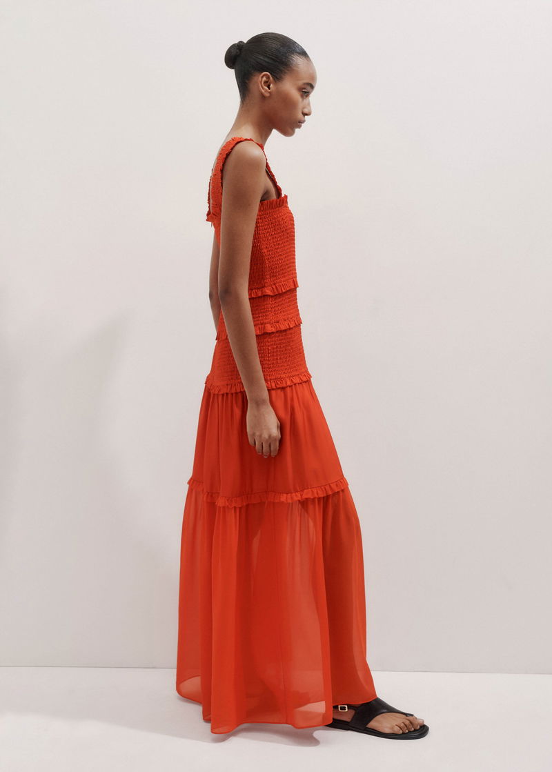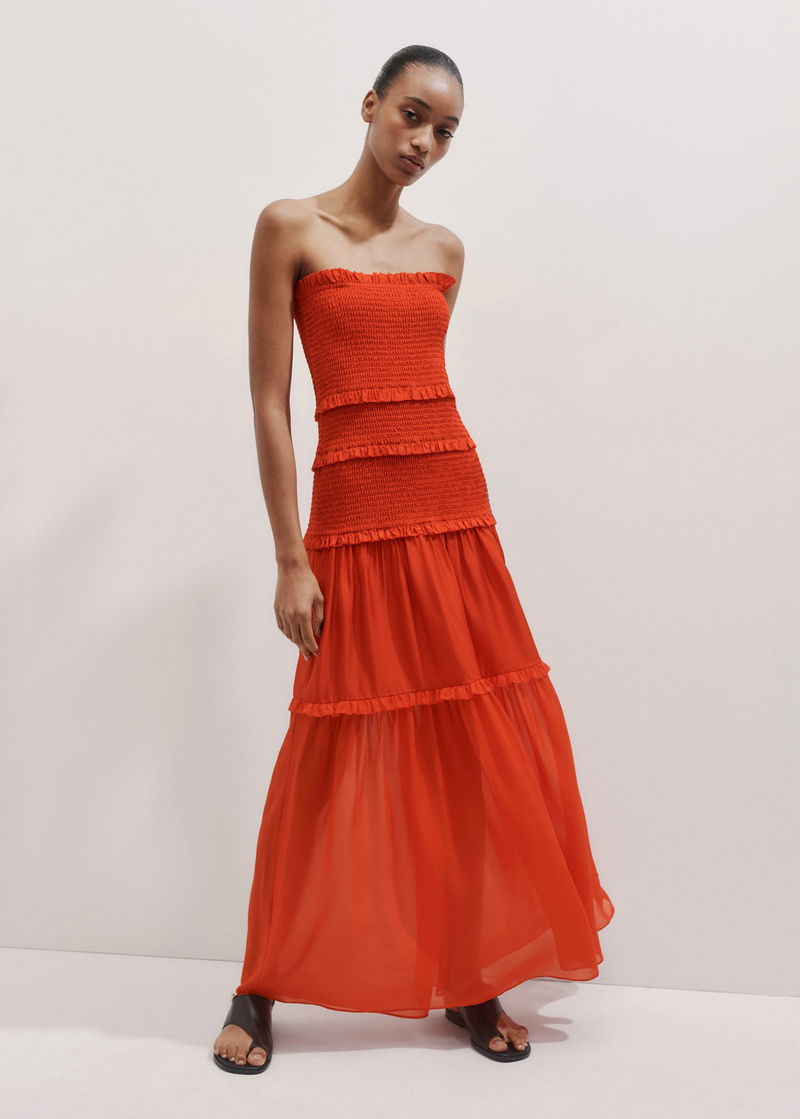 Silk-Blend Shirred Full-Length Dress + Strap Intense Orange