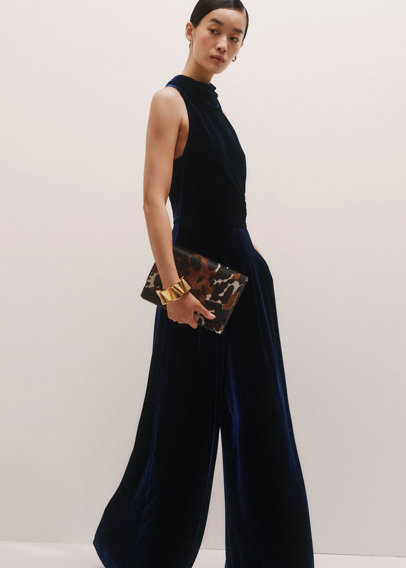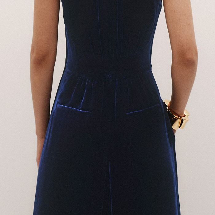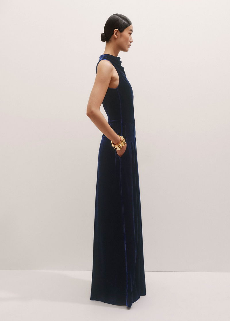 Silk Blend Velvet Dropped Neckline Jumpsuit Bright Evening Blue