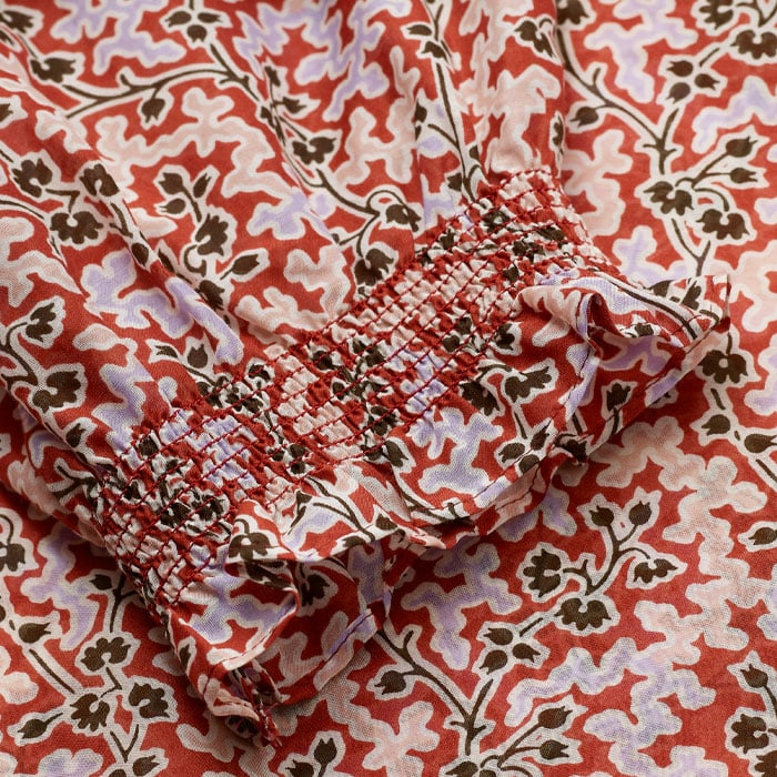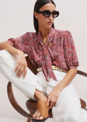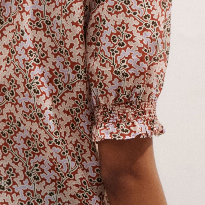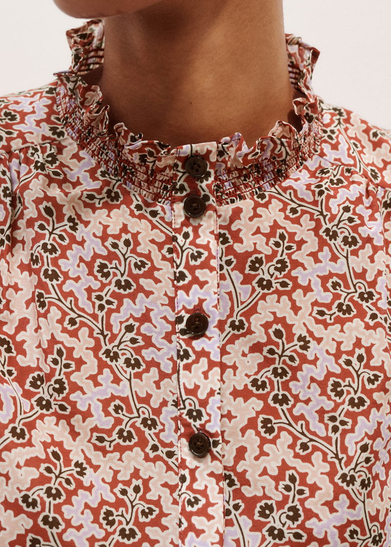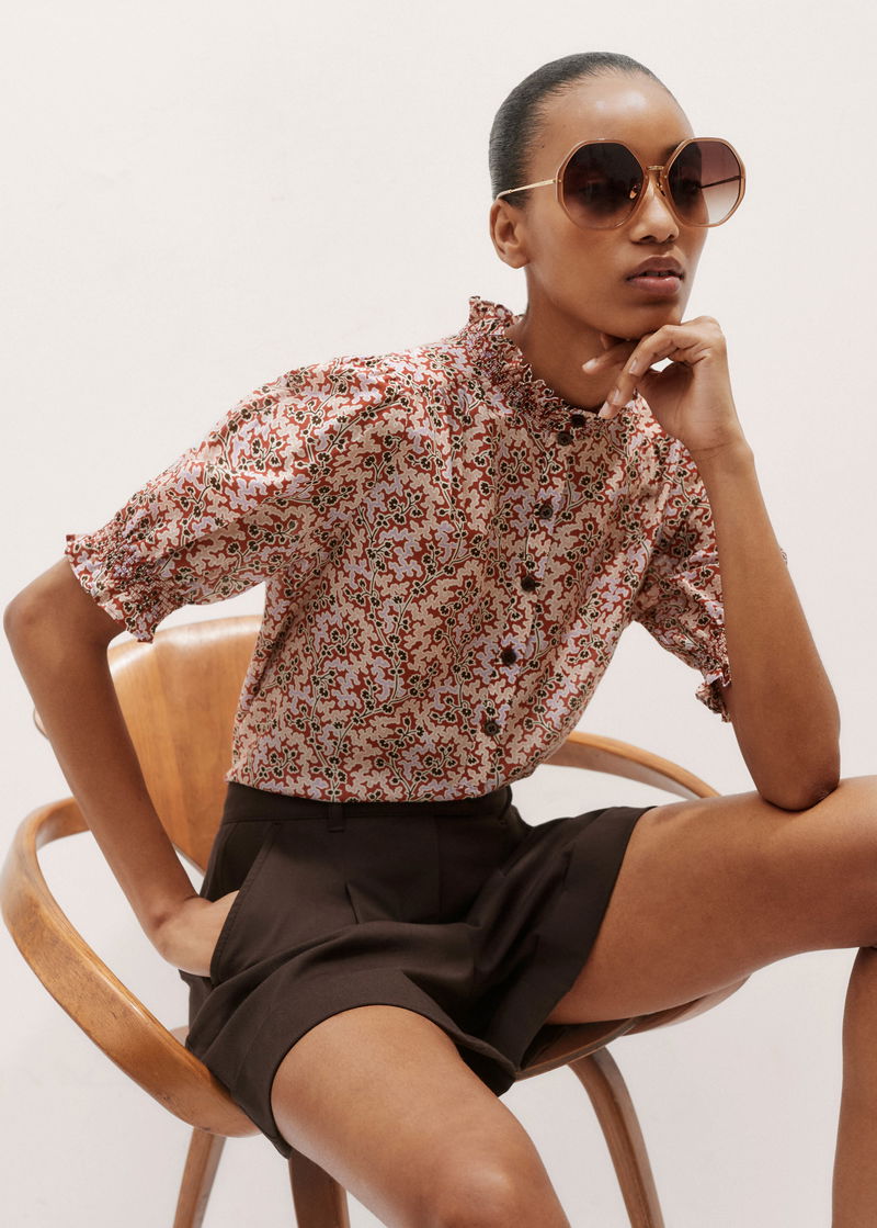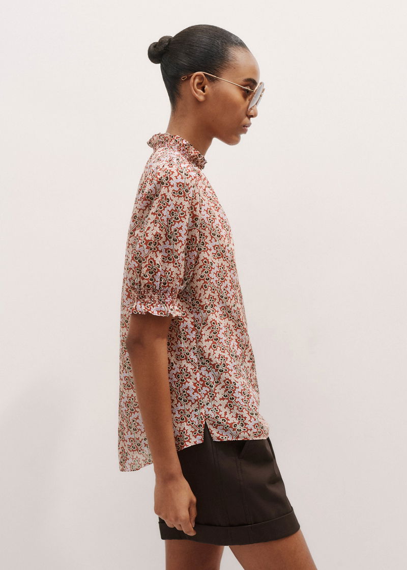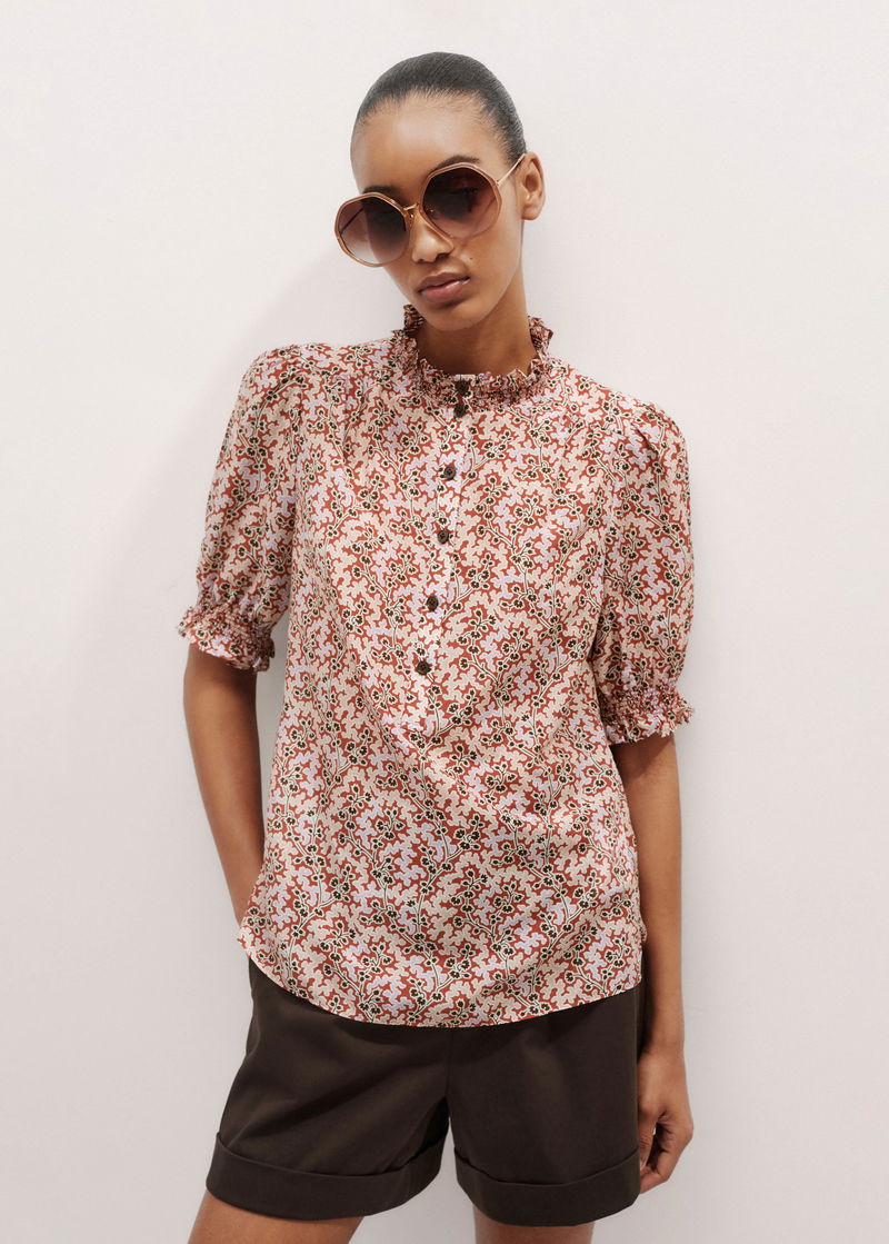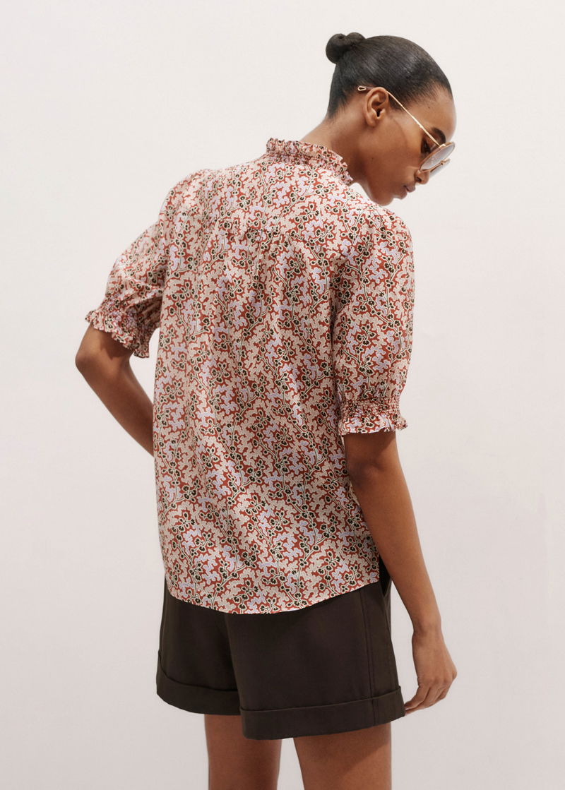 ME+EM's Pink Silk Cotton Climbing Buds Print Blouse is enhanced with frilled trims at the neckline and cuffs and short balloon sleeves.
