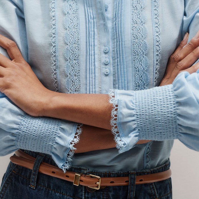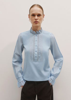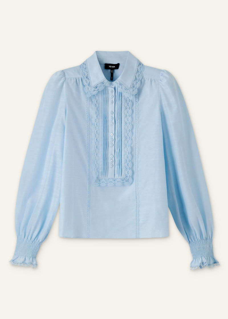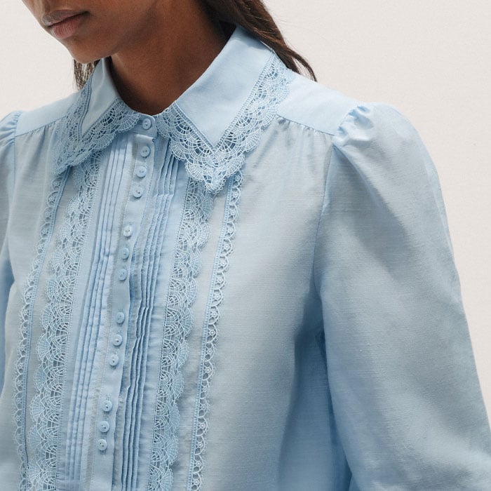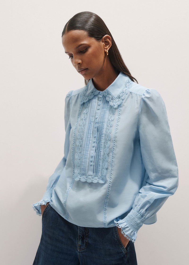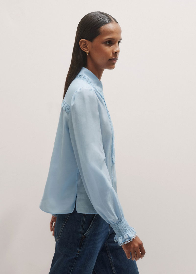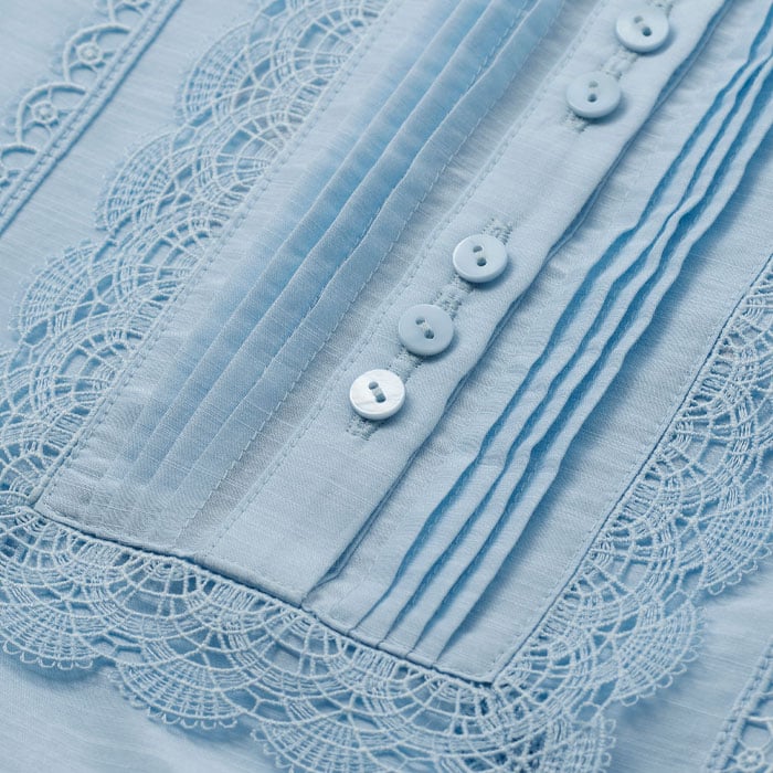 Silk Cotton Lace Trim Straight Blouse Cloud Blue