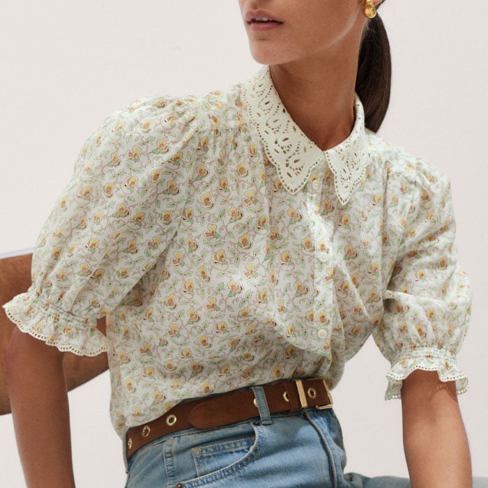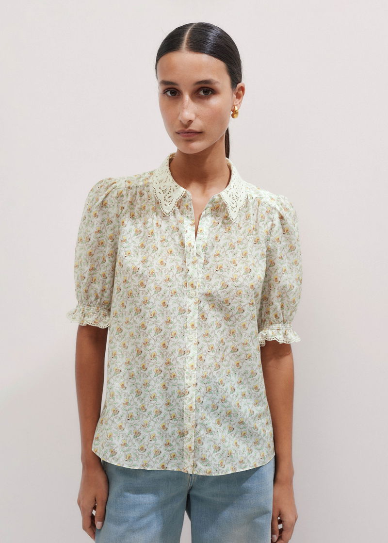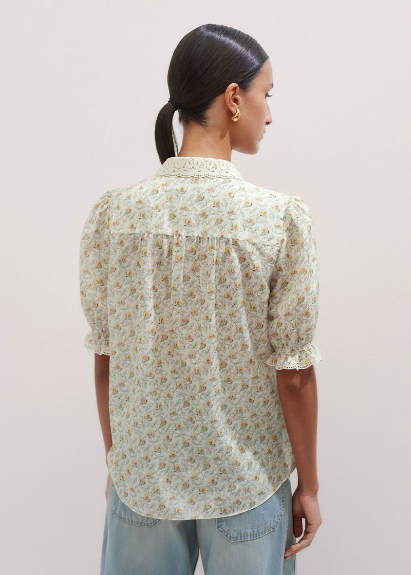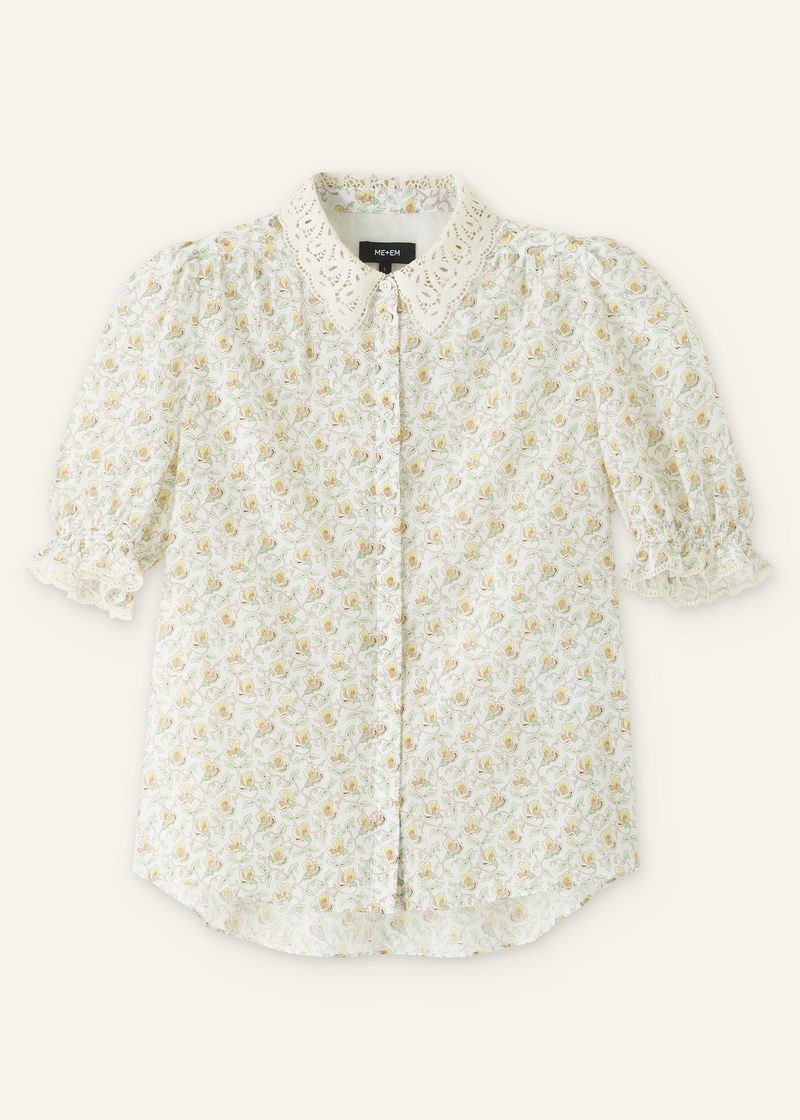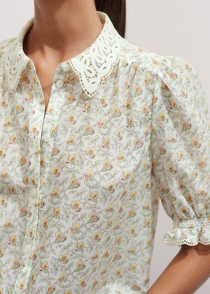 Silk Cotton Sweet Pea Print Blouse With Broderie Collar Light Cream/Buttercream/Multi