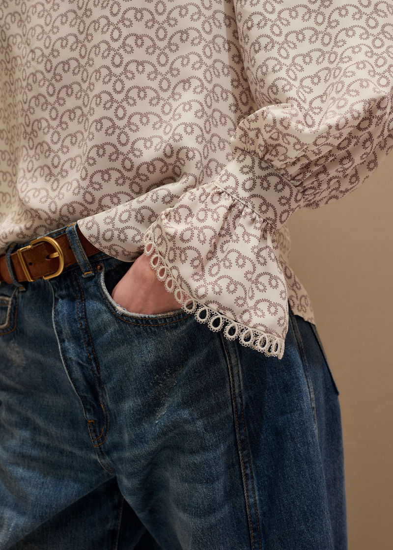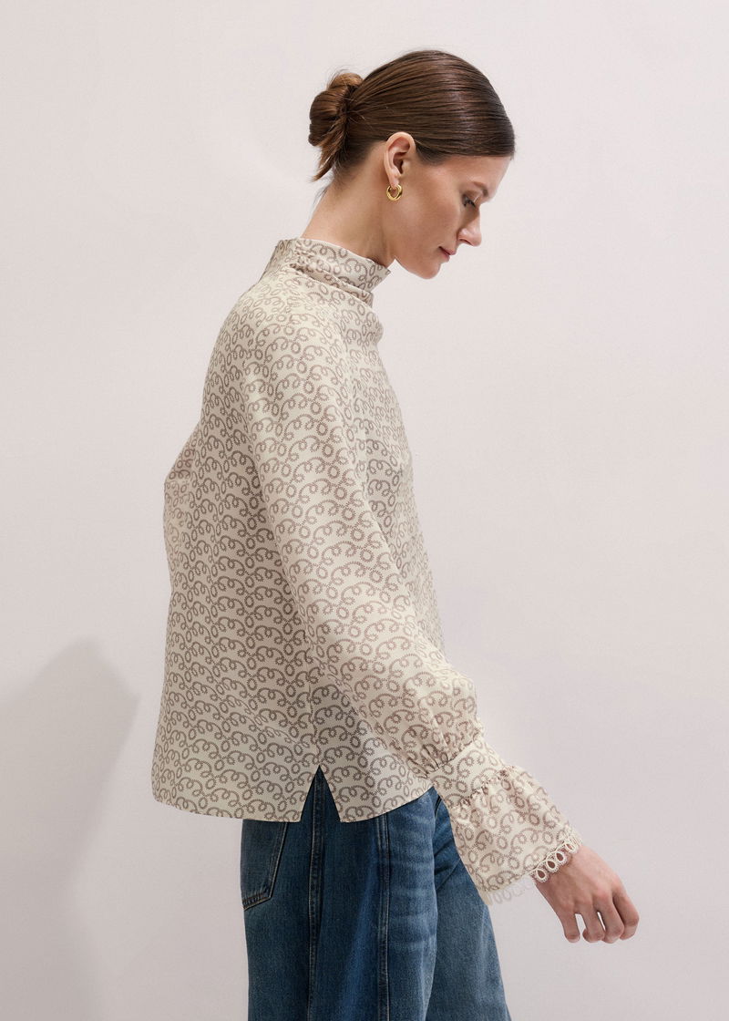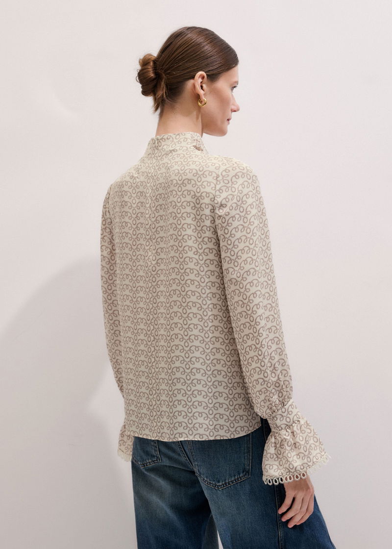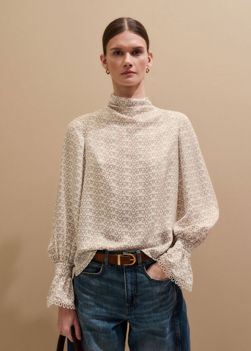Silk Delicate Ribbon Print Cowl Neck Straight Top Light Cream/Brown