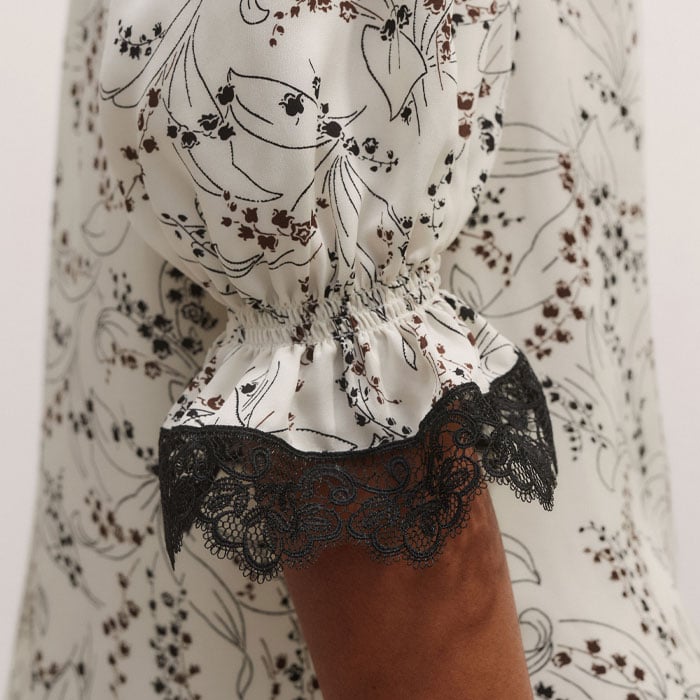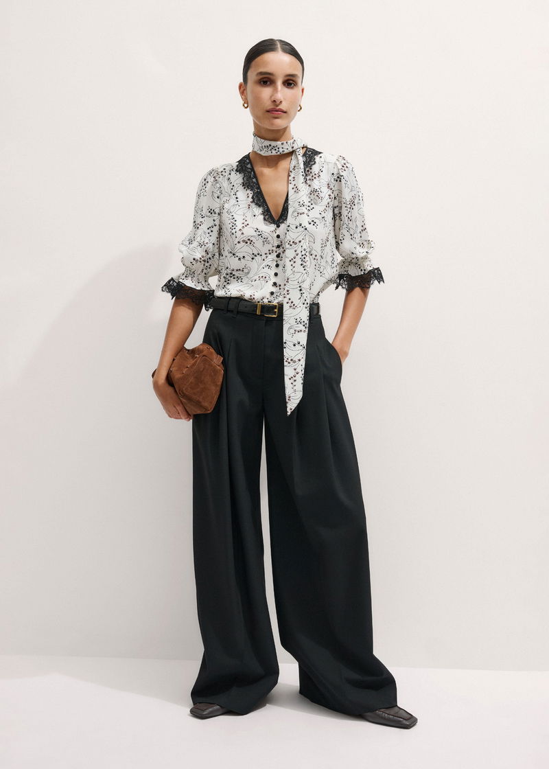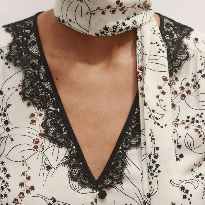 Silk Lily Of The Valley Print Blouse + Tie Light Cream/Black/Multi