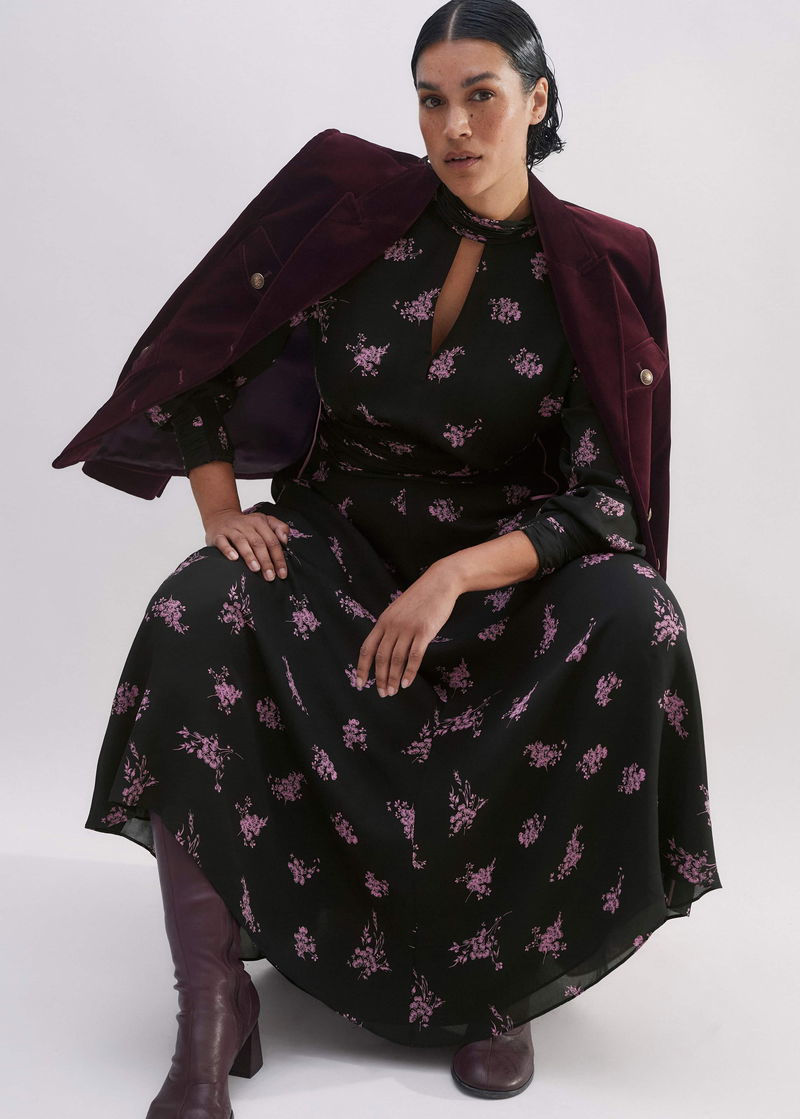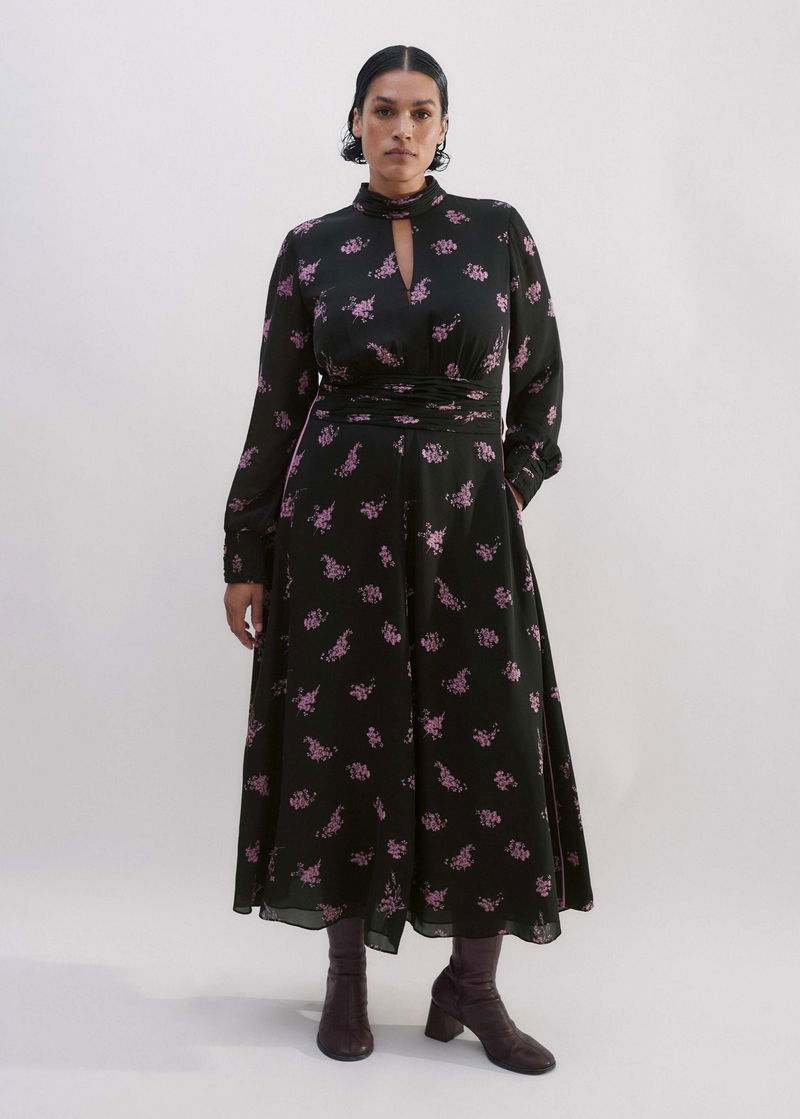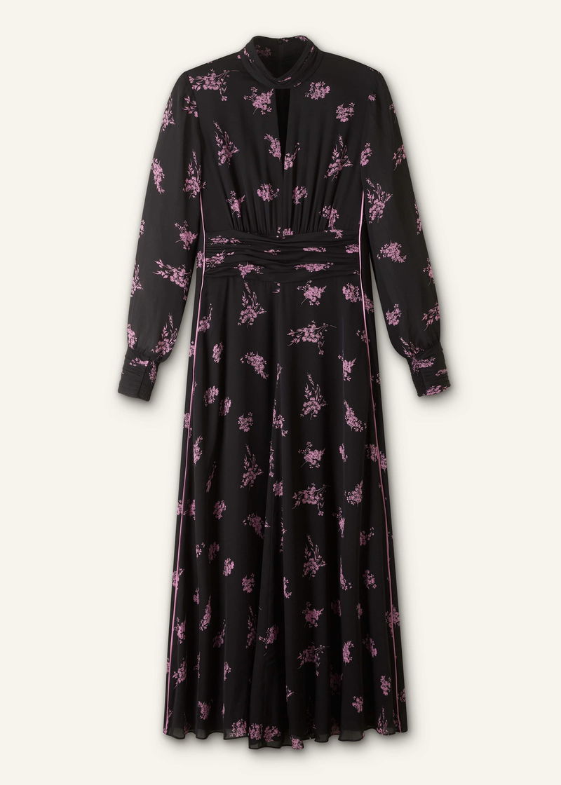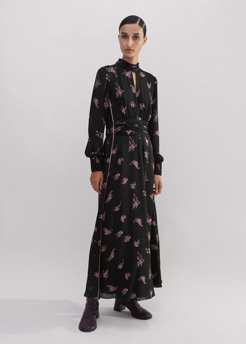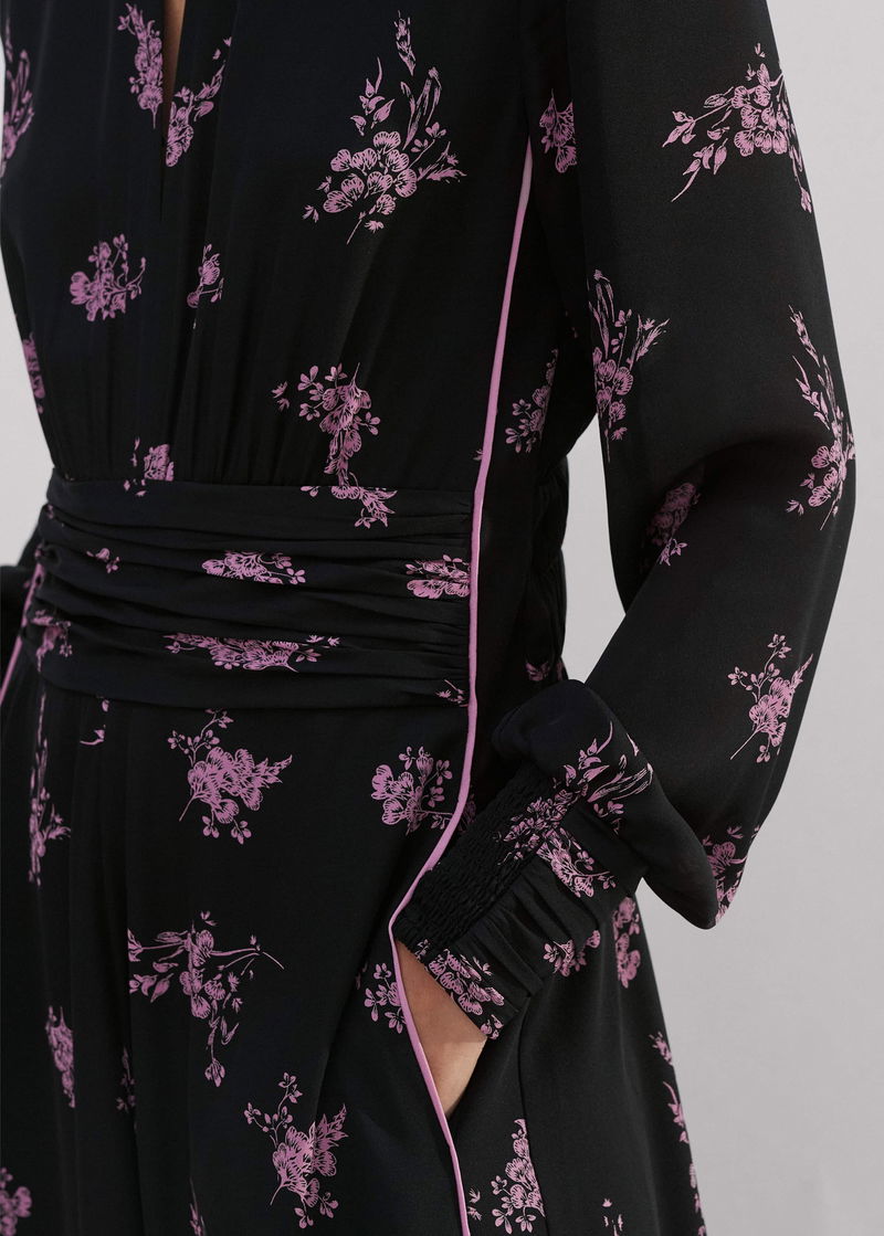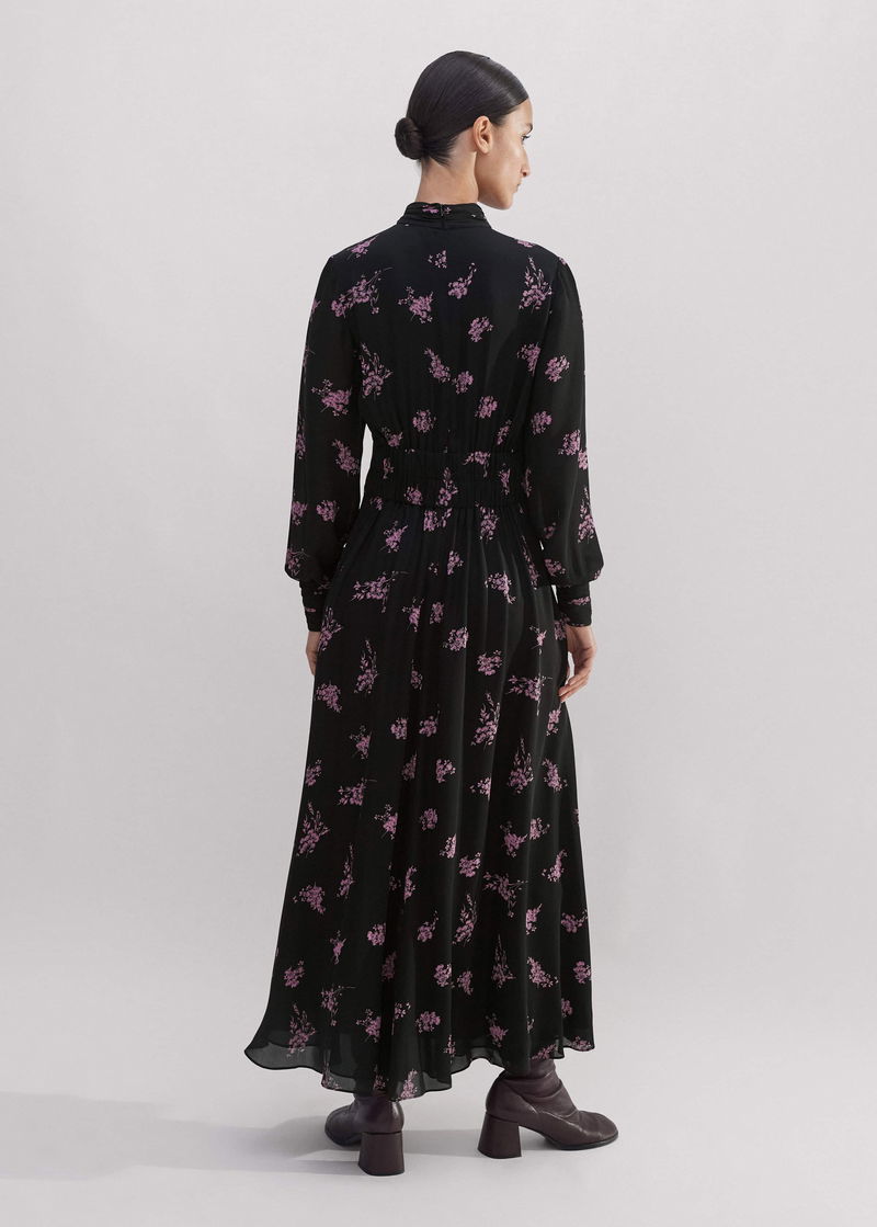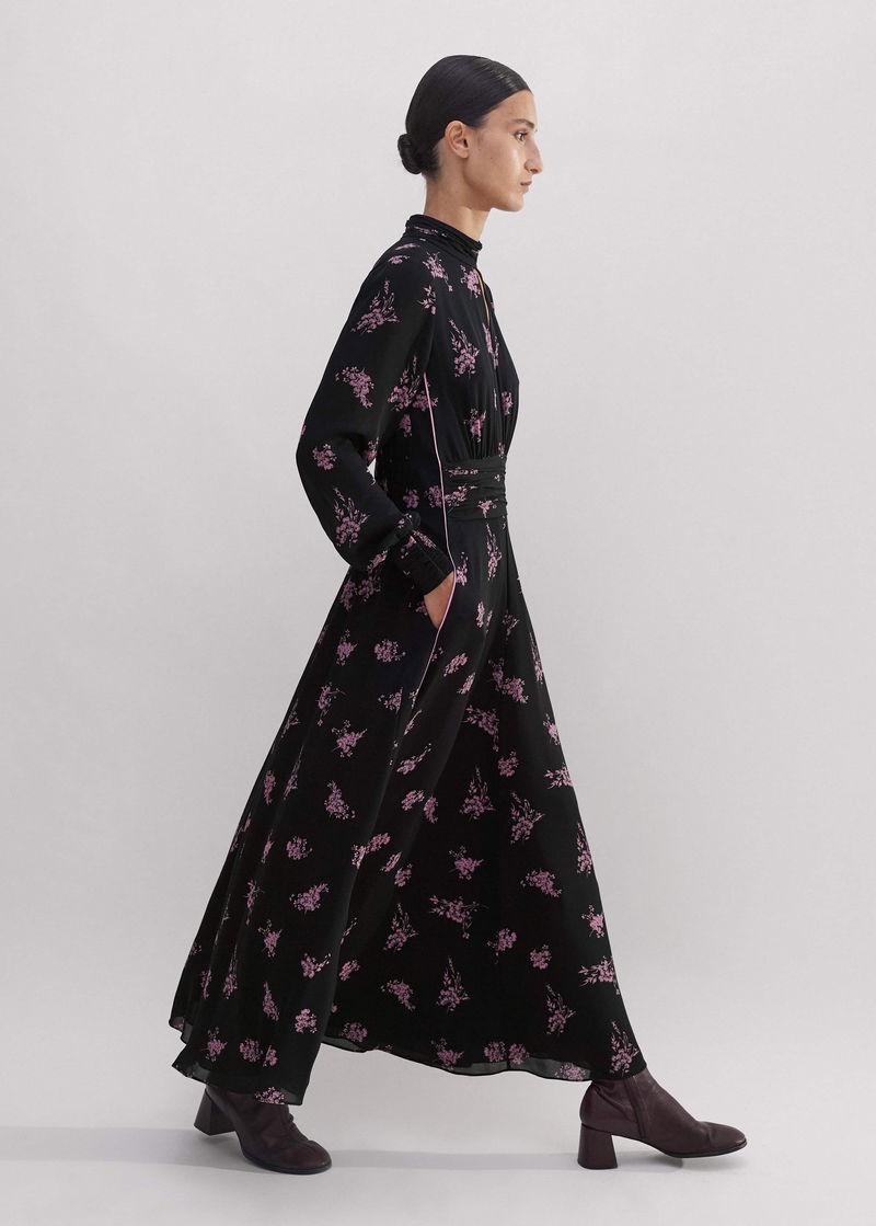Silk Scattered Floral Print Maxi Dress Black/Fresh Lavender Pink