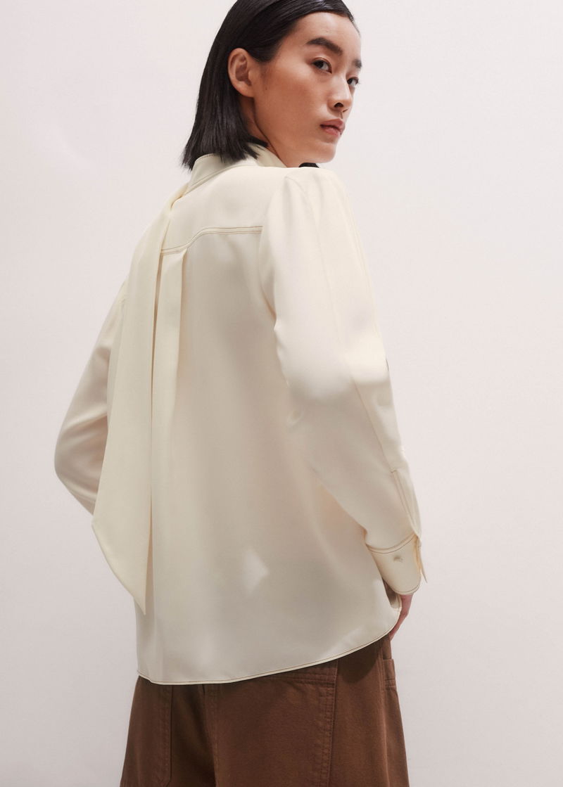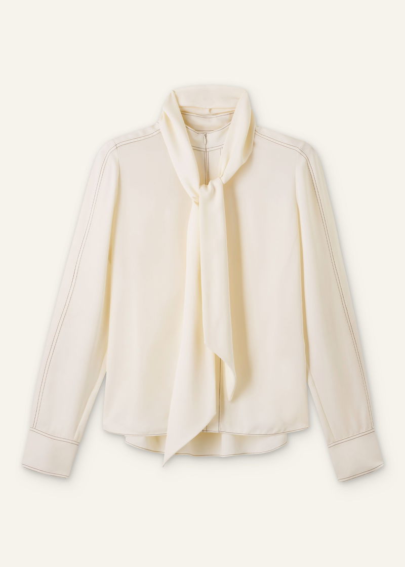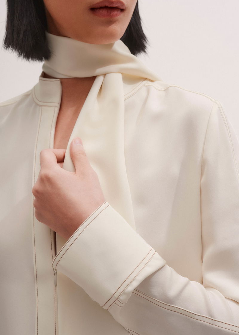 Silk Topstitched High Neck Blouse + Tie Light Cream