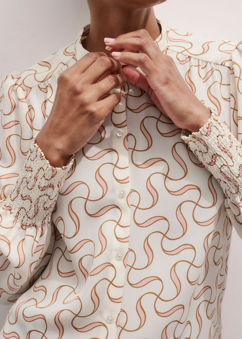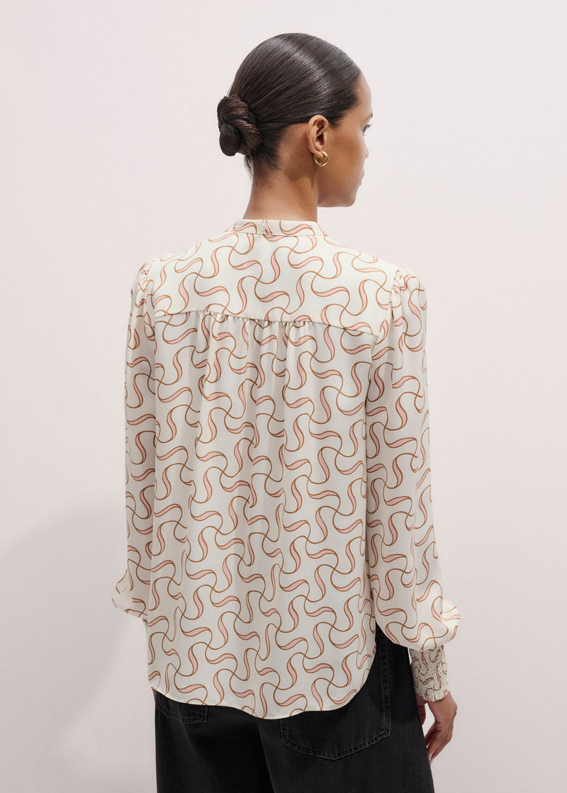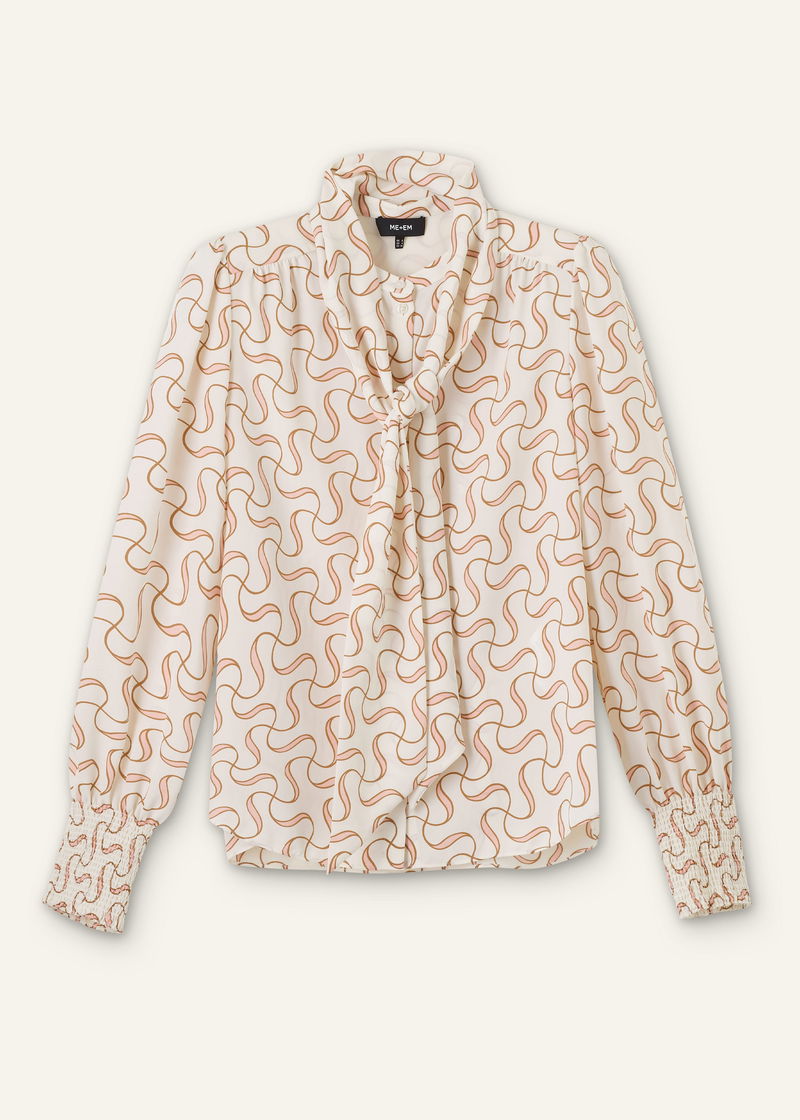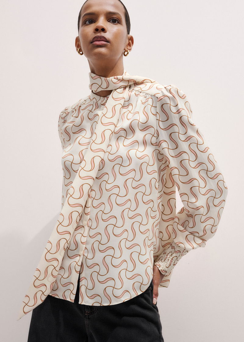 Silk Twisted Line Print Blouse + Tie Light Cream/Multi