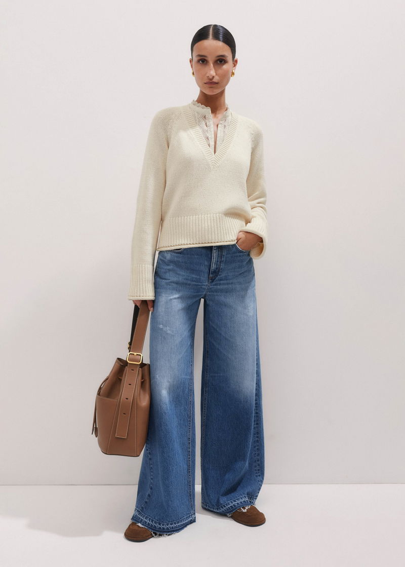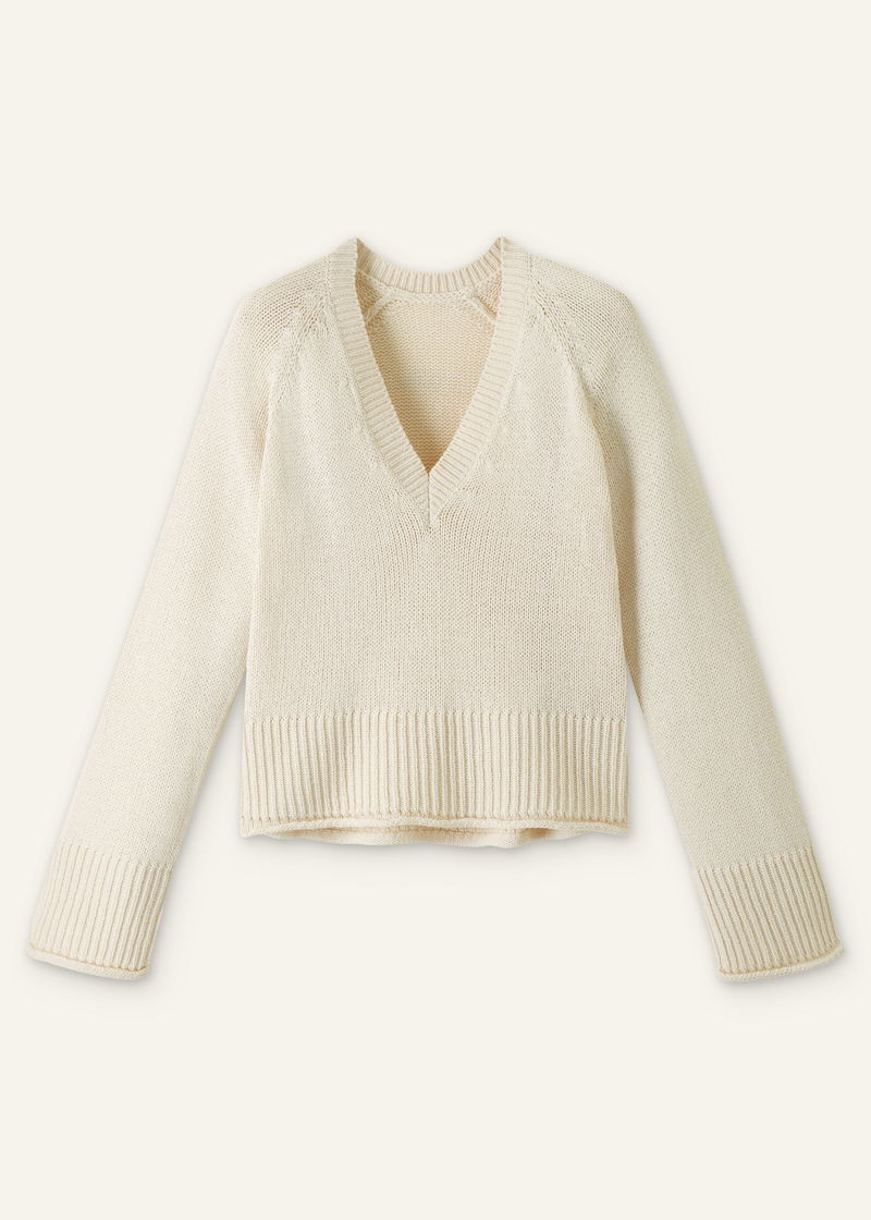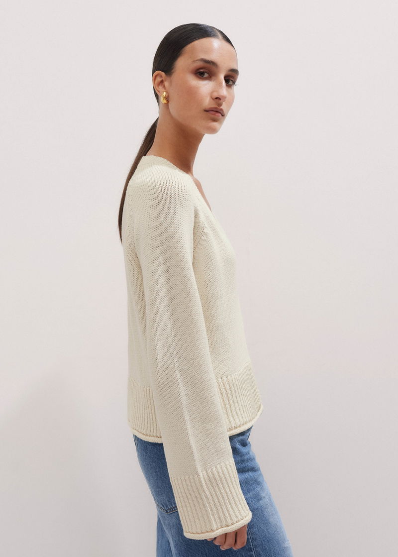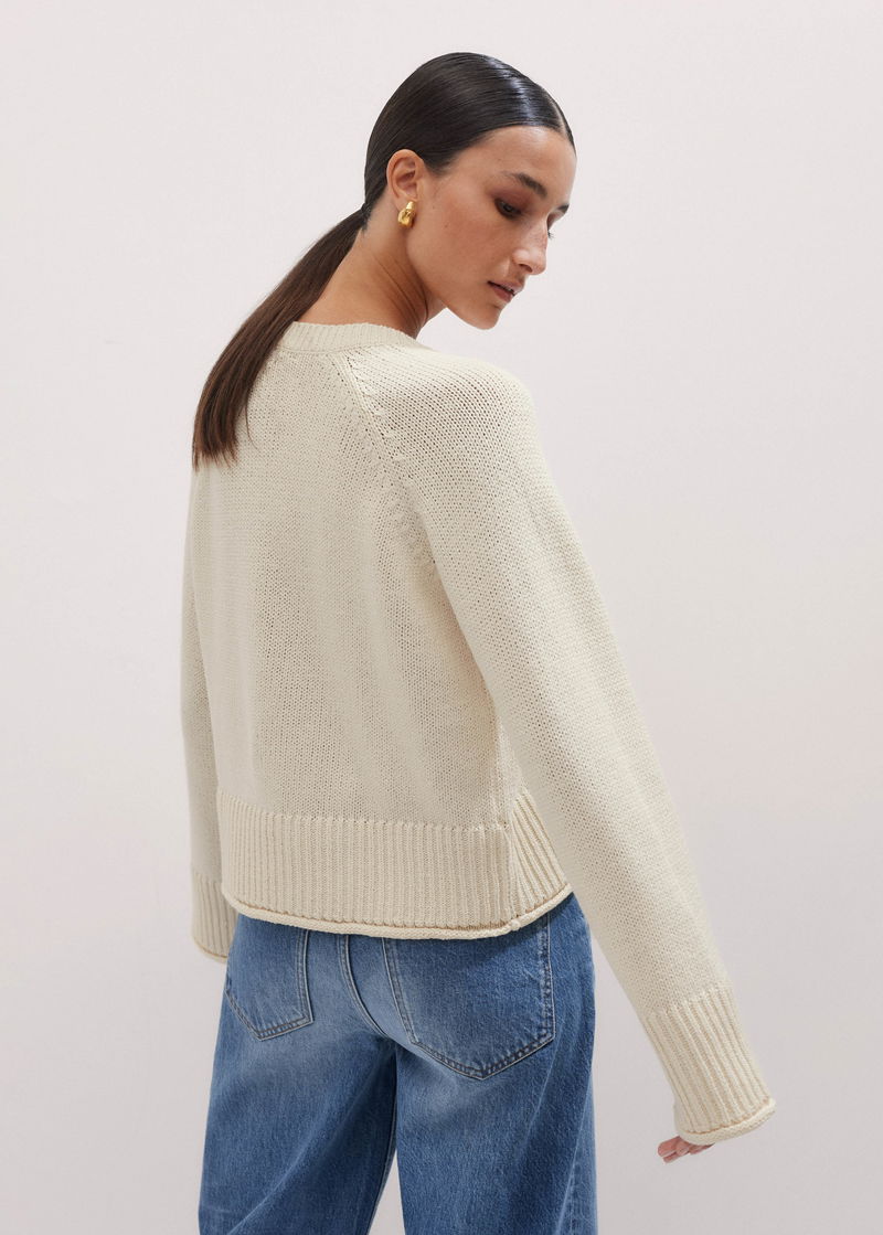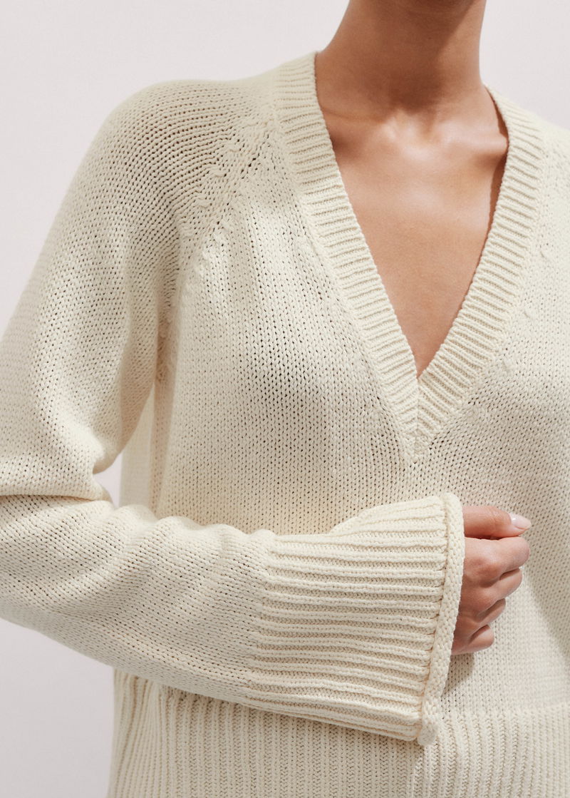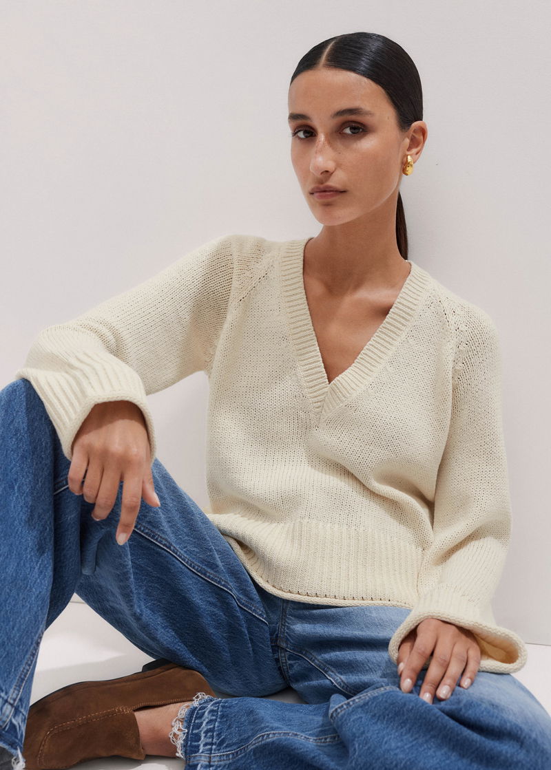 ME+EM's Cream Slouchy Cotton Crop V-Neck Jumper has a transeasonal finish to accommodate styling in both the warmer springtime and the winter months.