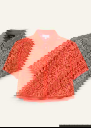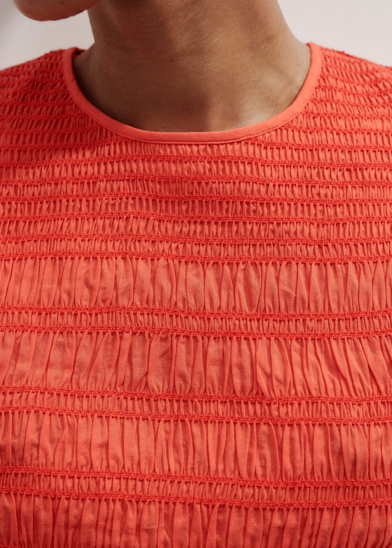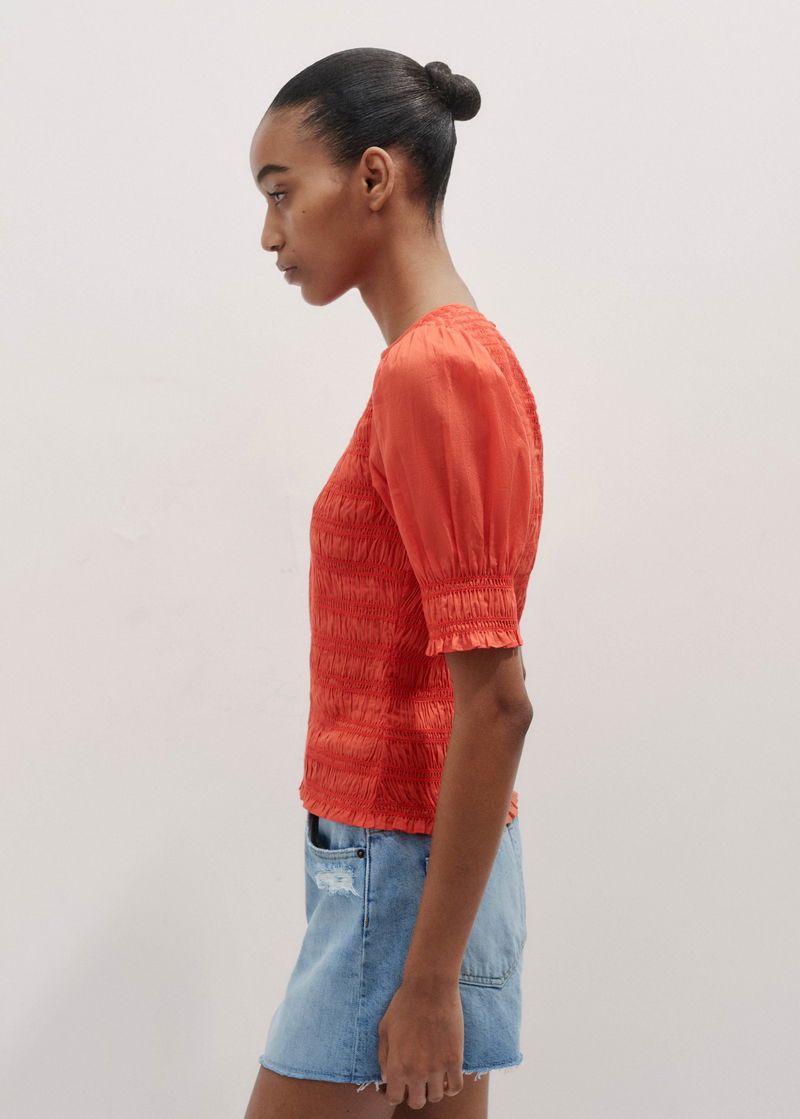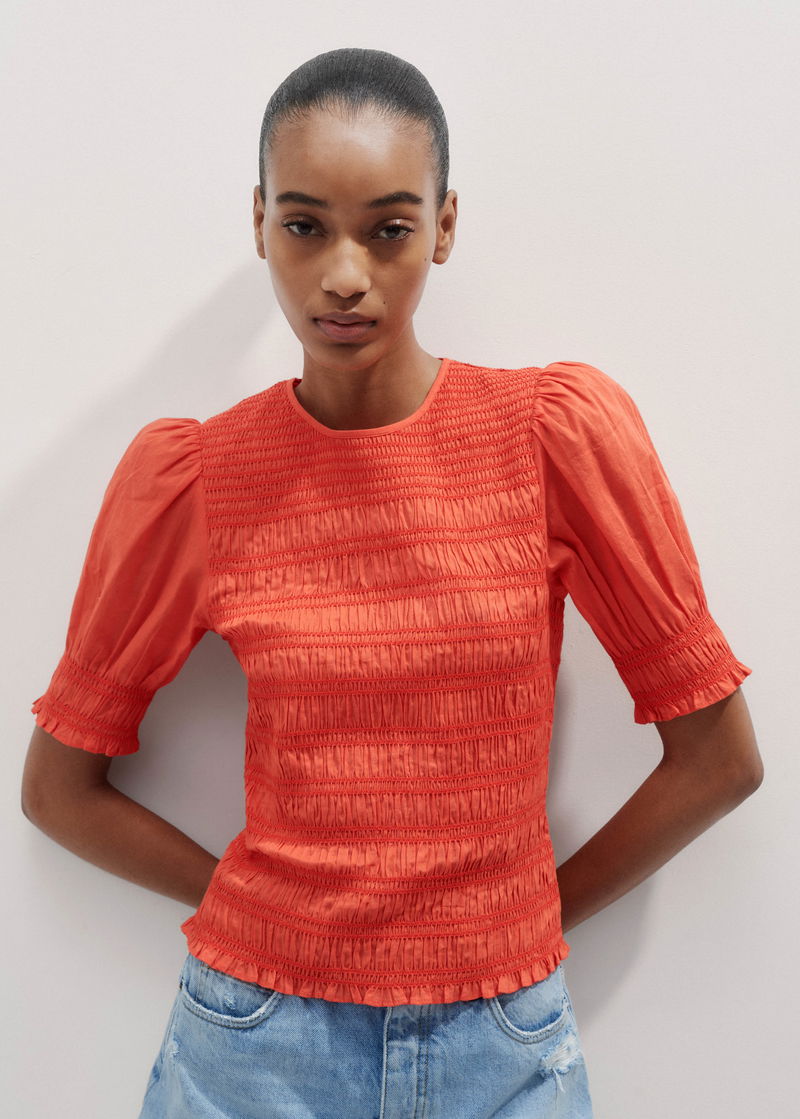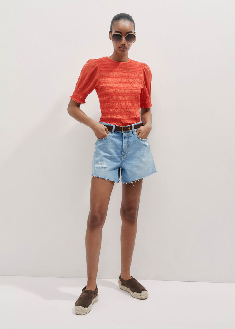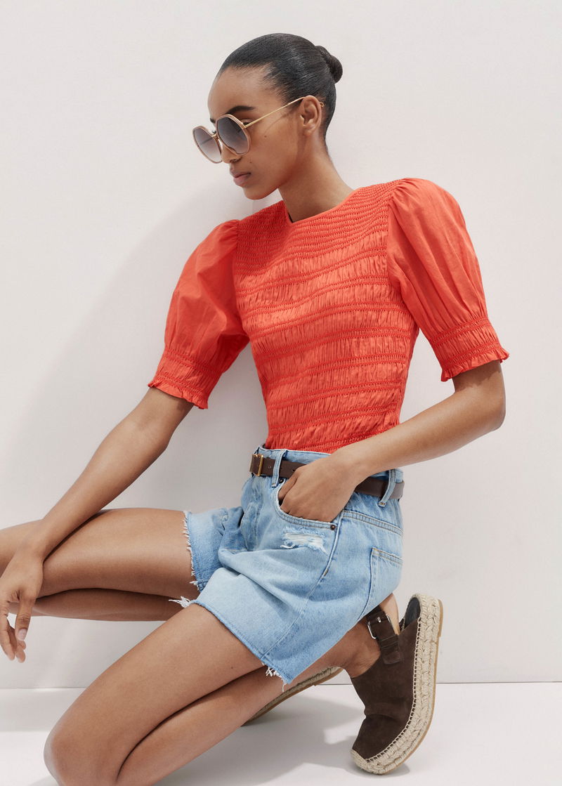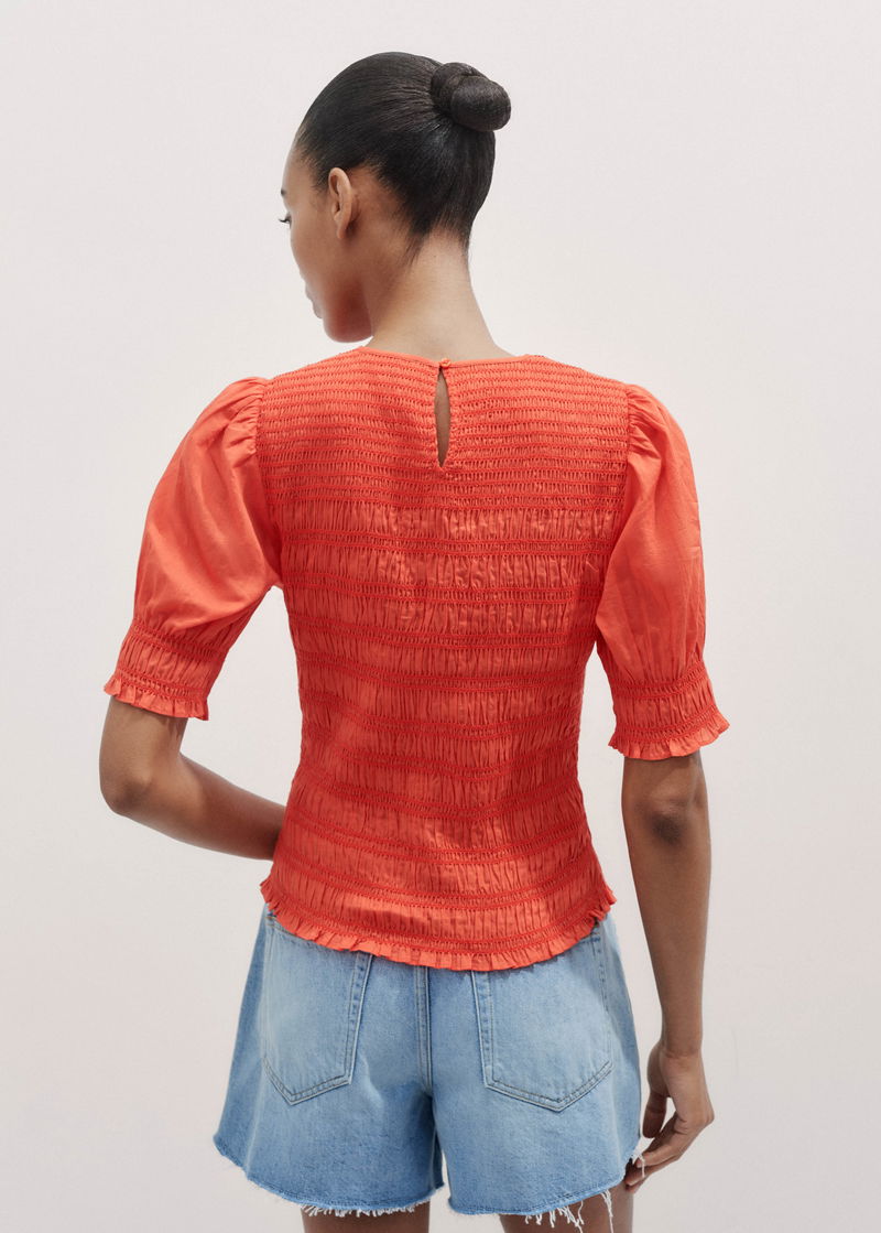 ME+EM's Orange Soft Cotton Poplin Contrast Stitch Top features ruffled trims at the cuffs and hem which add an extra feminine touch. Shop now.
