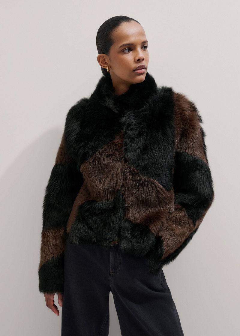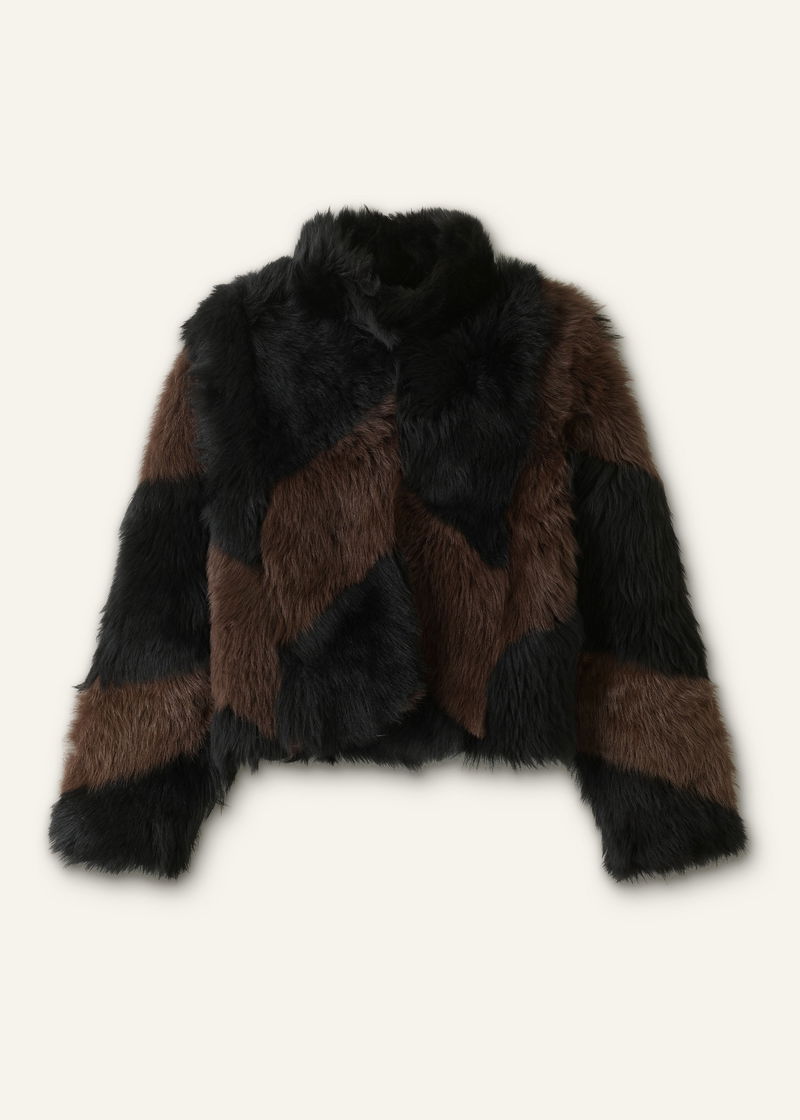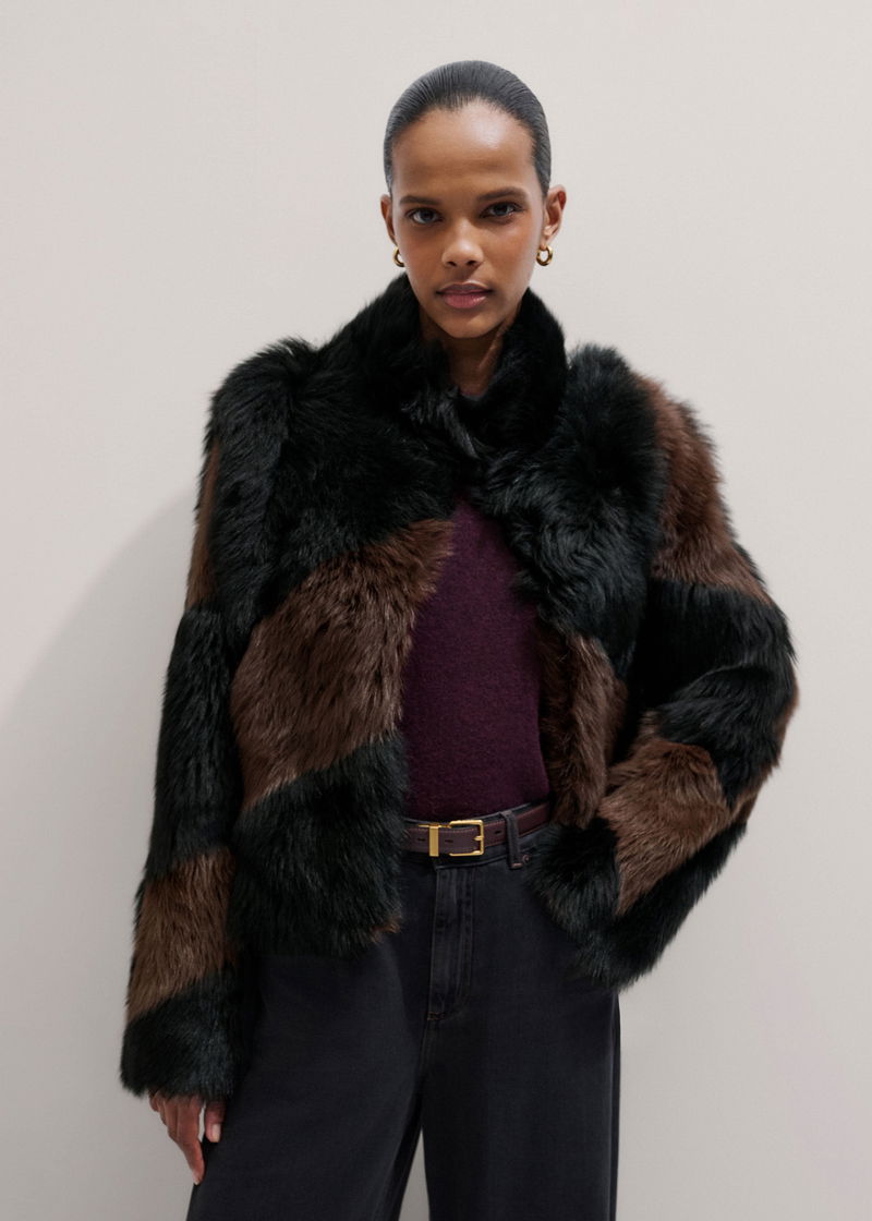 ME+EM's Brown Luxe Patchwork Coat is made from a blend of Chocolate and Black shearling.