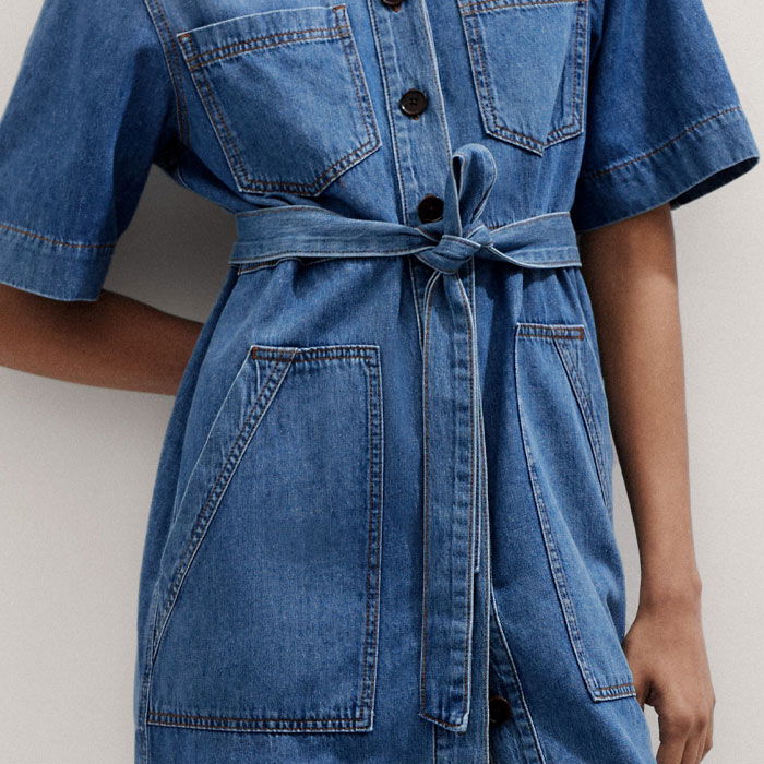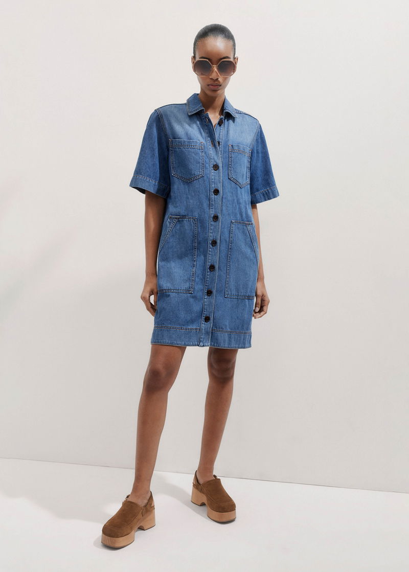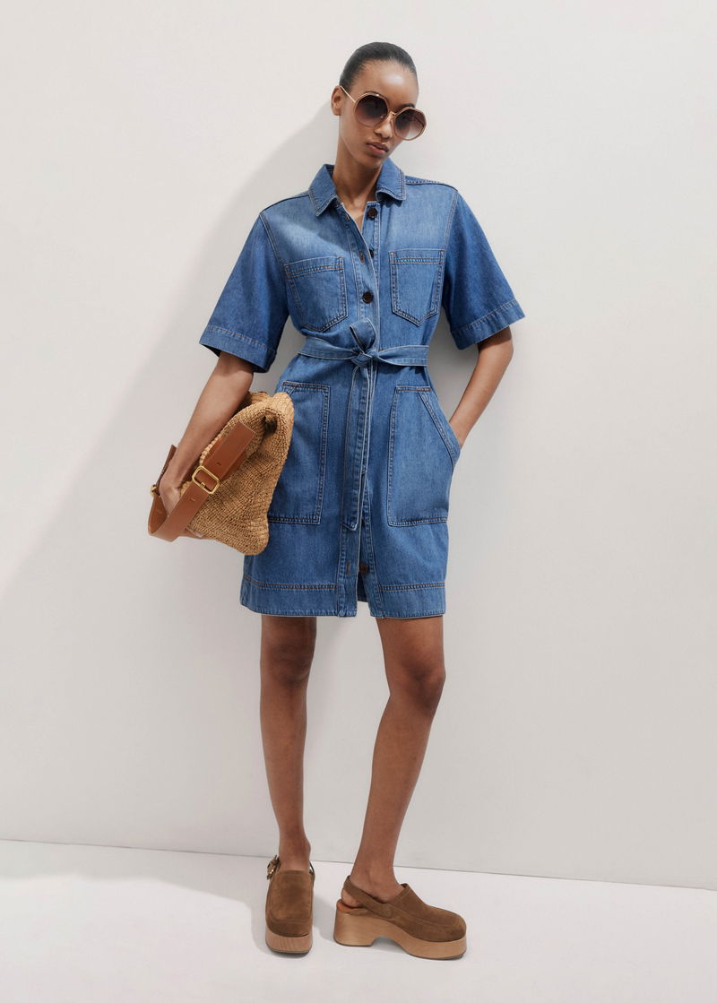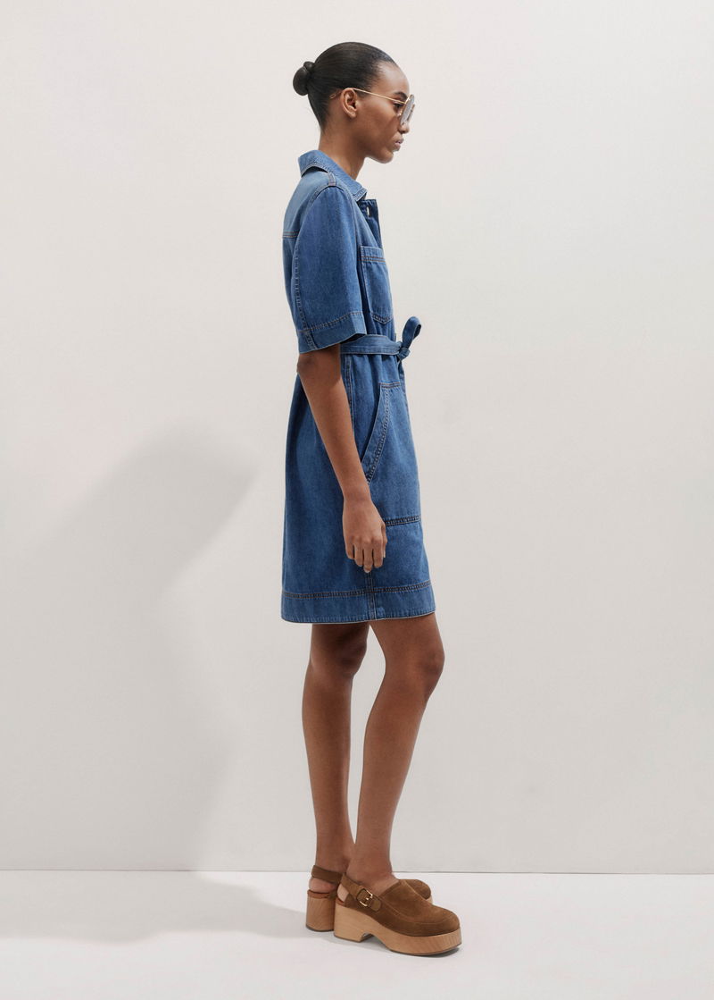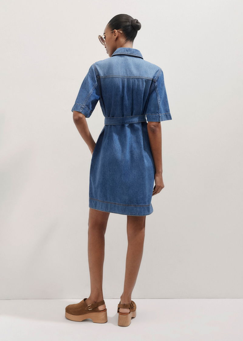 Straight Boxy Denim Short Shirt Dress + Belt Washed Mid Blue