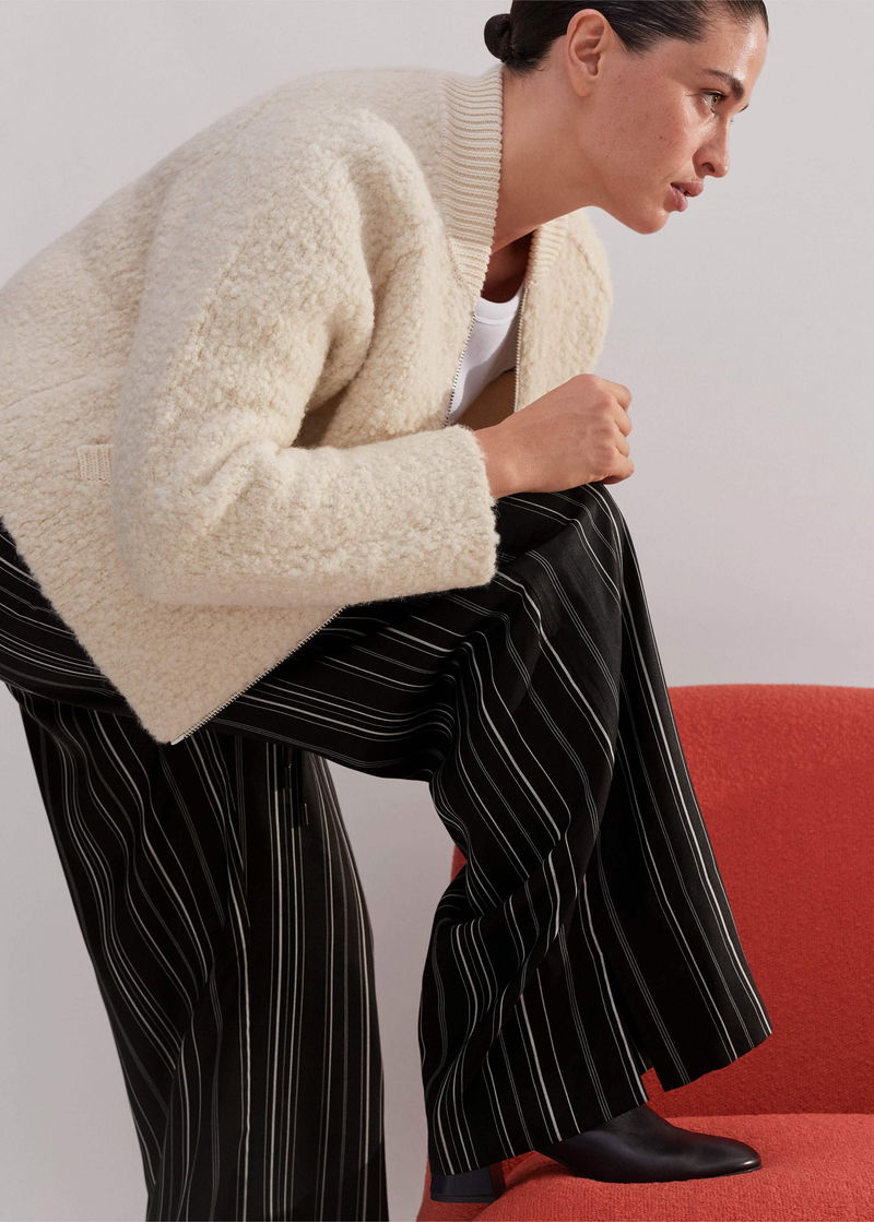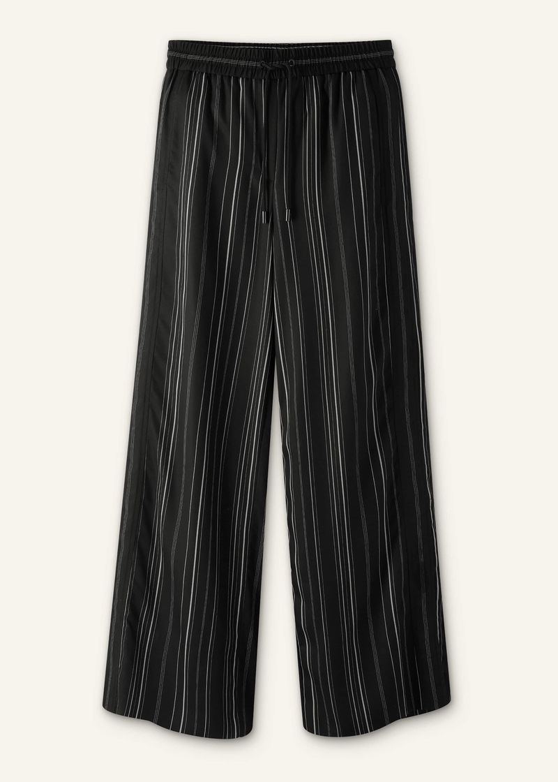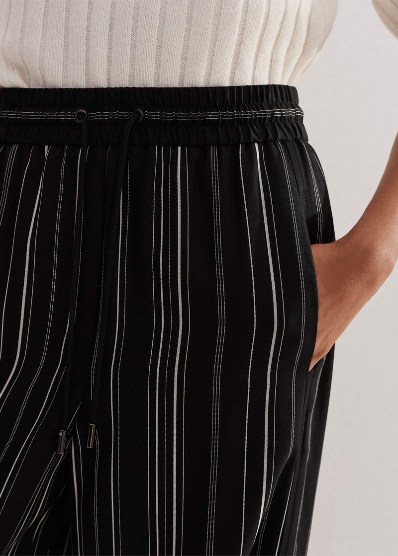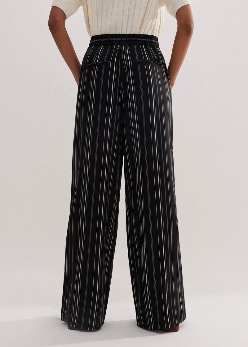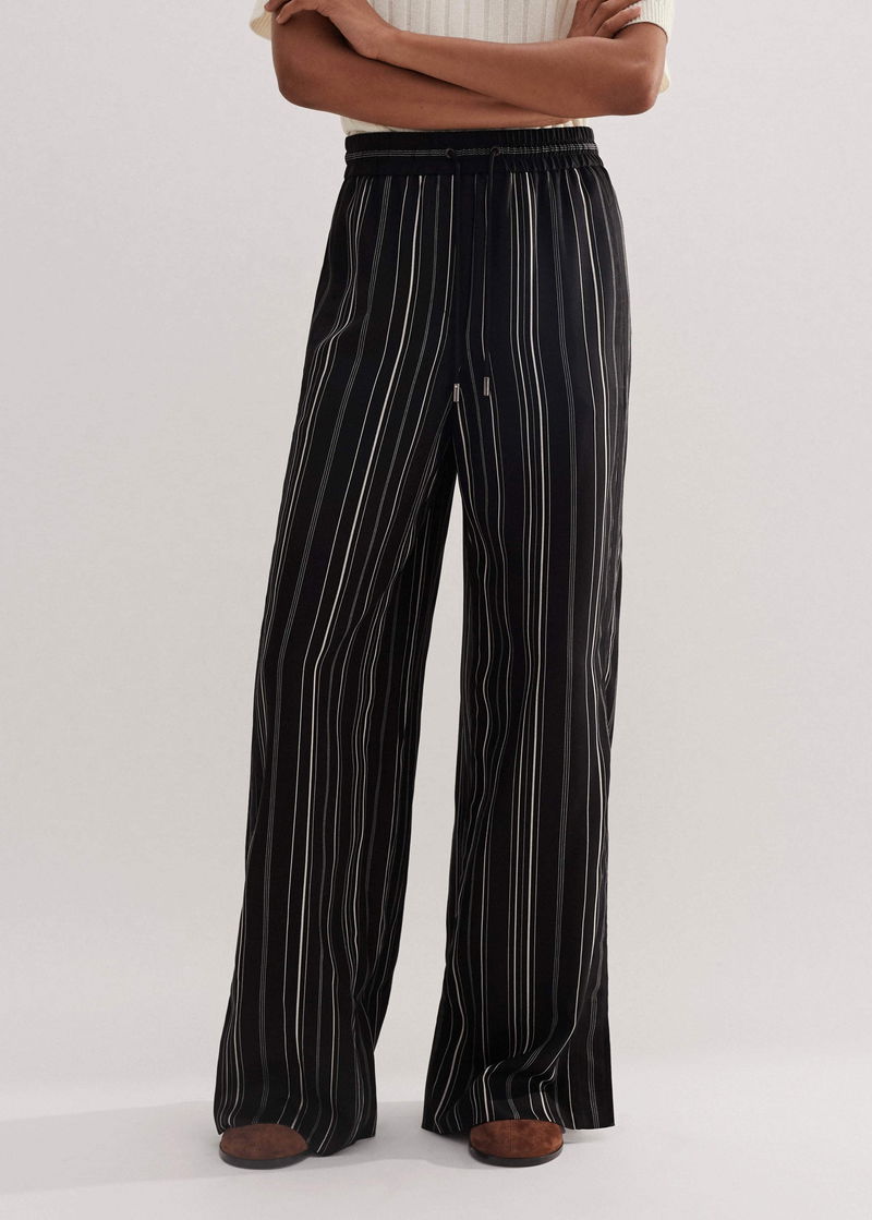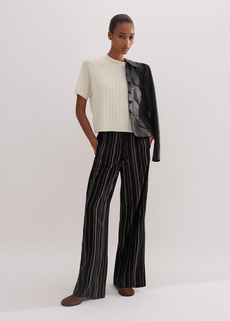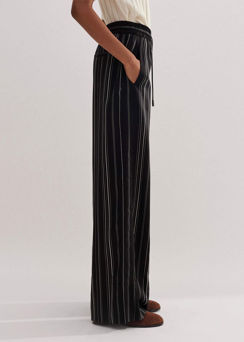 ME+EM's Black Stripe Trouser is cut to a wide-leg silhouette and falls to a small split at the hem for a fluid drape.