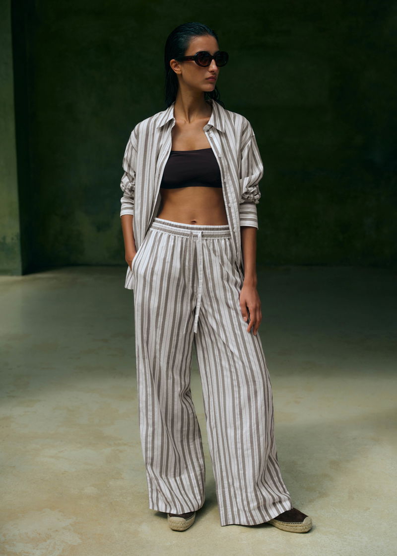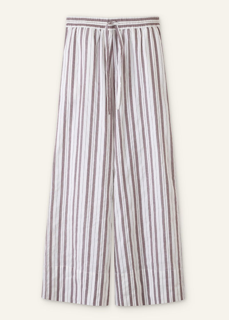 ME+EM's White Summer Stripe Drawstring Beach Trouser is crafted from lightweight textured cotton with a soft chocolate brown stripe.