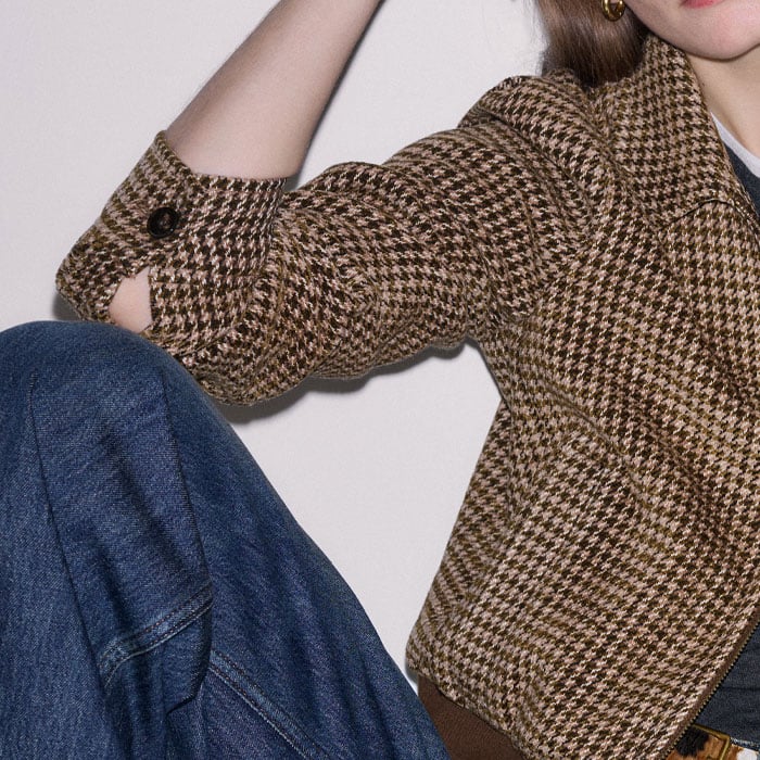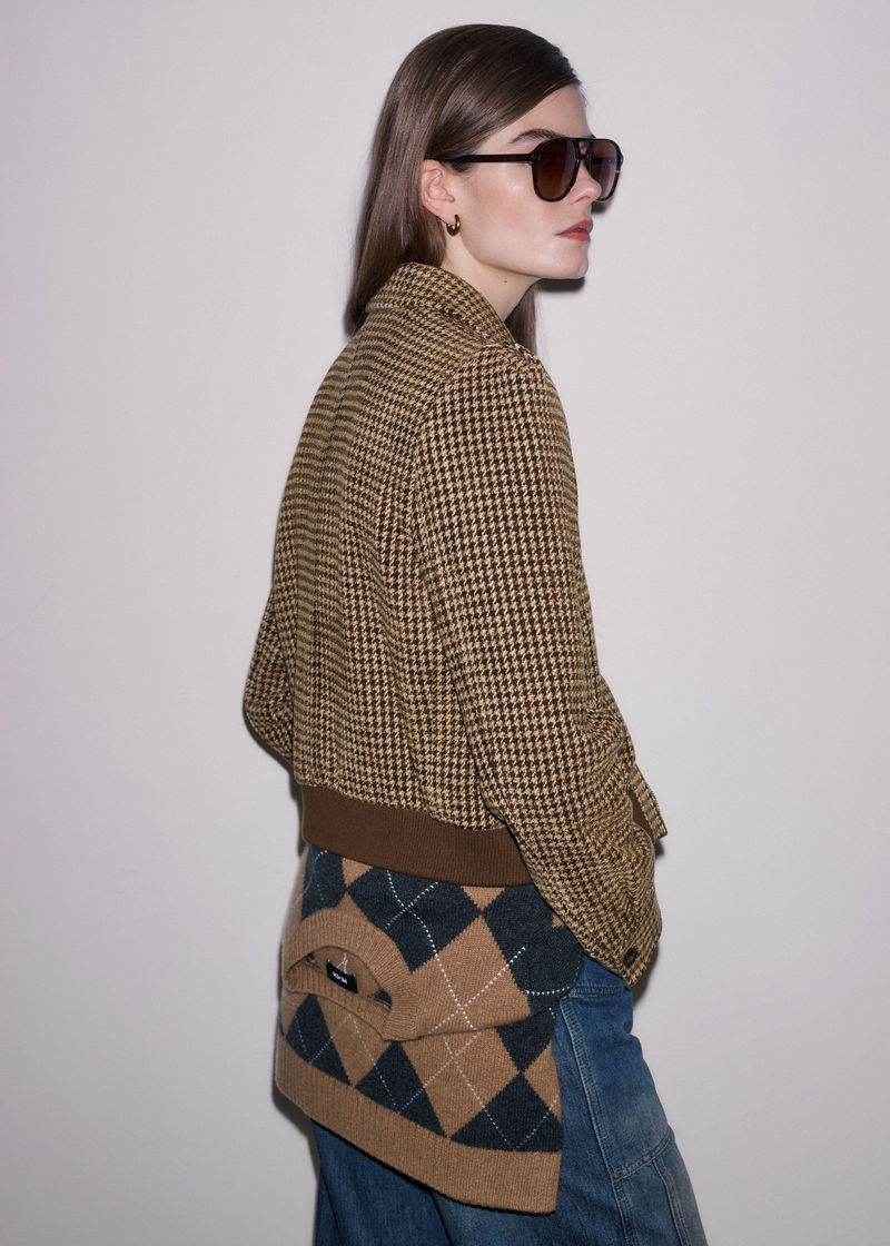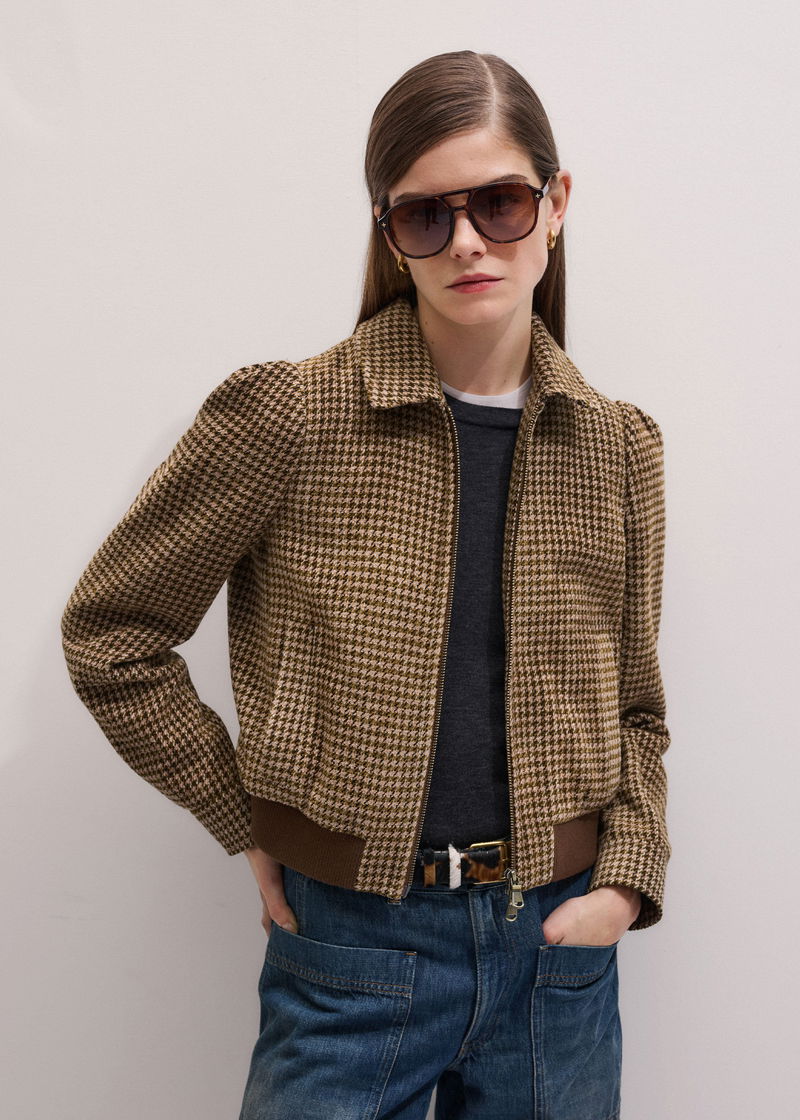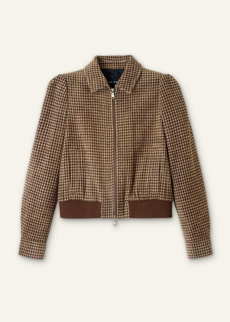 ME+EM's Brown Super Soft Houndstooth Bomber Jacket is made from an Italian wool-blend with a contrasting ribbed hem for a soft contrast in shapes.