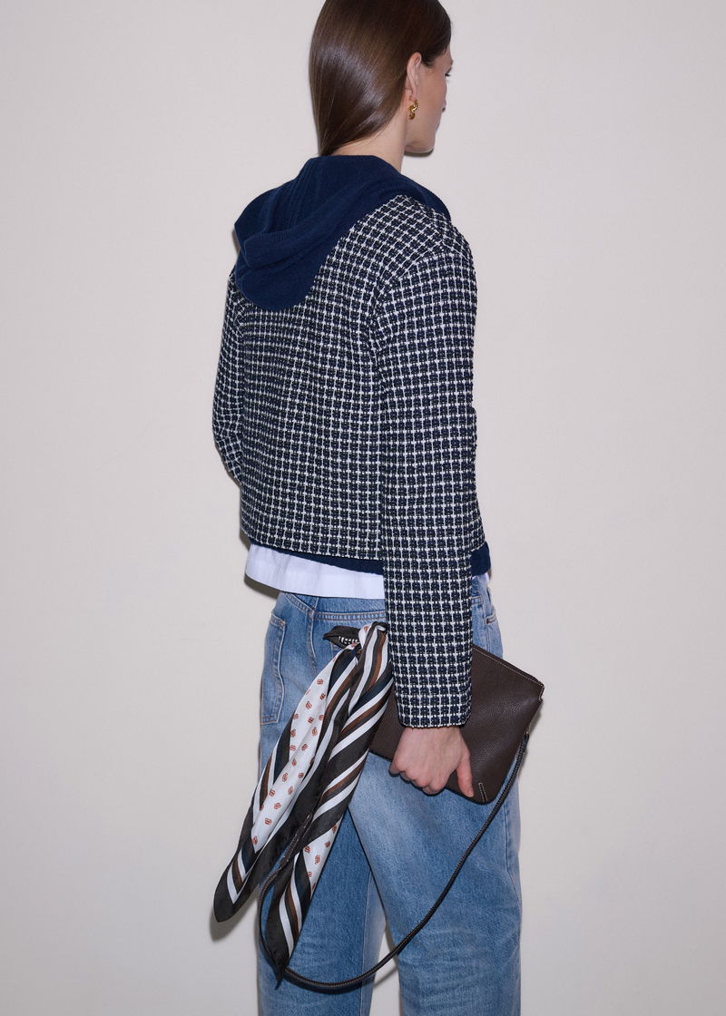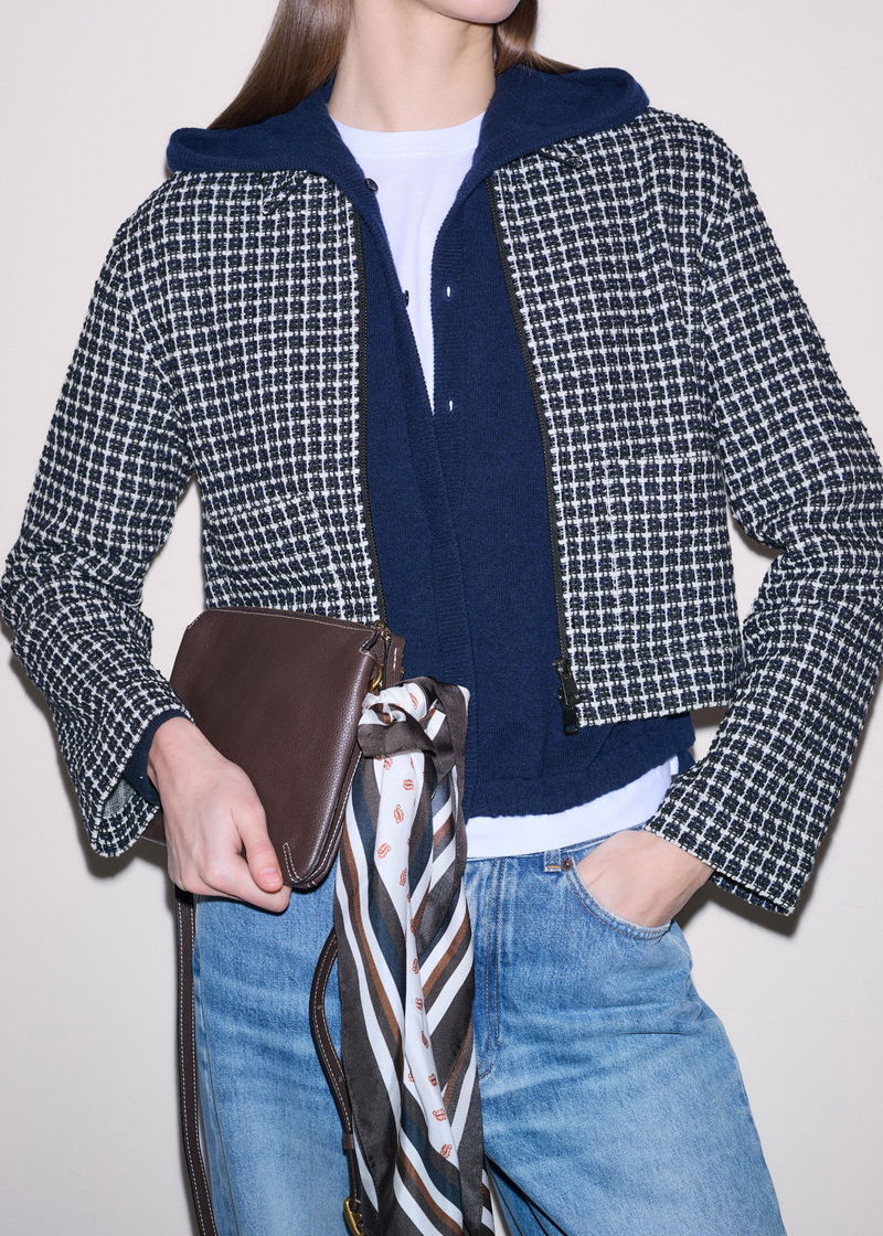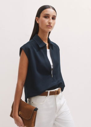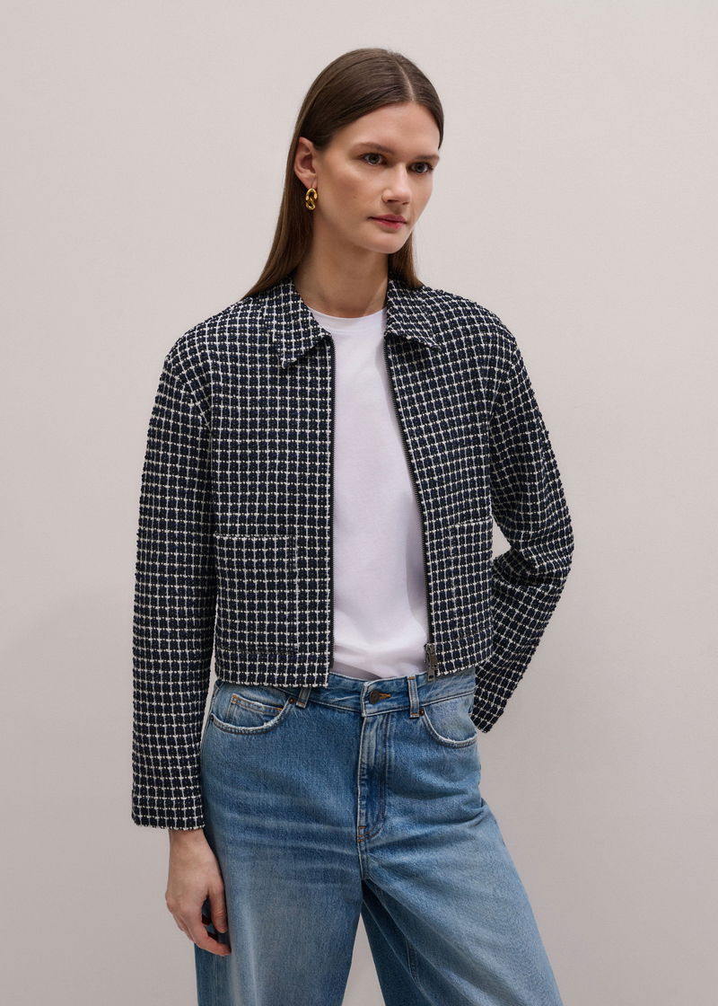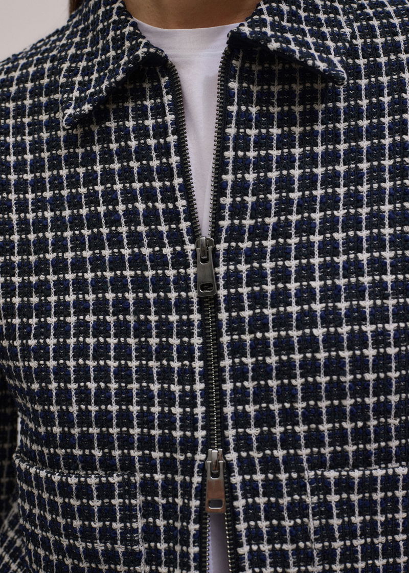 ME+EM's Navy Textured Zip-Front Relaxed Top is crafted from textured jacquard jersey with a graphic navy tweed finish.