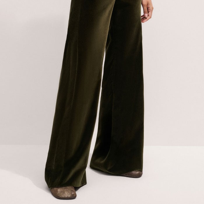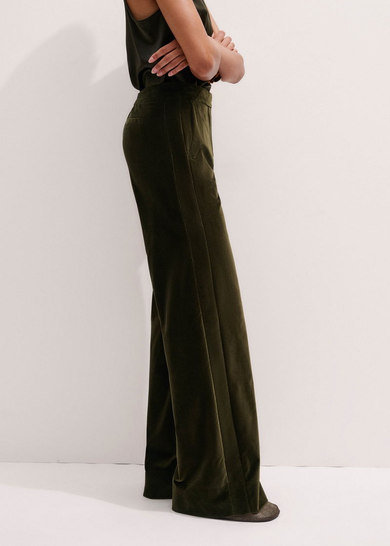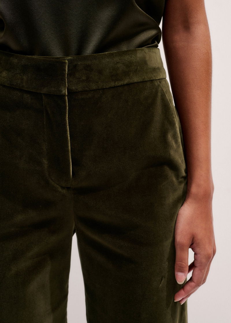 ME+EM's Olive Green Velvet Evening Man Pant is designed with a fitted waist which elongates the leg and gives the illusion of height.
