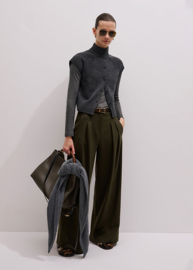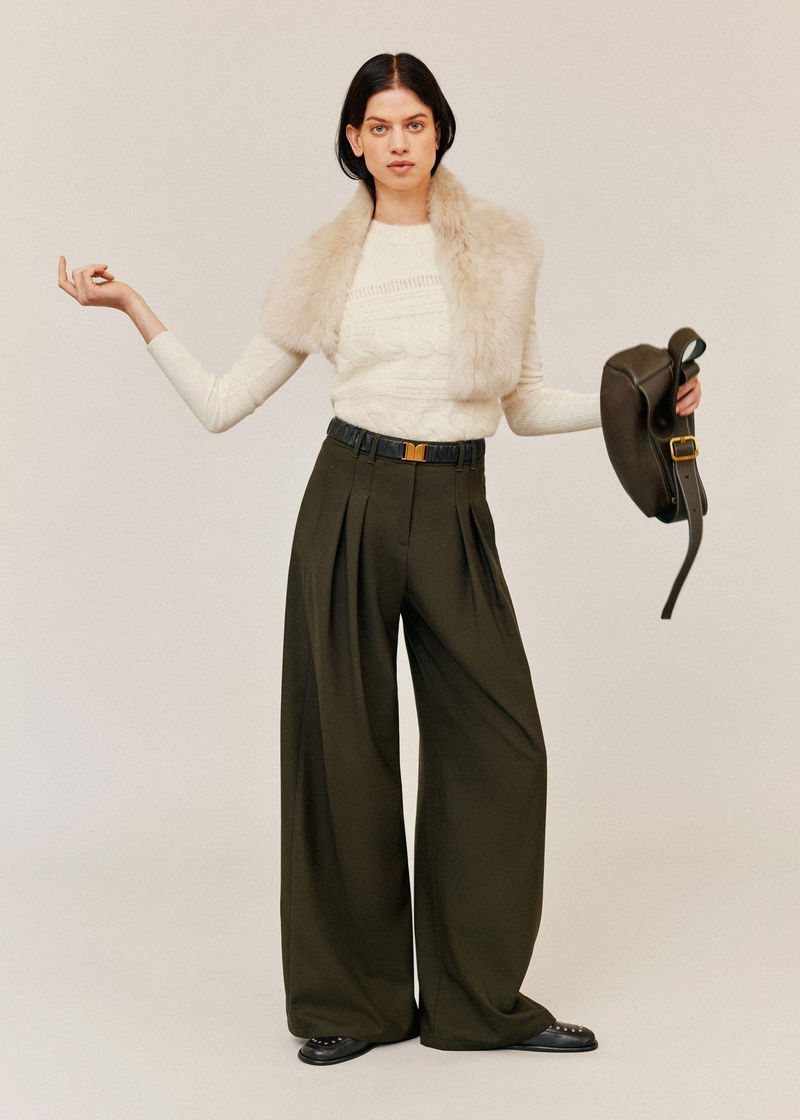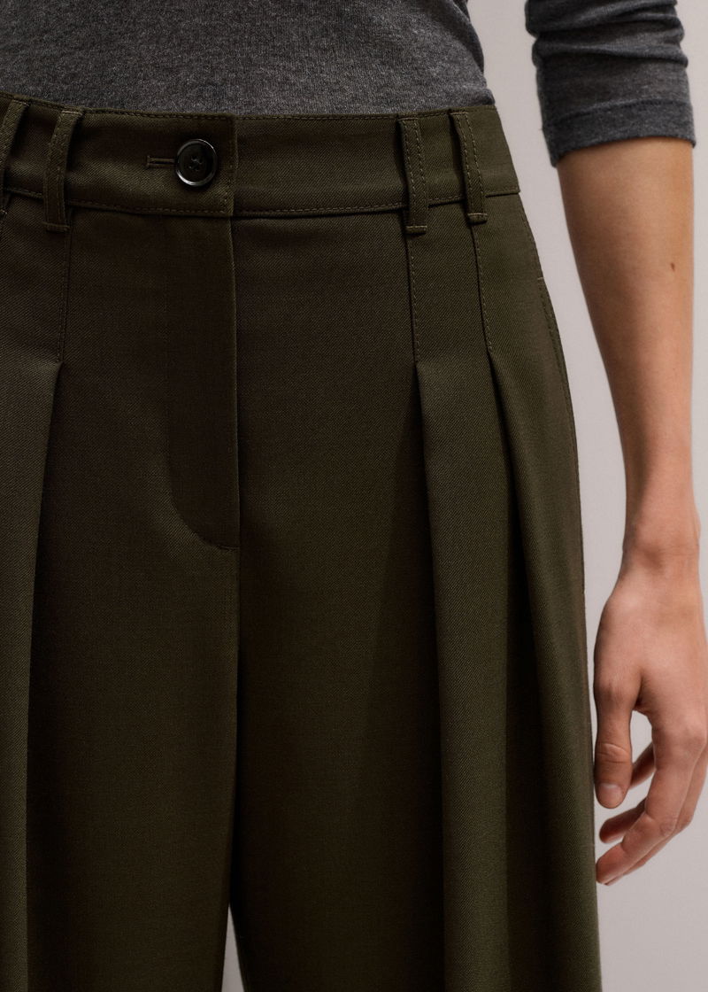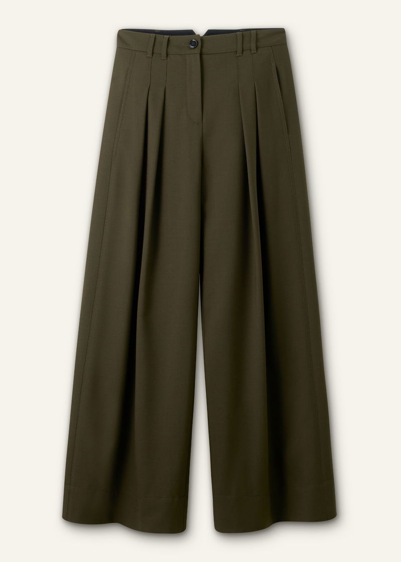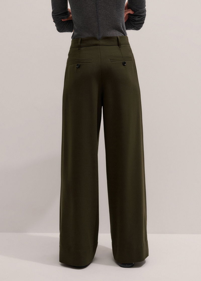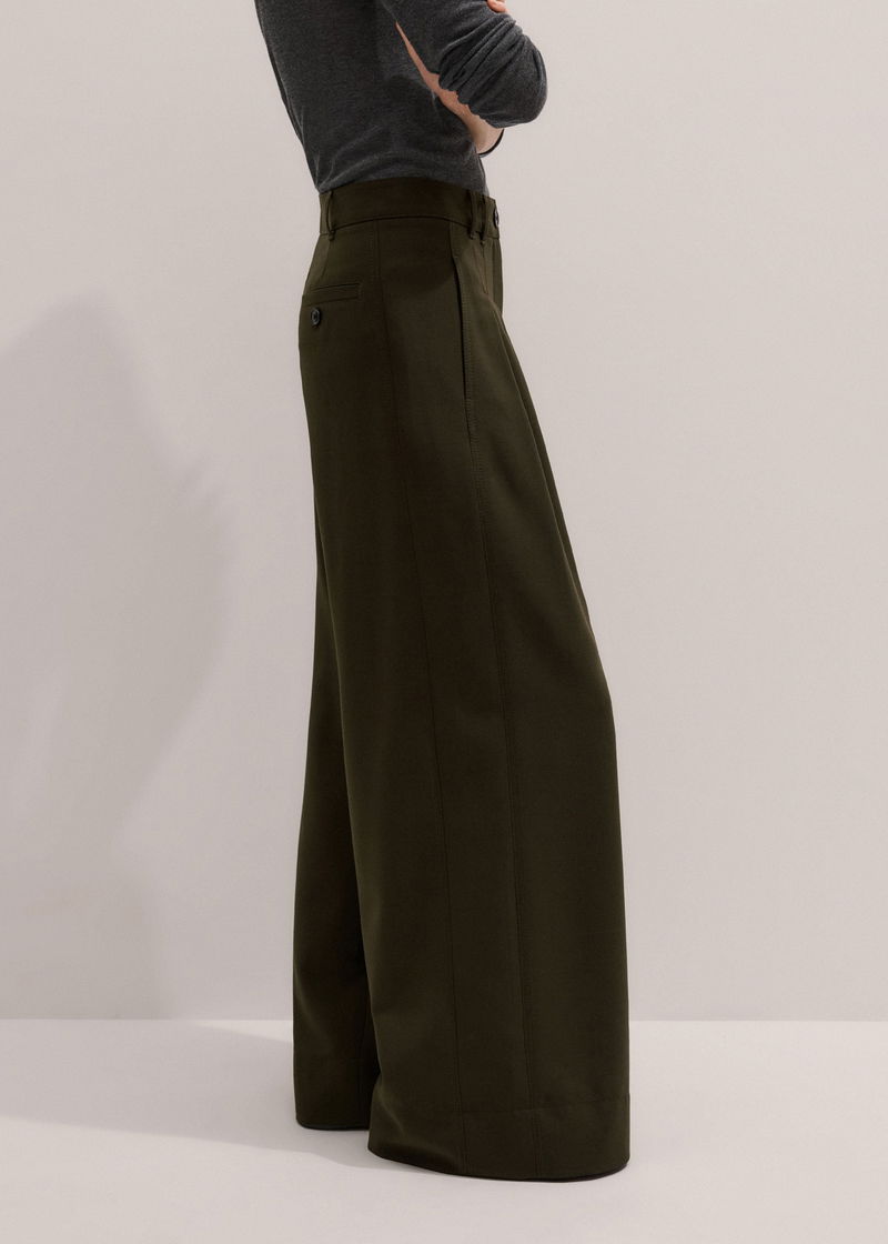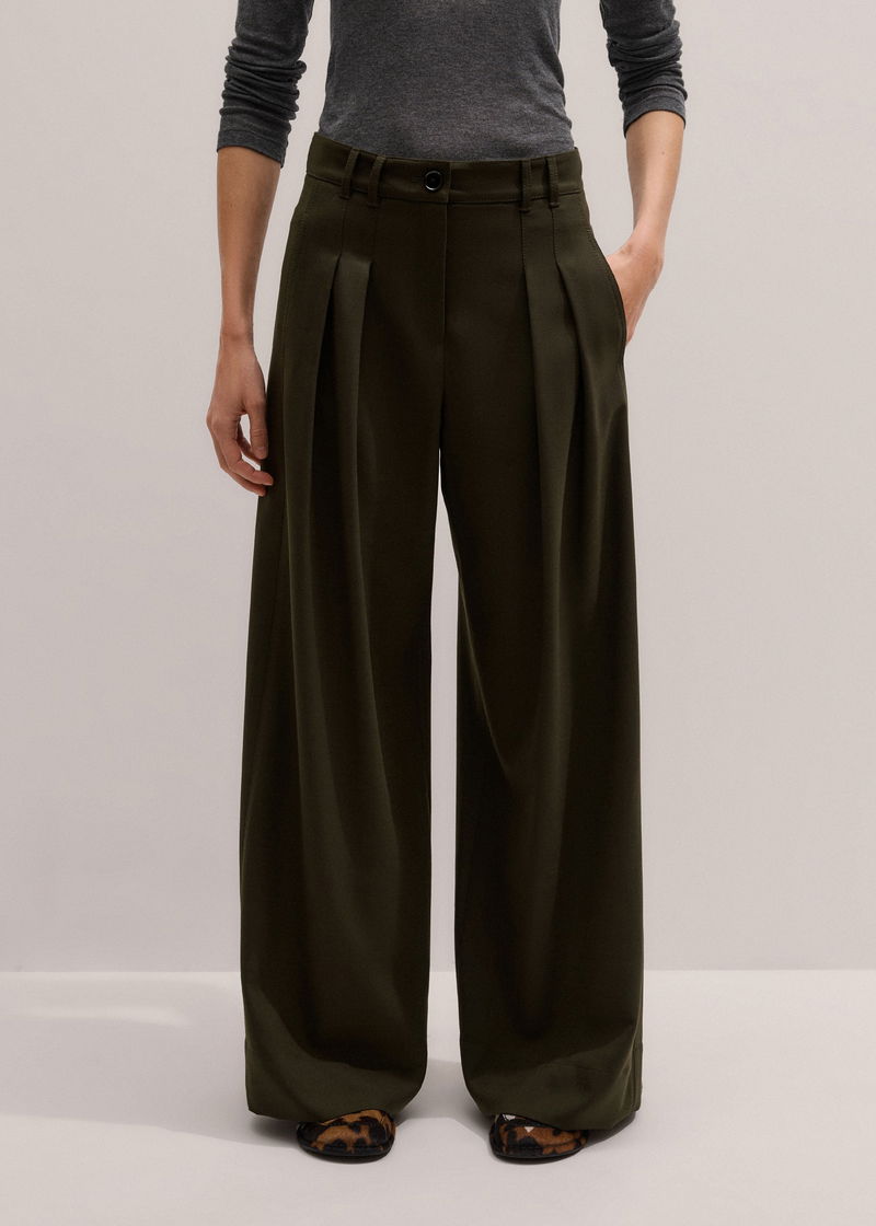 ME+EM's Olive Green Wide-Leg Double Pleat Trouser is suspended from a mid-rise waistband that falls to expertly placed pleats.