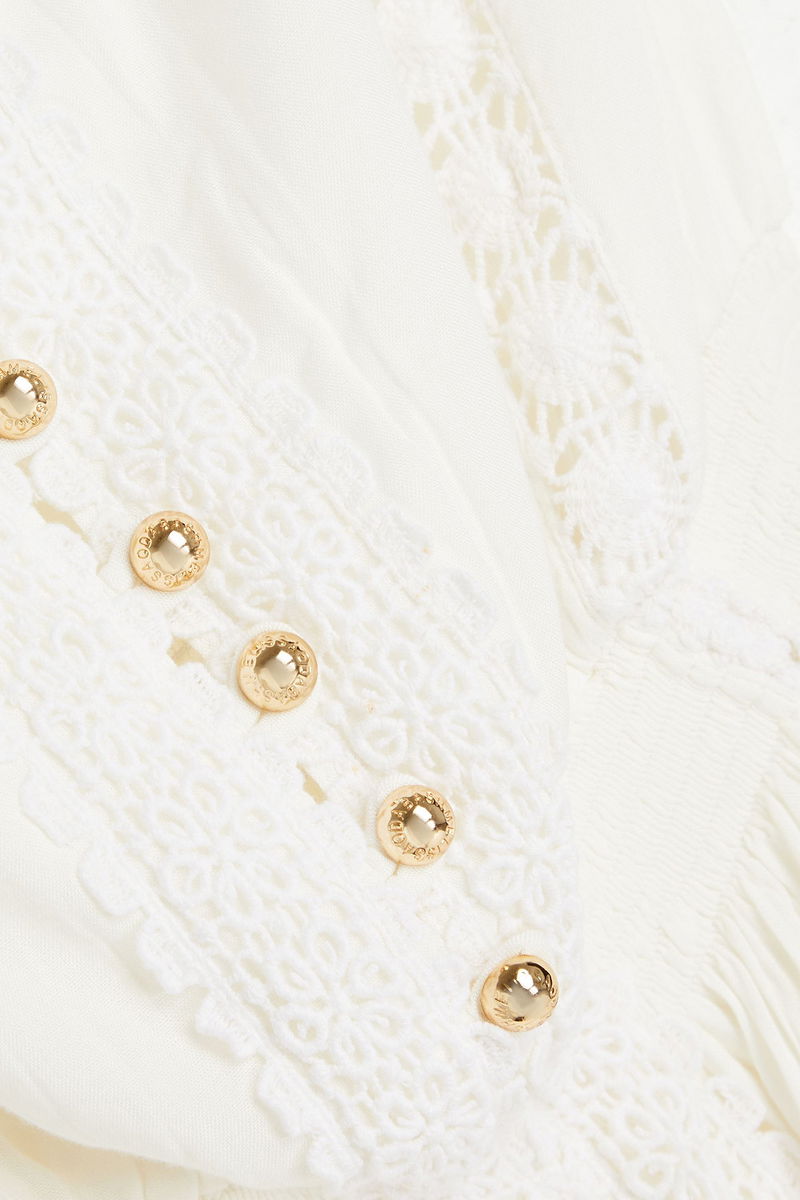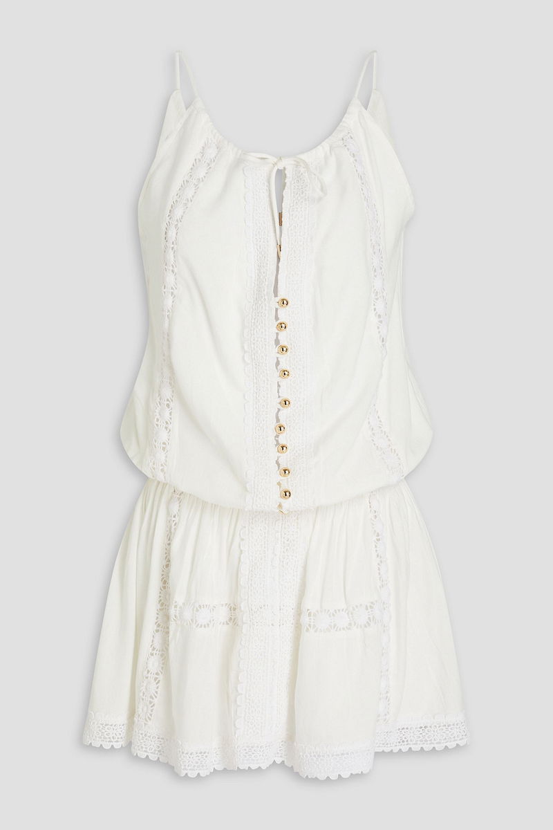 Dress. Voile. Button-detailed. Crocheted lace trims. Elasticated waist. Tie-fastening keyhole at front. Non-stretchy fabric. Mid-weight fabric.