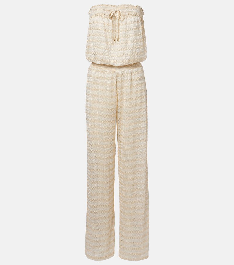 After working as a swimwear model, Melissa Odabash used her experience to create designs that are equal parts stylish and comfortable. This wide-leg jumpsuit features a strapless silhouette with an elasticated waistband and semi-sheer lamé construction.