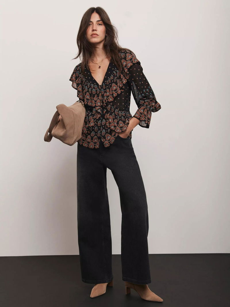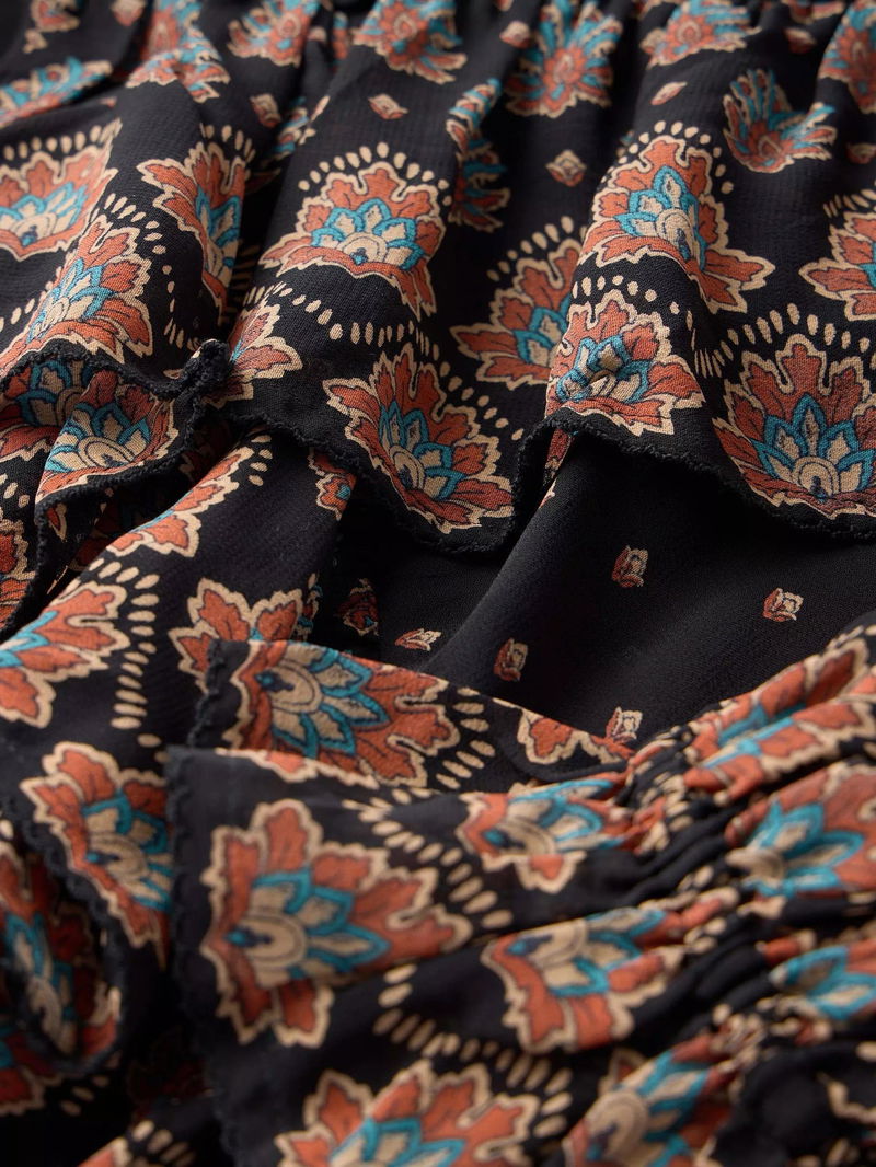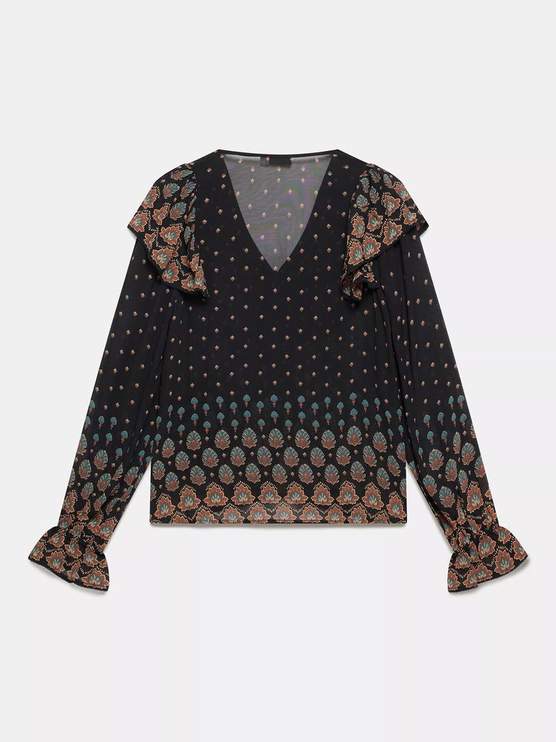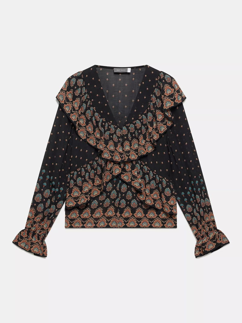 Abstract Paisley Ruffle Blouse, Black/Multi