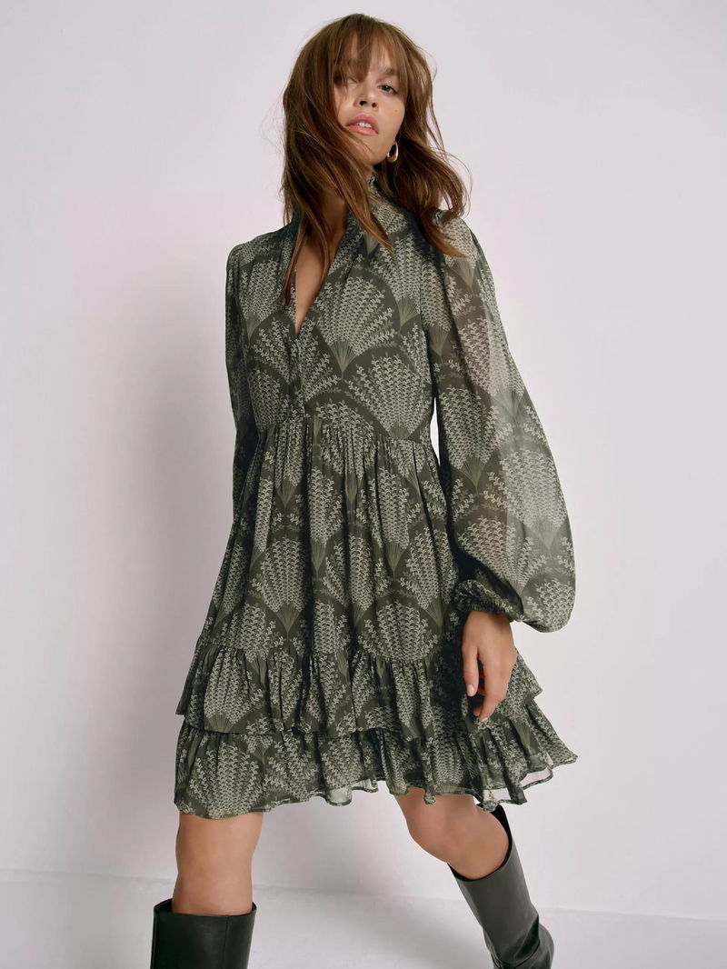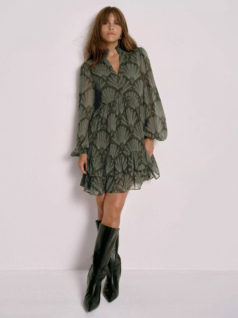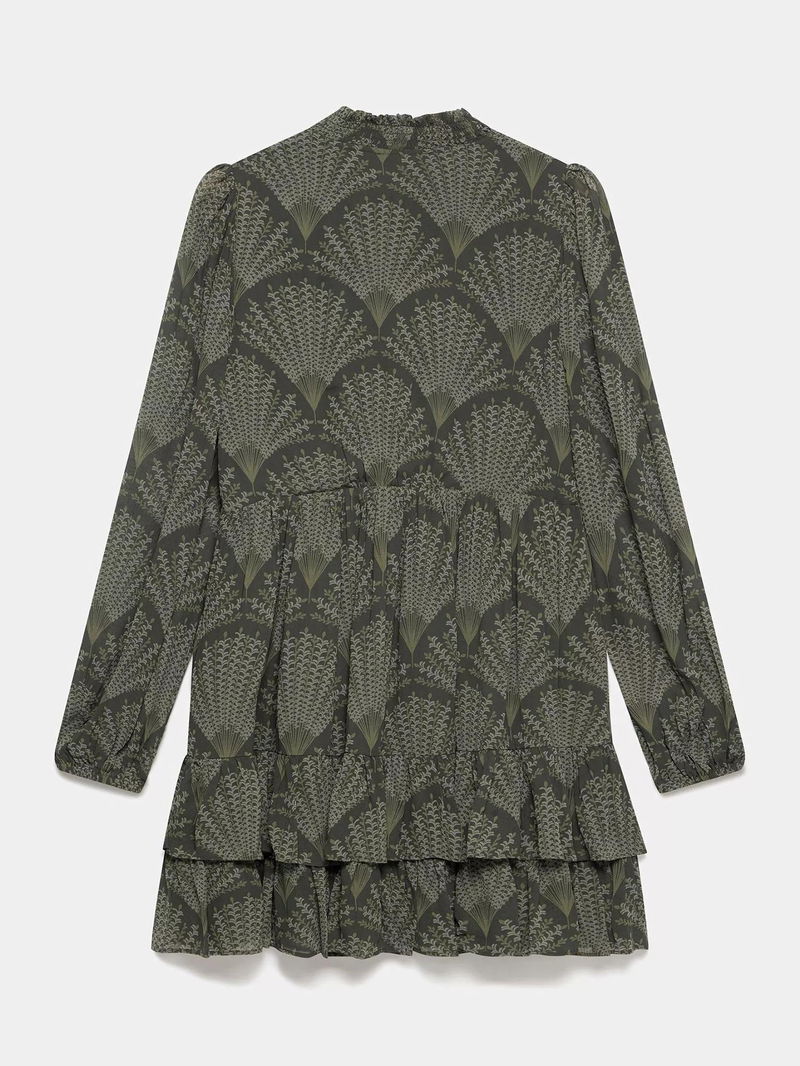 A printed dress in a mini silhouette featuring a V-neckline, shirred collar, puff shoulders, long sleeves, elasticated cuffs, layered ruffle hemline and a concealed fastening through the front.