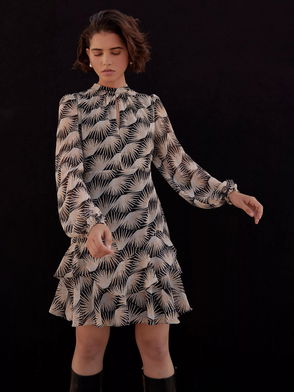 An animal print dress in a mini silhouette, N-neckline, ruffle detailing, long layered ruffle sleeves, elasticated cuffs, tiered ruffle hemline with a button fastening through the front.