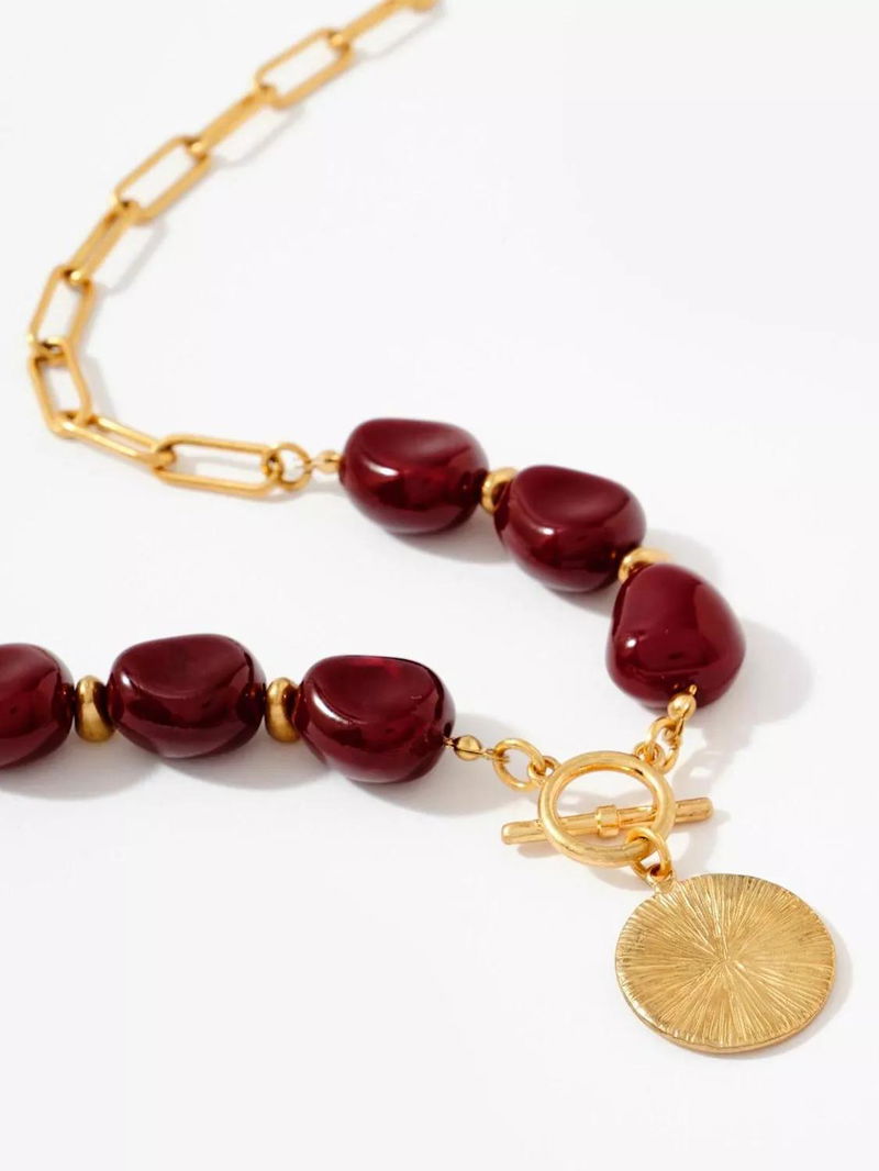 Beaded Coin T-Bar Necklace, Gold/Burgundy