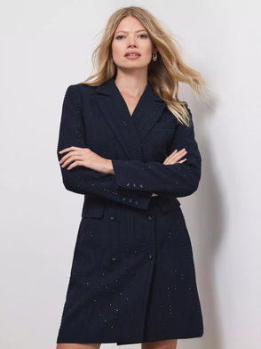 A blazer mini dress with a fringed lapel collar, long sleeves, buttoned cuffs, and welt pockets with fastenings through the front.