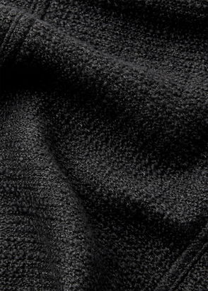 A boucle jacket featuring a crew neckline, square pockets, long sleeves, contrast stitch trim with a zip fastening through the front.