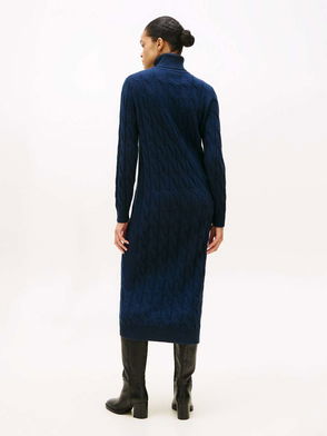 A knit mini dress featuring a high neckline, long sleeves with appliqué bow detailing.