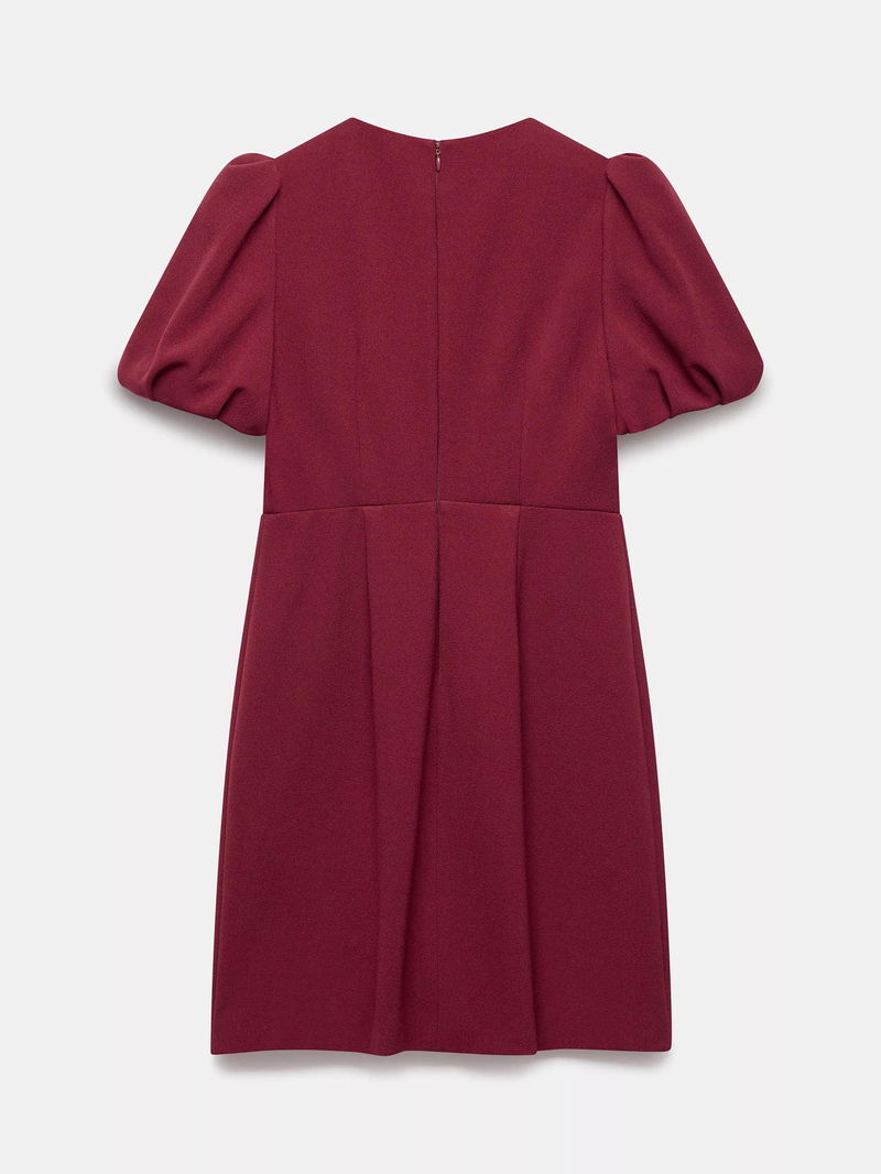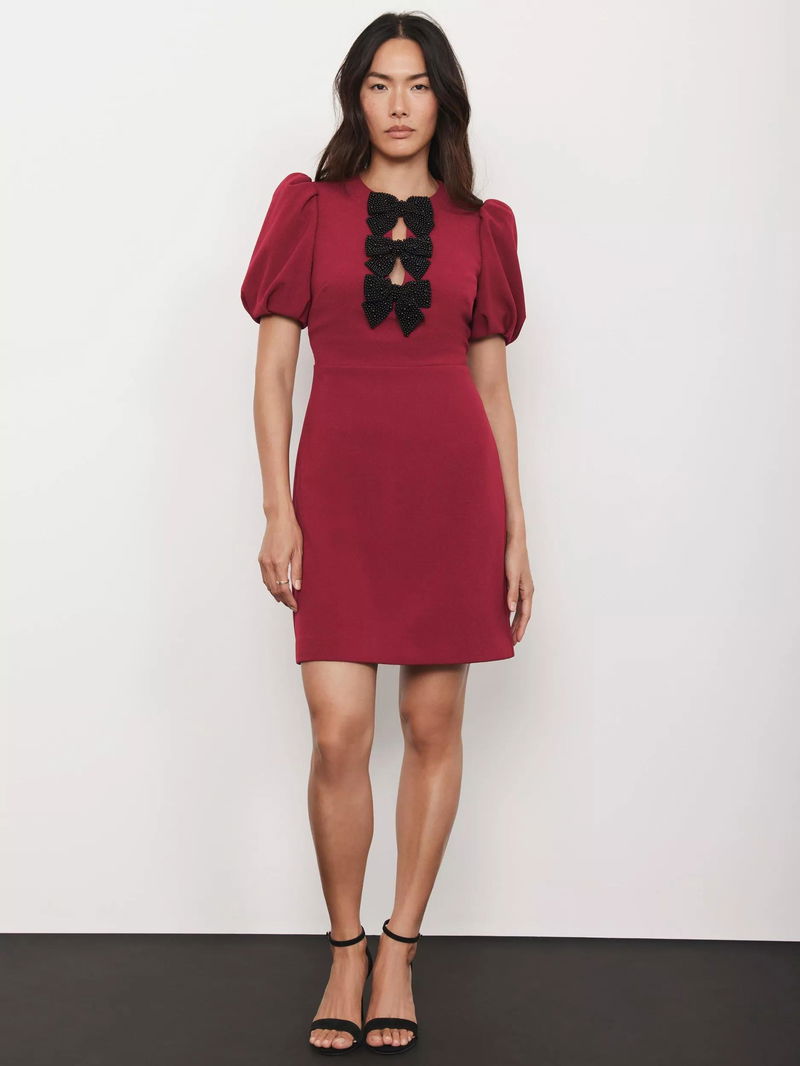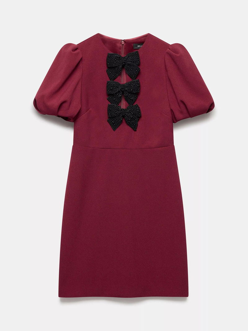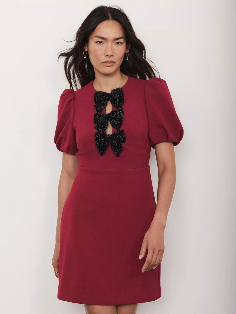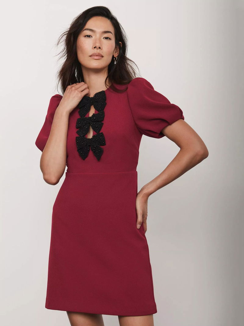 This short puff sleeved mini dress from Mint Velvet has a crew neck with a key hole front, a beaded bow detailing, and a zip fastening through the back.