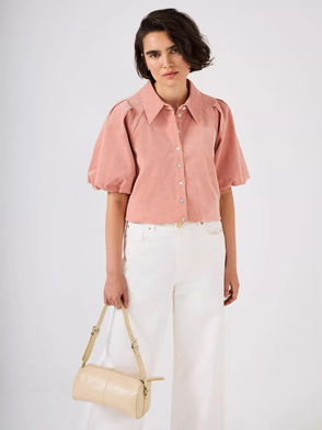 A cotton-rich top with an open V-neckline, short puff sleeves and button fastenings through the front.