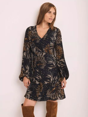 A lightweight dress in a maxi silhouette with a crew neckline, short puff sleeves, sheer V panelling, tiered hemline with a zip fastening through the back.