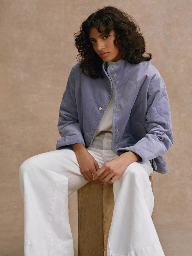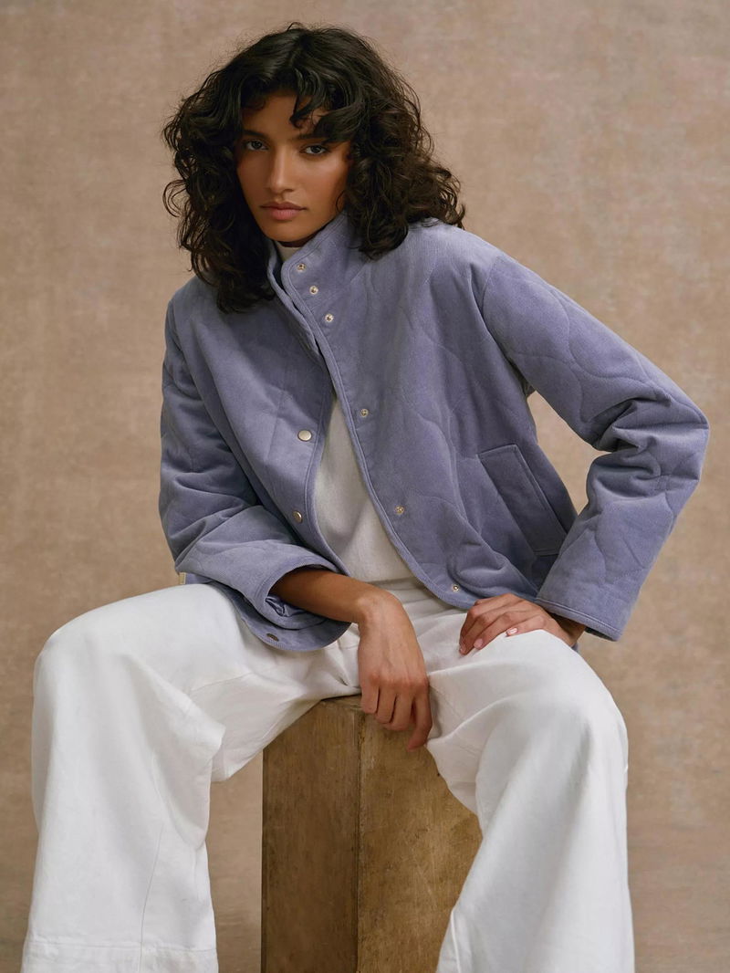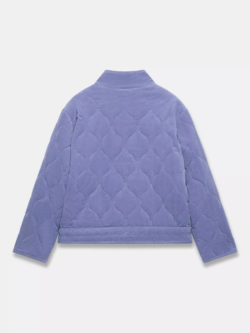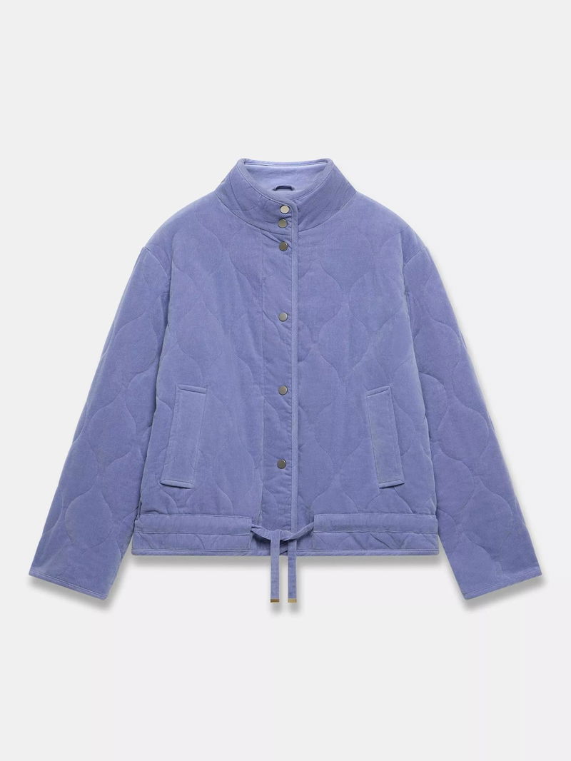 A corduroy quilted jacket featuring a high neckline, long sleeves, welt pockets, drawstring waistband with a concealed zip and popper fastening through the front.