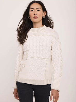 Neutral tone jumper with a crew neckline, long sleeves featuring a cherry motif across the front.