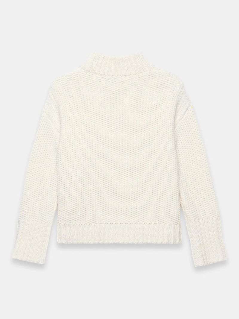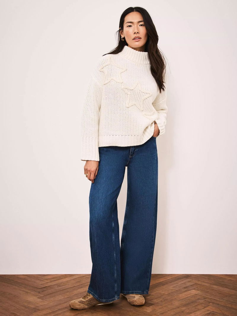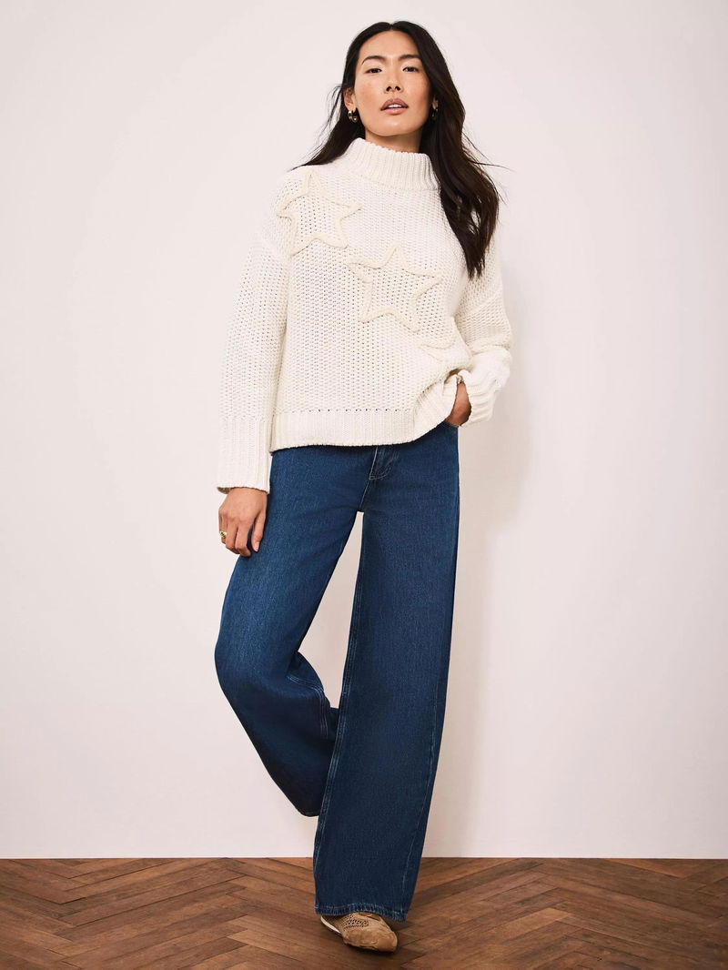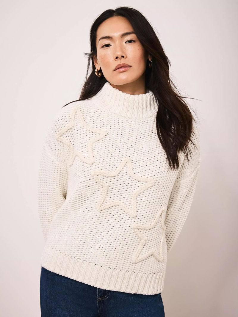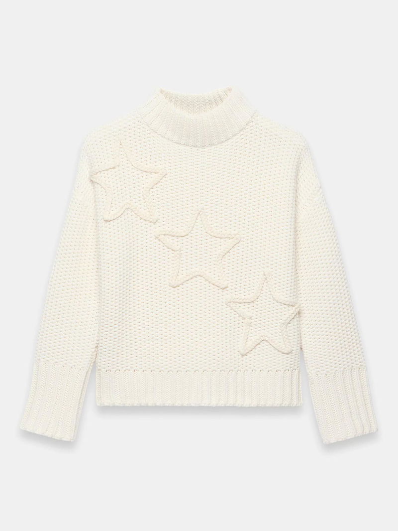 White chunky knit jumper featuring a high neckline, long sleeves and triple star detailing across the front.